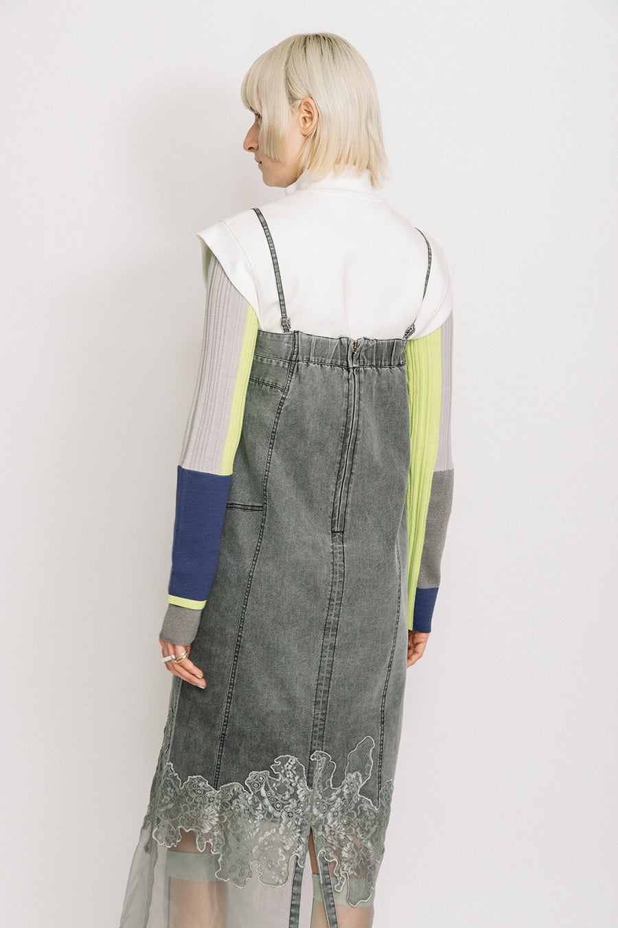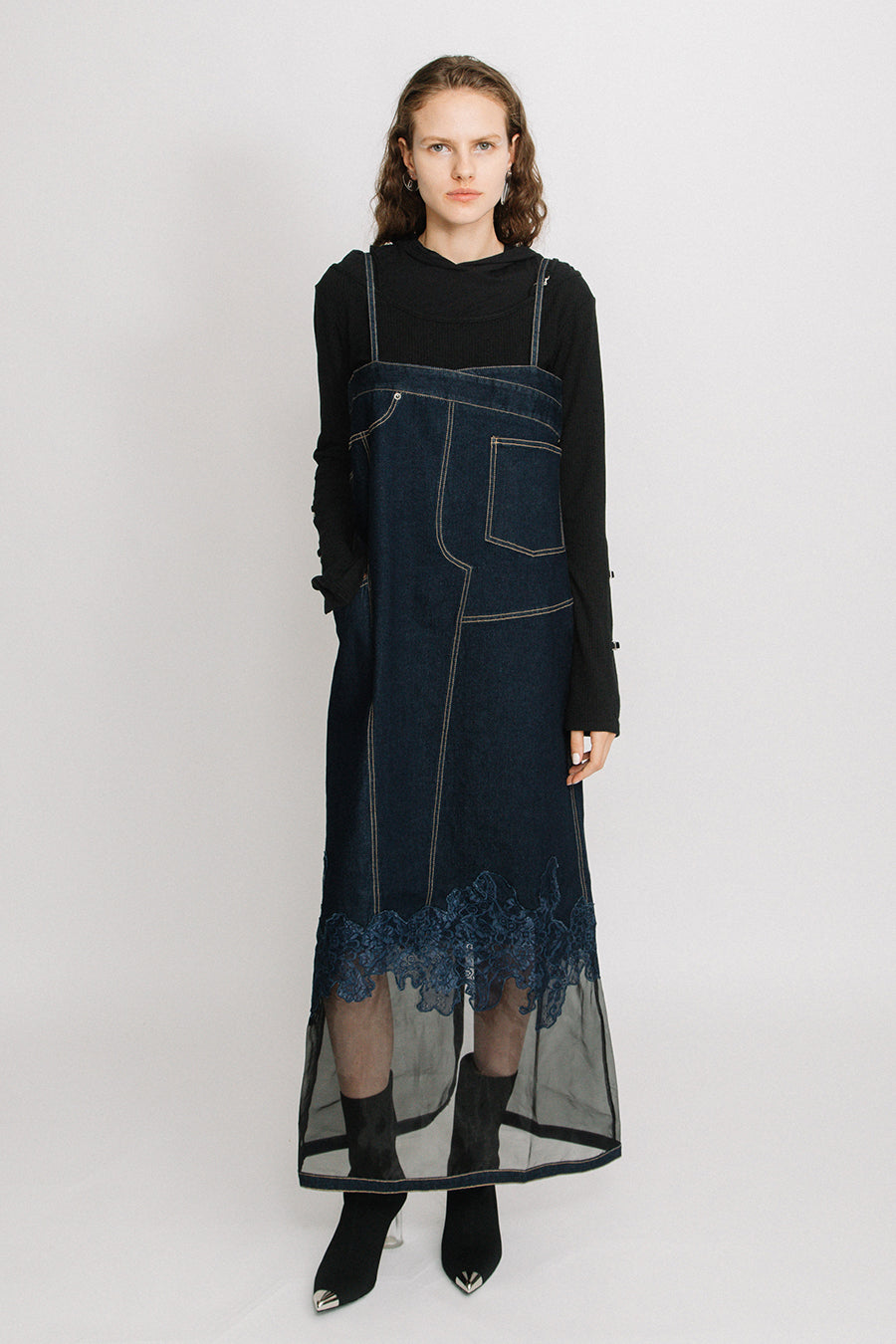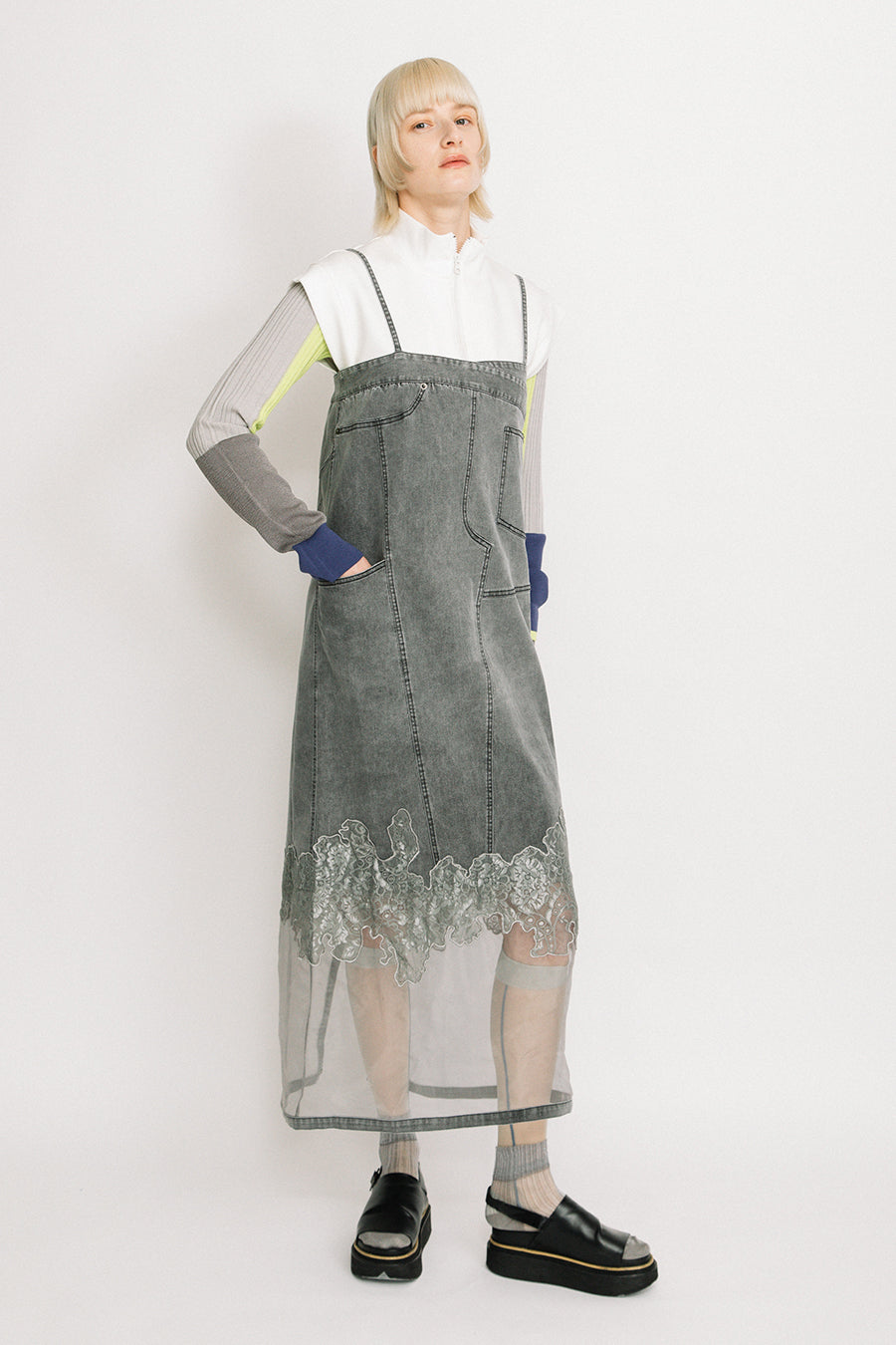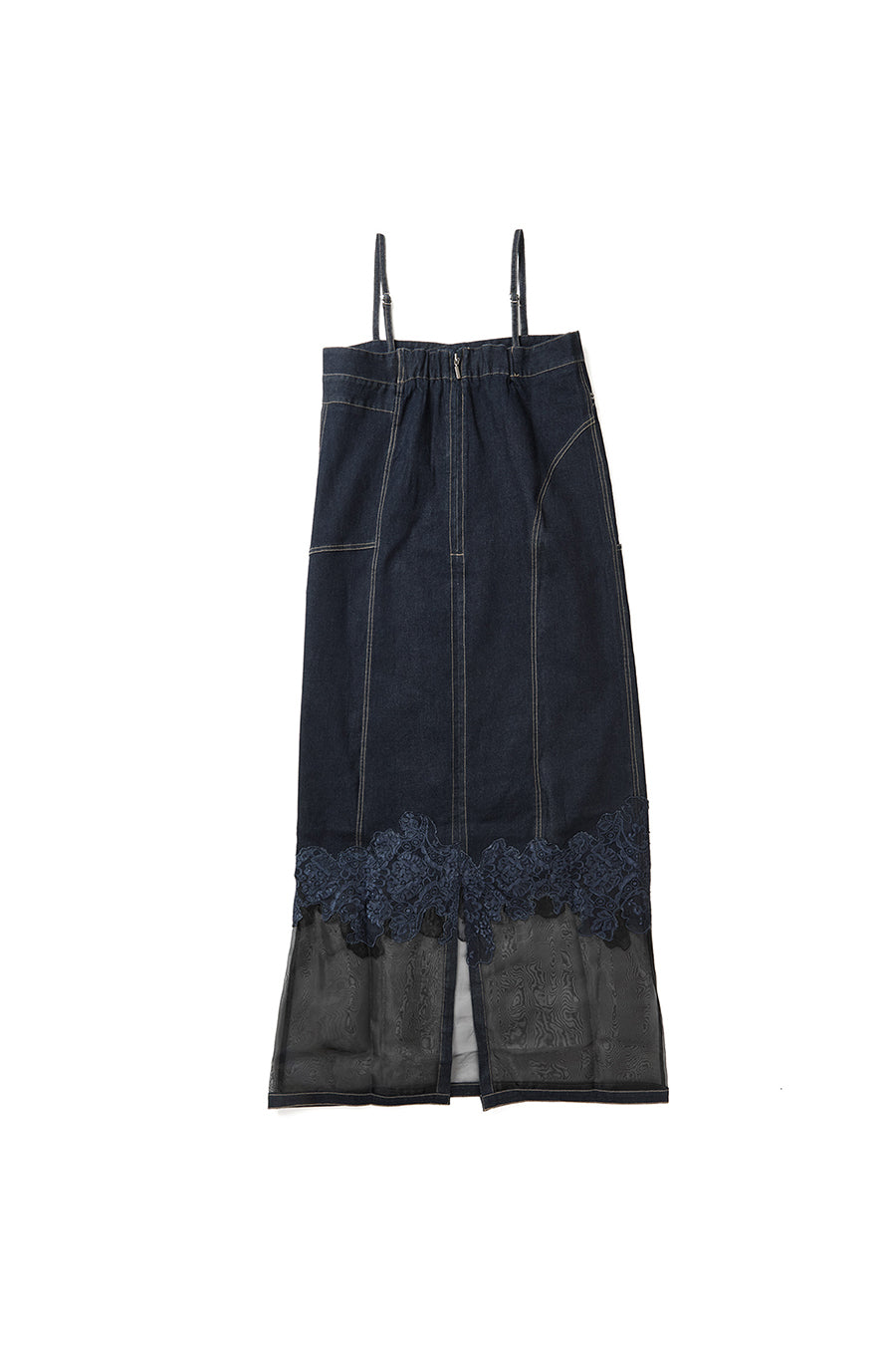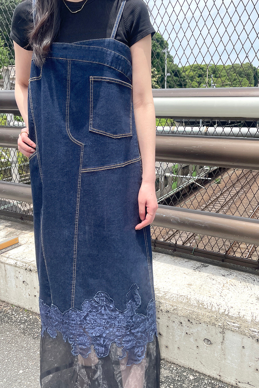 ストレッチ性のあるデニムと裾のパーツレースをコンビネーションしたIラインジャンパースカート。