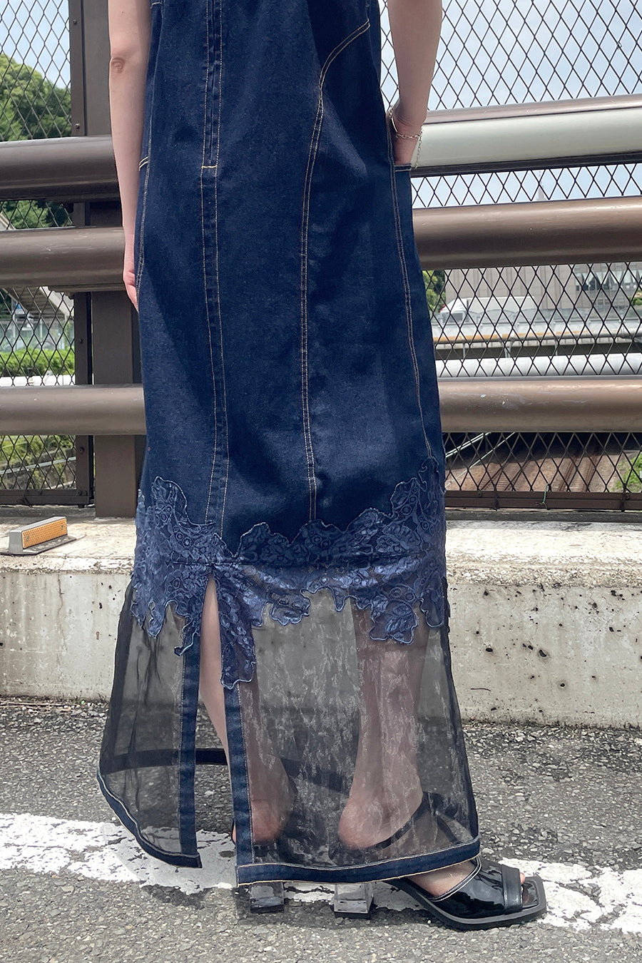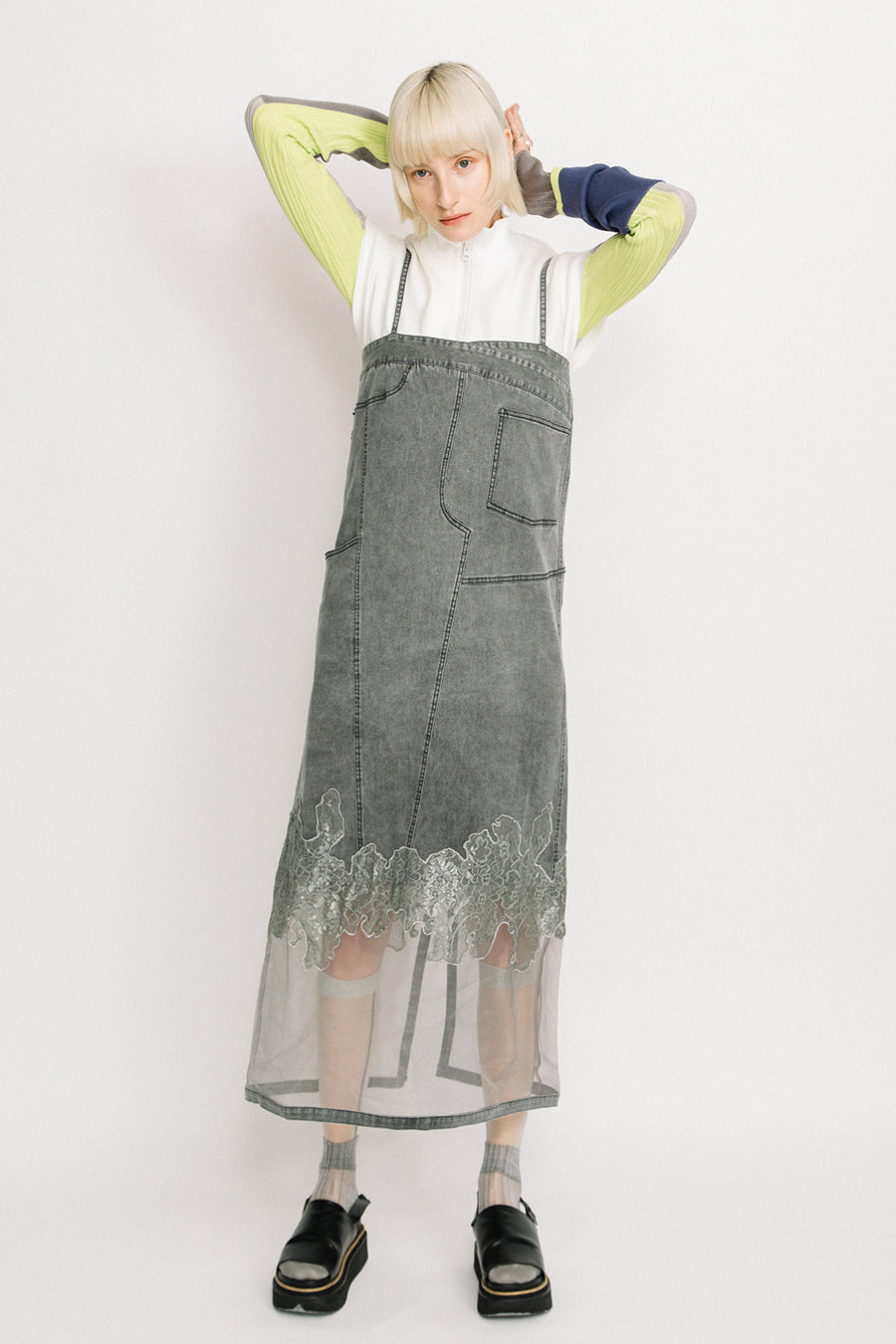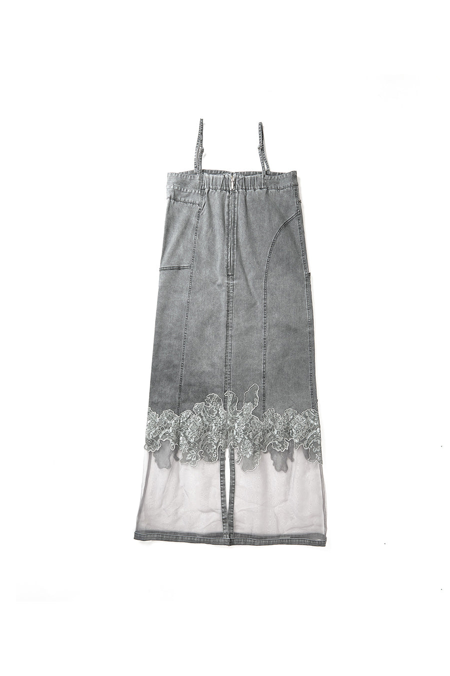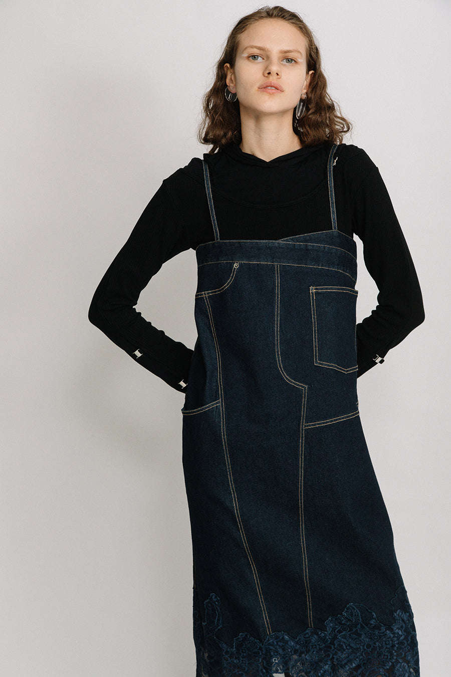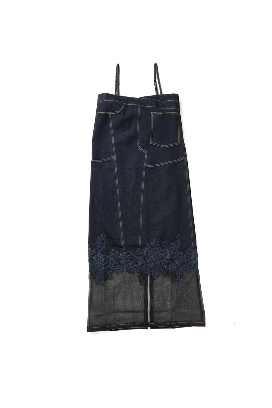 ストレッチ性のあるデニムと裾のパーツレースをコンビネーションしたIラインジャンパースカート。