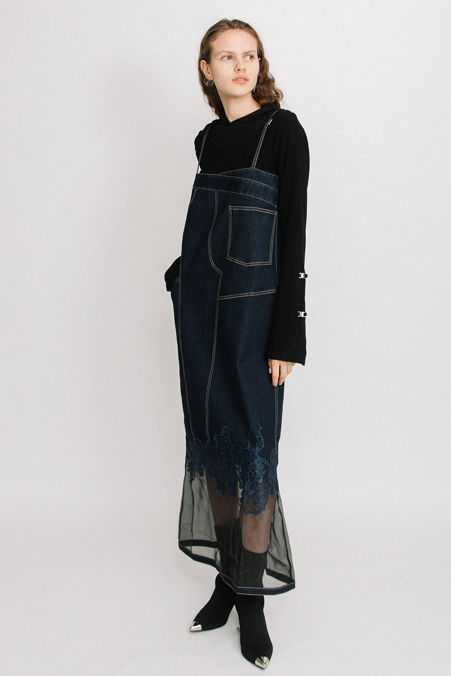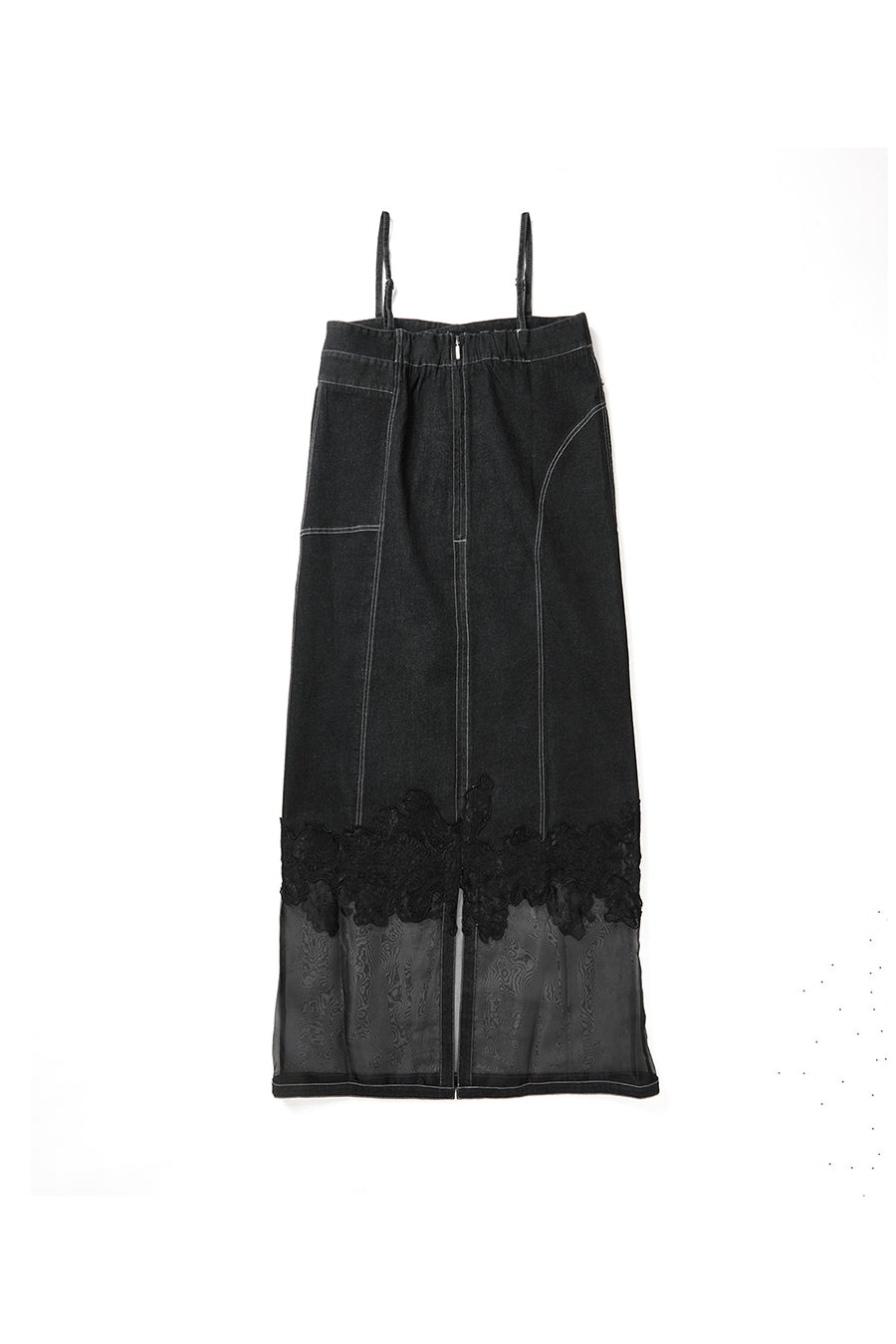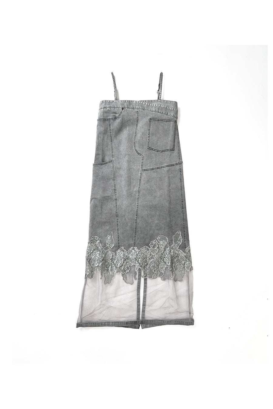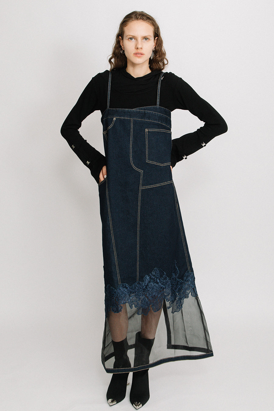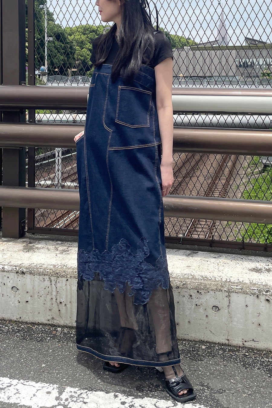 ストレッチ性のあるデニムと裾のパーツレースをコンビネーションしたIラインジャンパースカート。