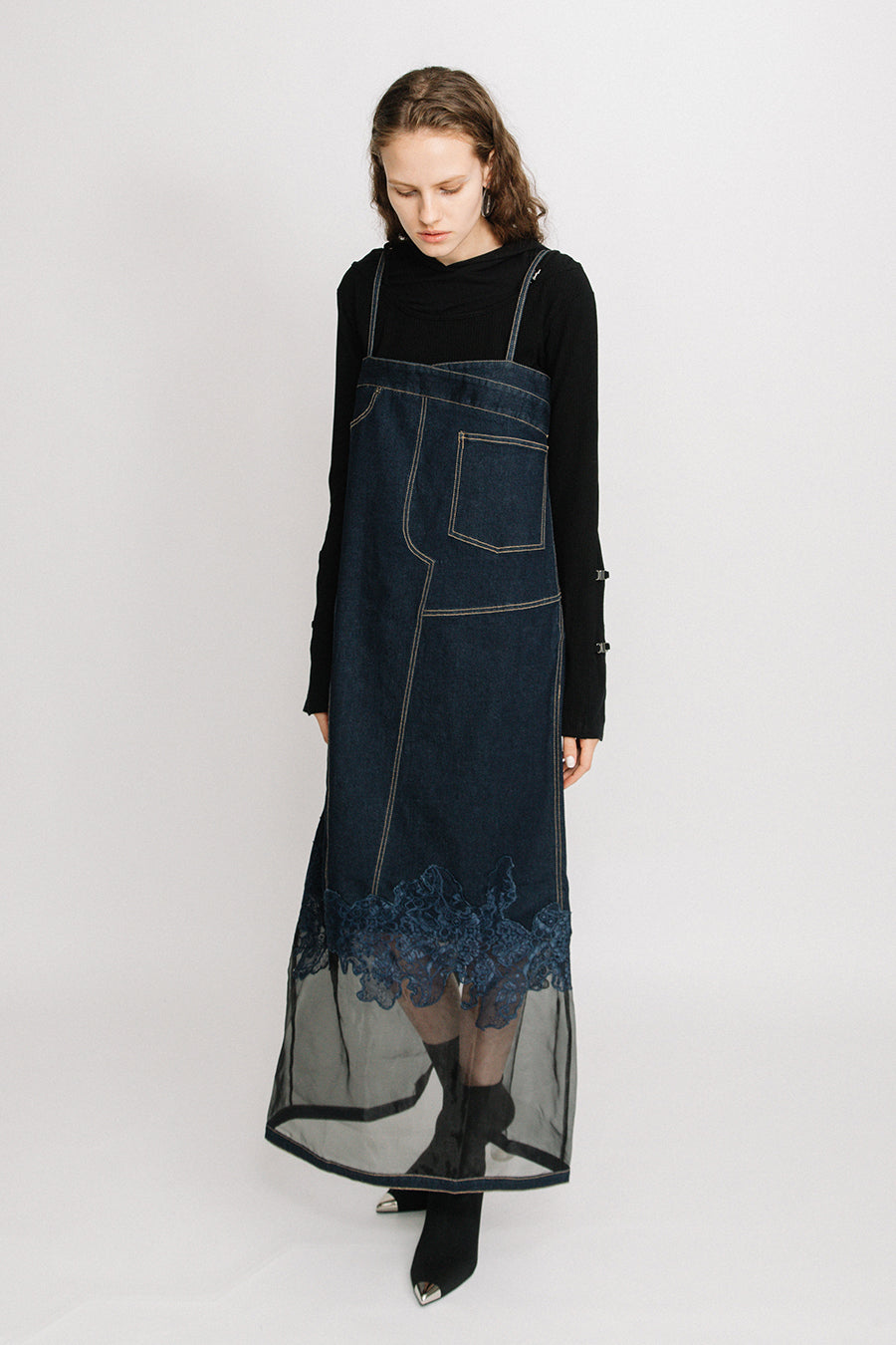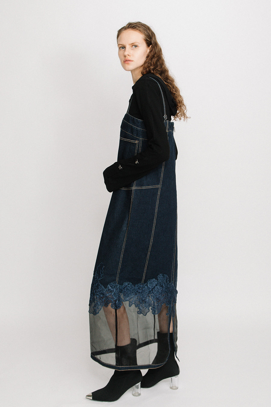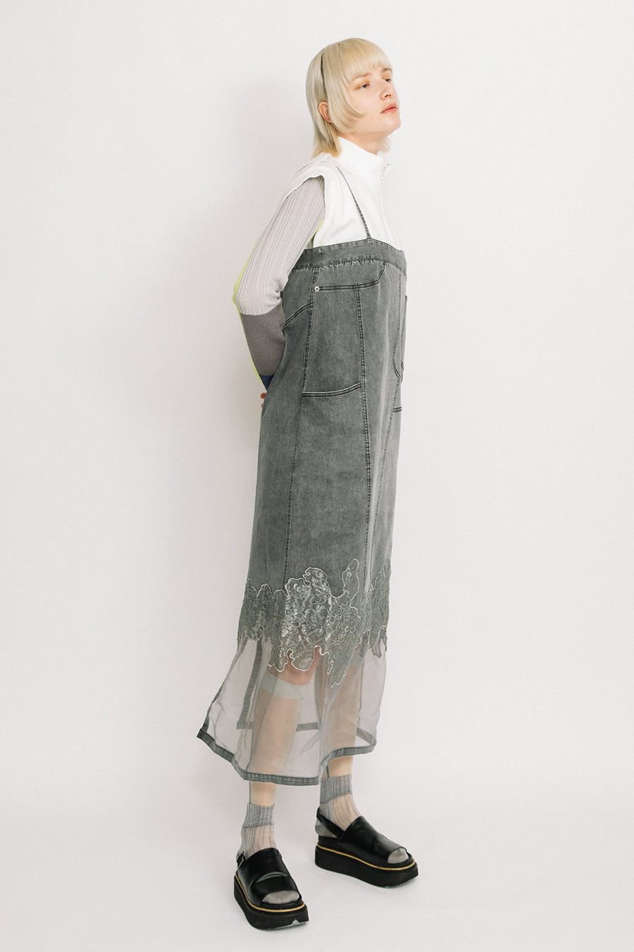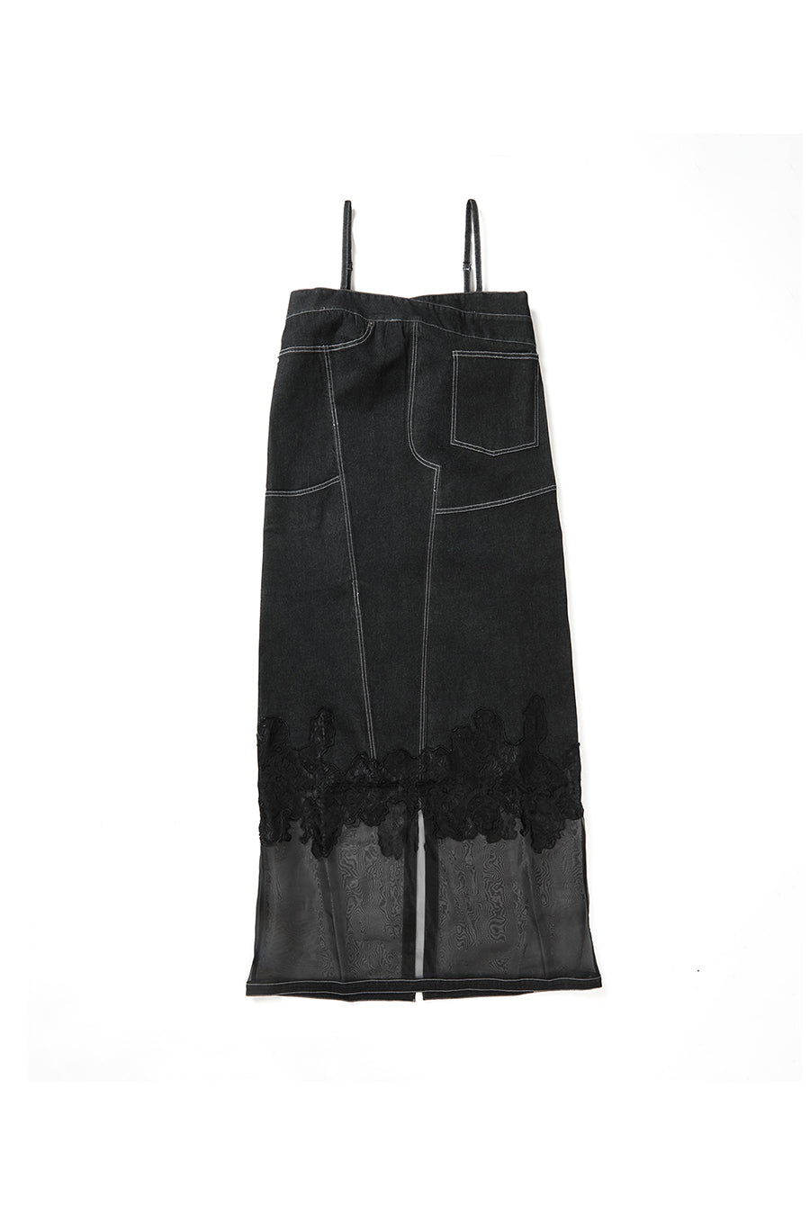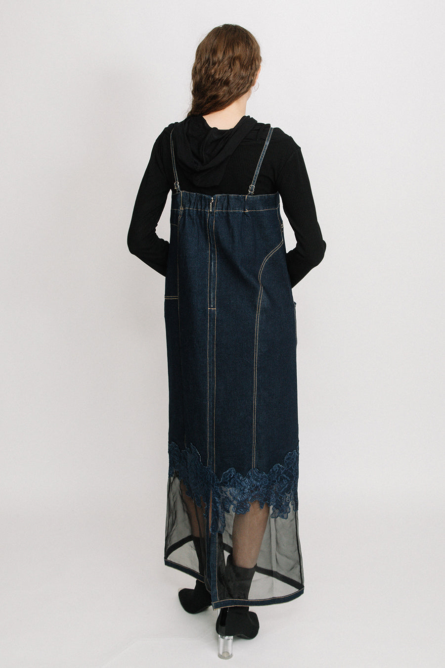 ストレッチ性のあるデニムと裾のパーツレースをコンビネーションしたIラインジャンパースカート。