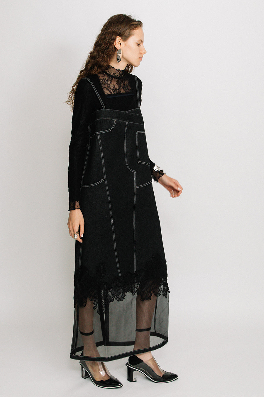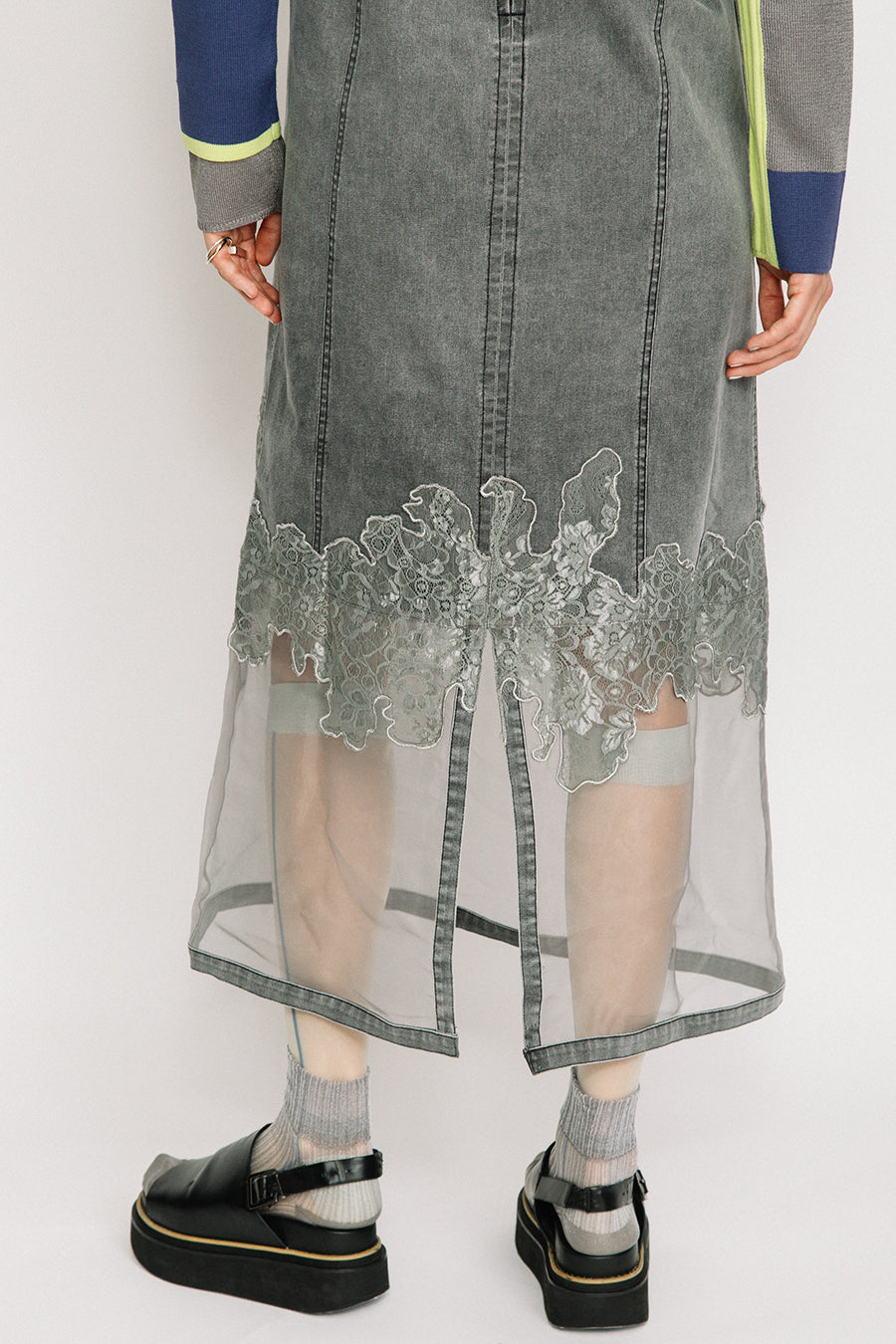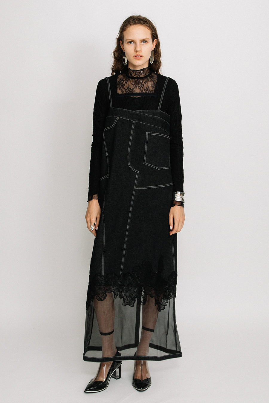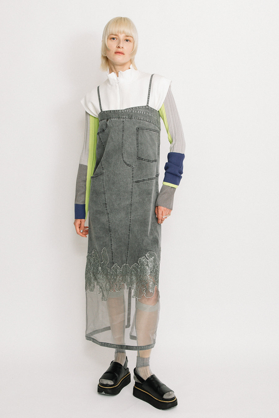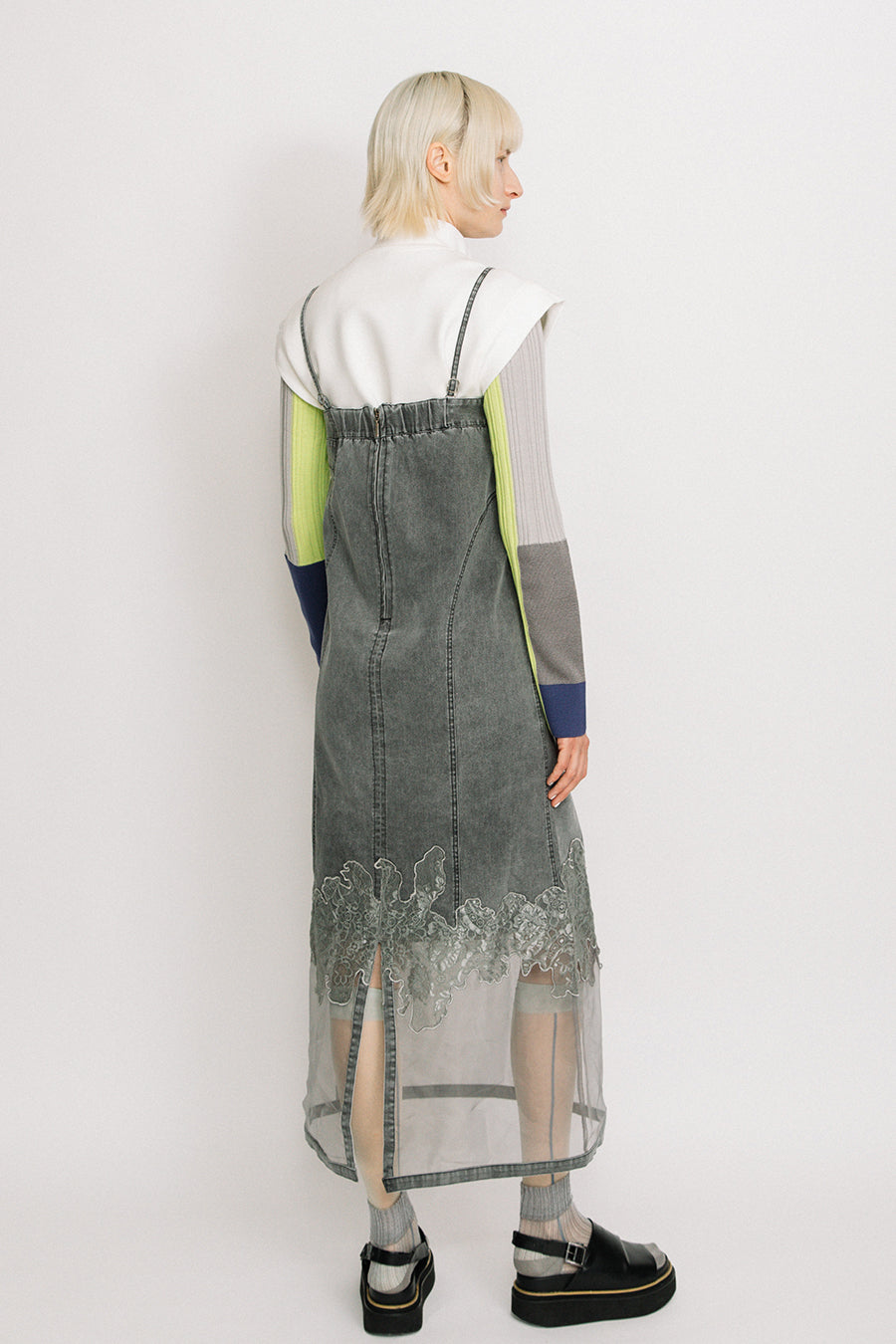 ストレッチ性のあるデニムと裾のパーツレースをコンビネーションしたIラインジャンパースカート。