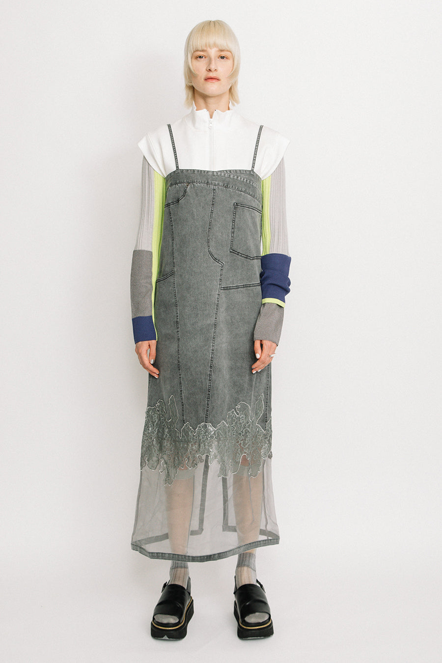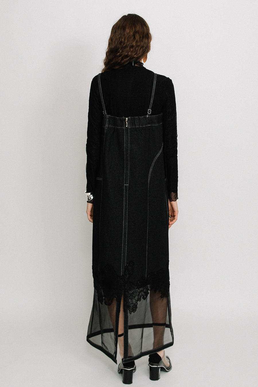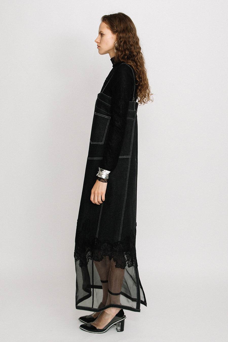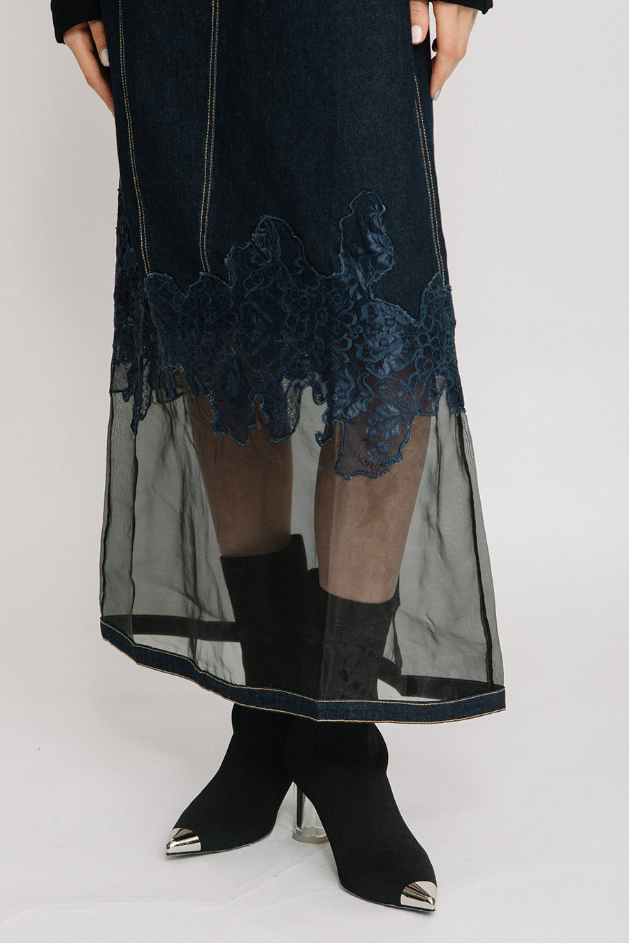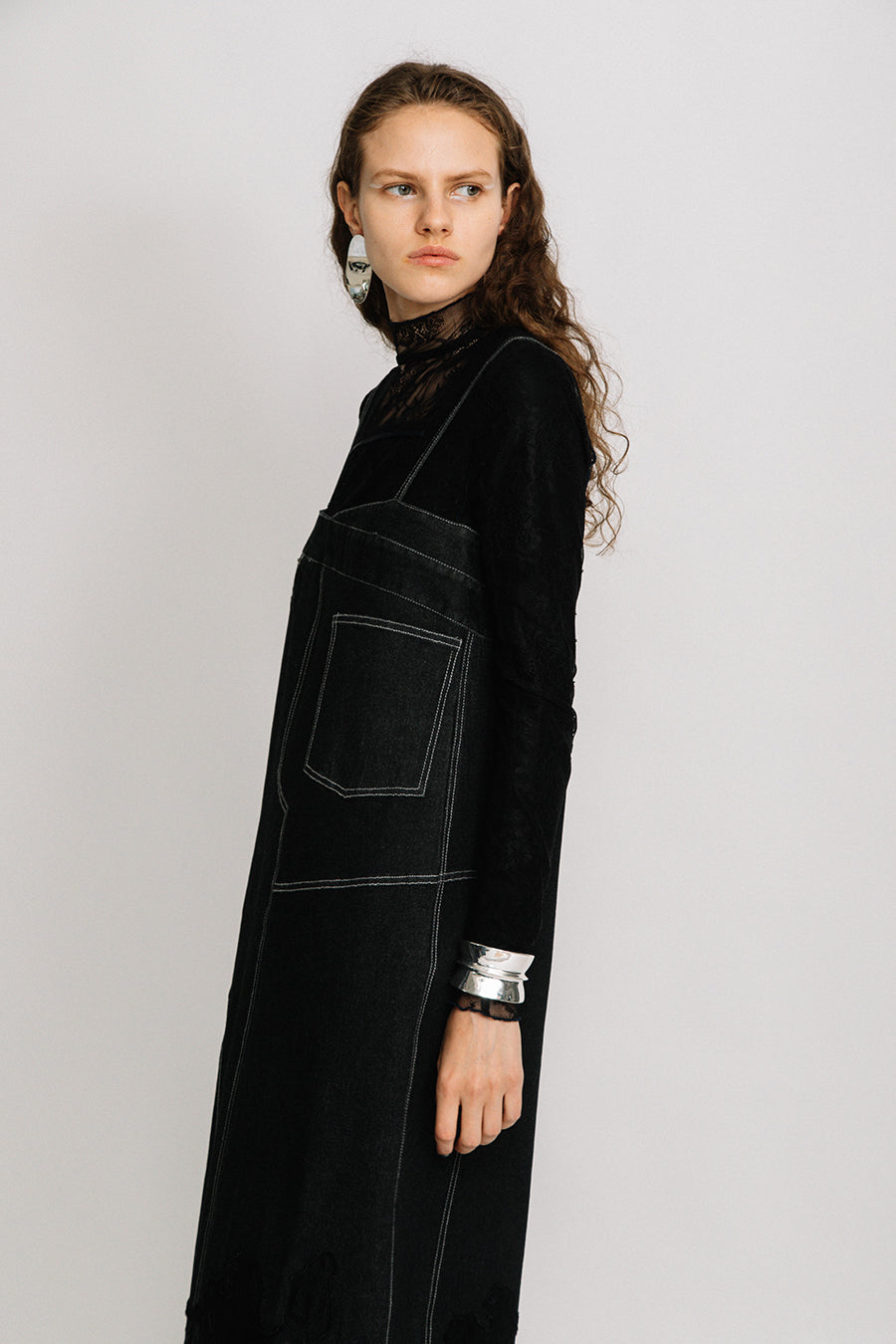 ストレッチ性のあるデニムと裾のパーツレースをコンビネーションしたIラインジャンパースカート。
