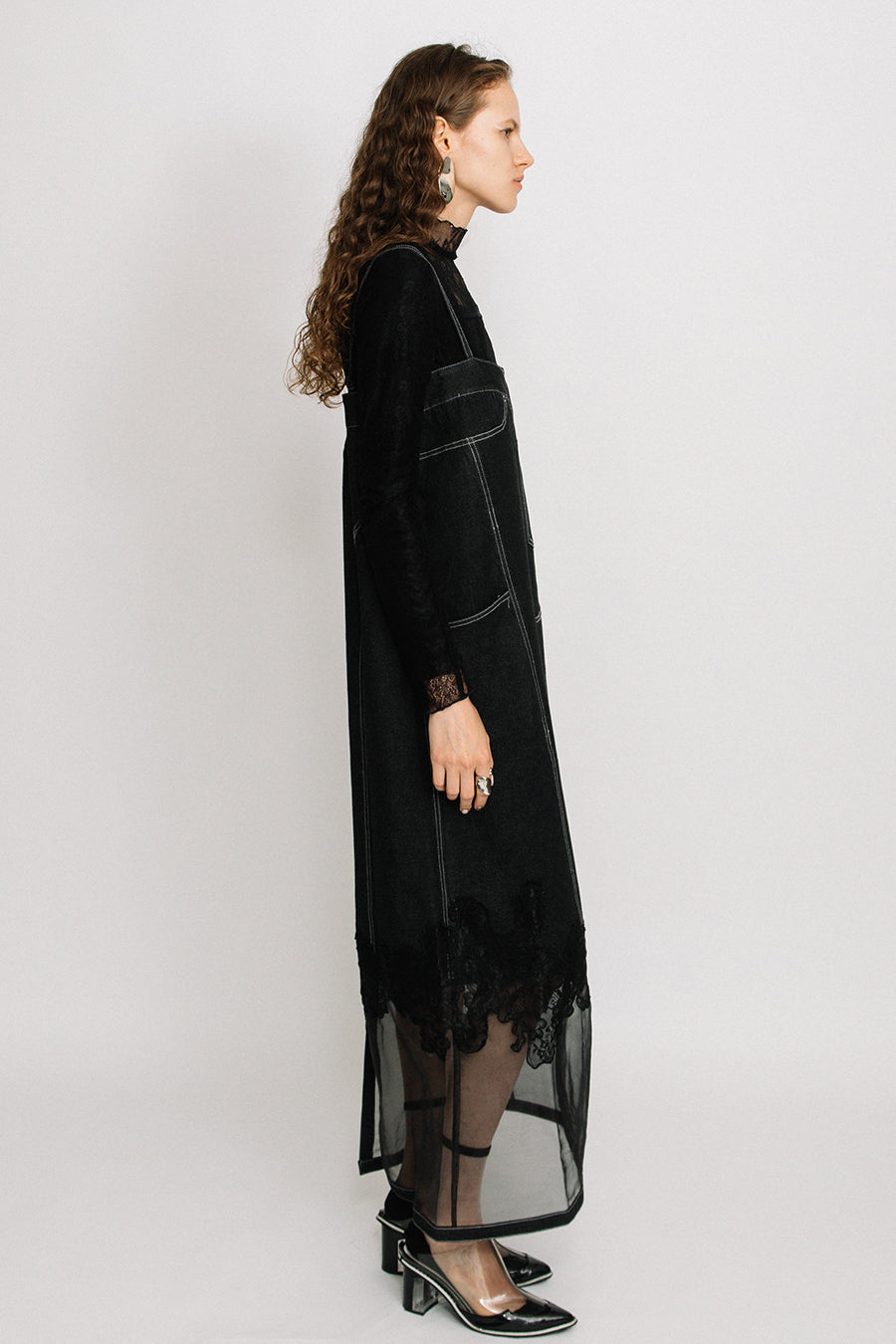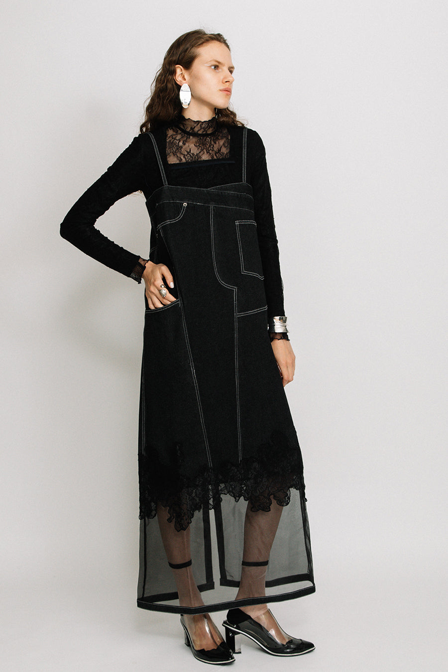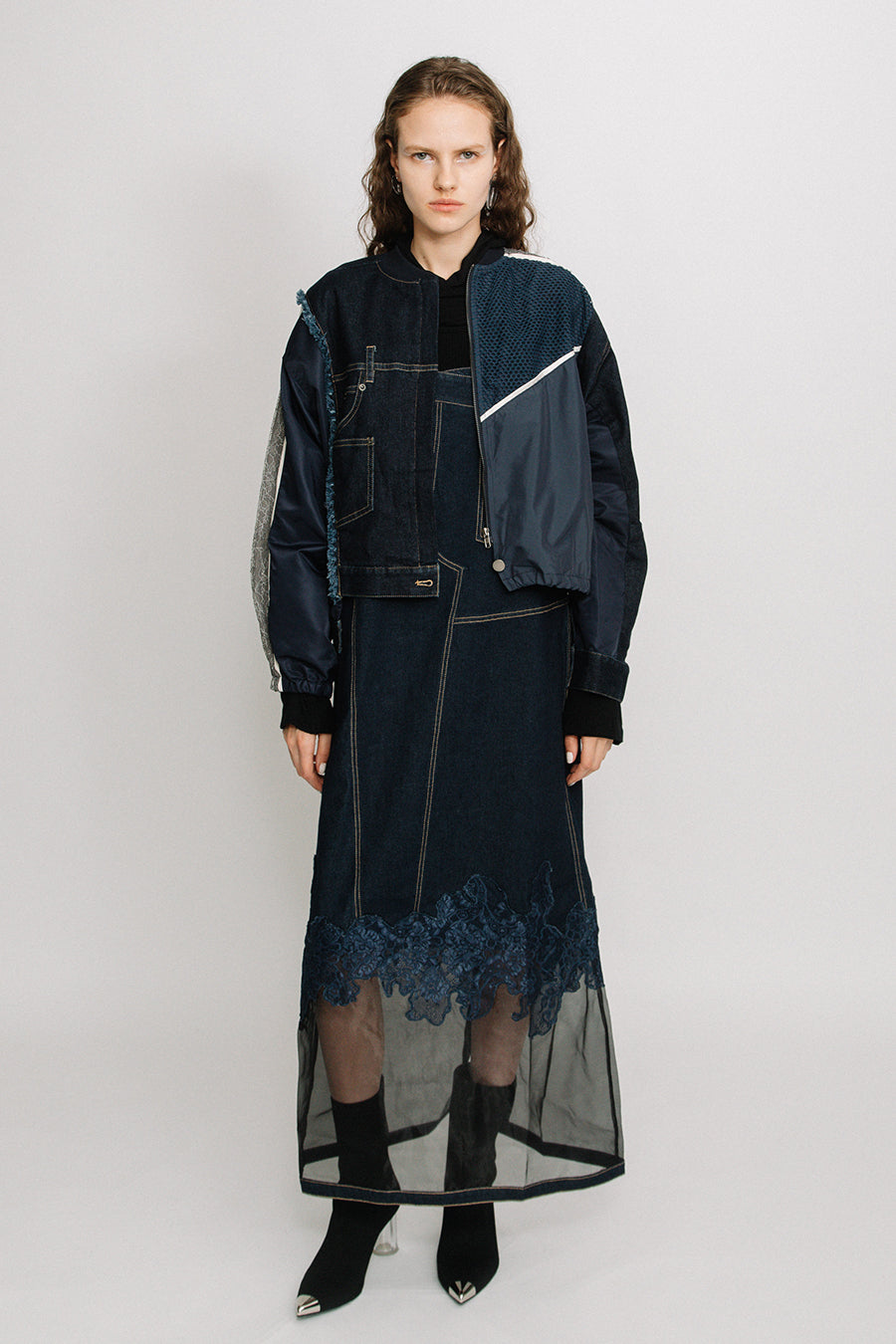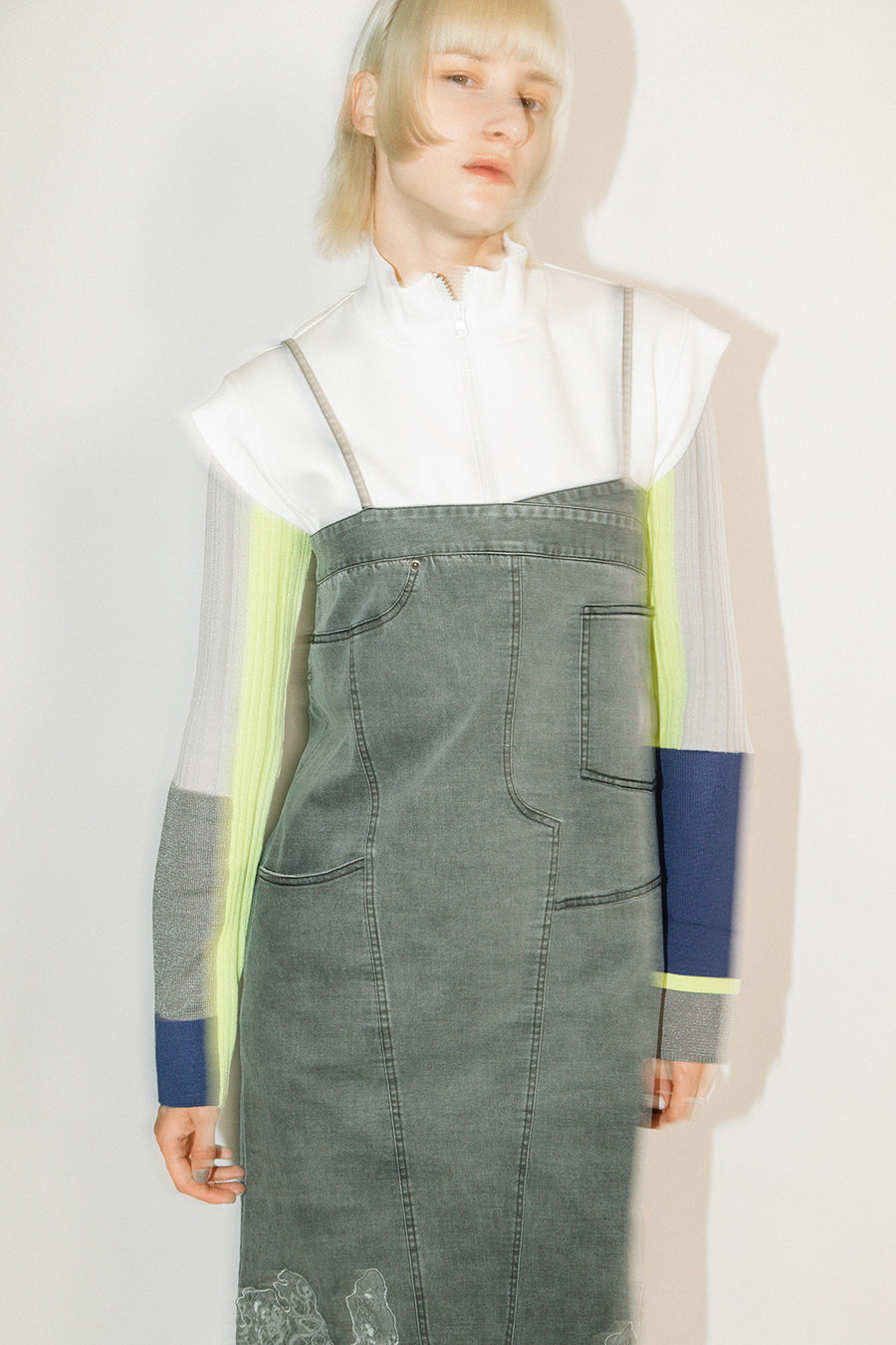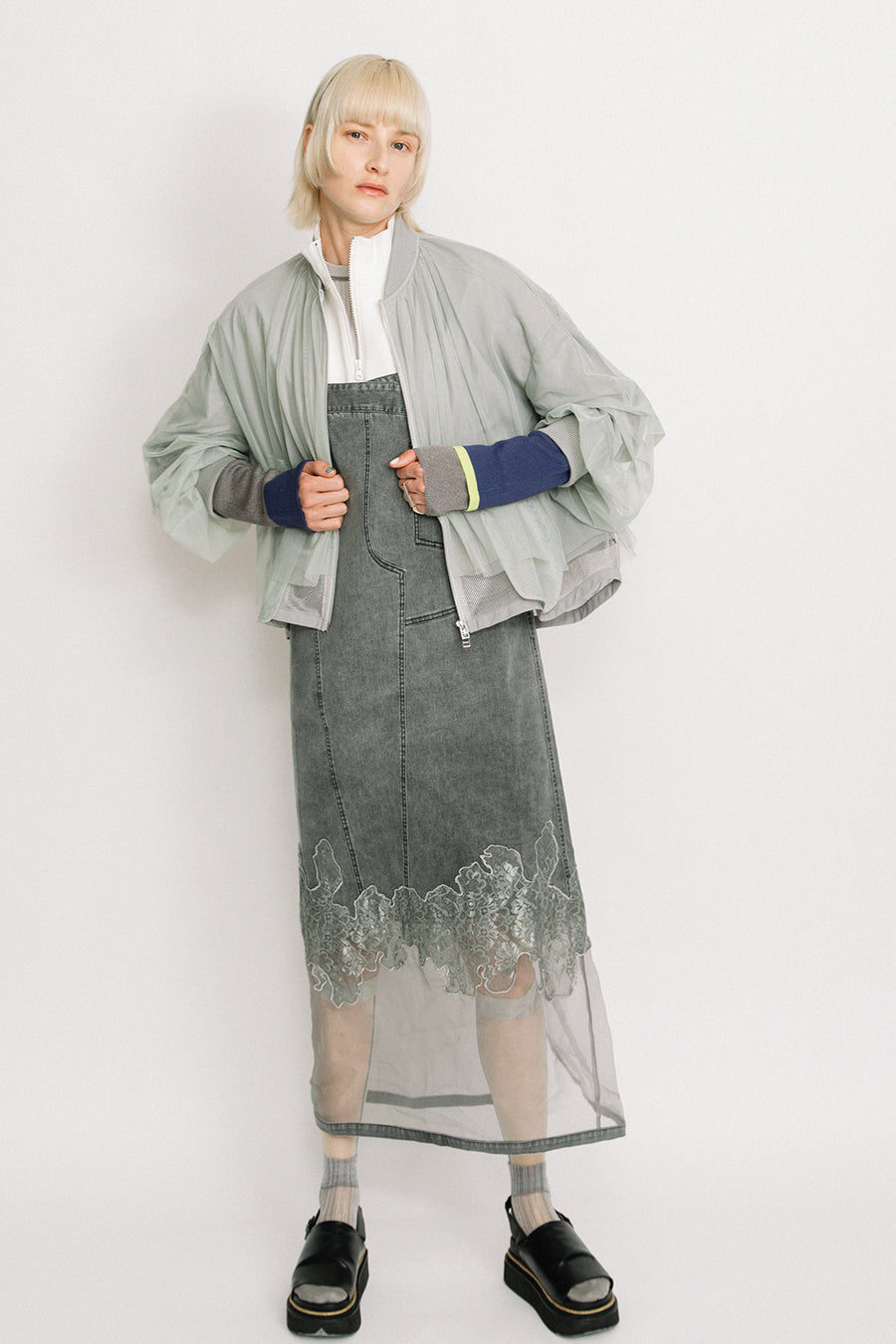 ストレッチ性のあるデニムと裾のパーツレースをコンビネーションしたIラインジャンパースカート。