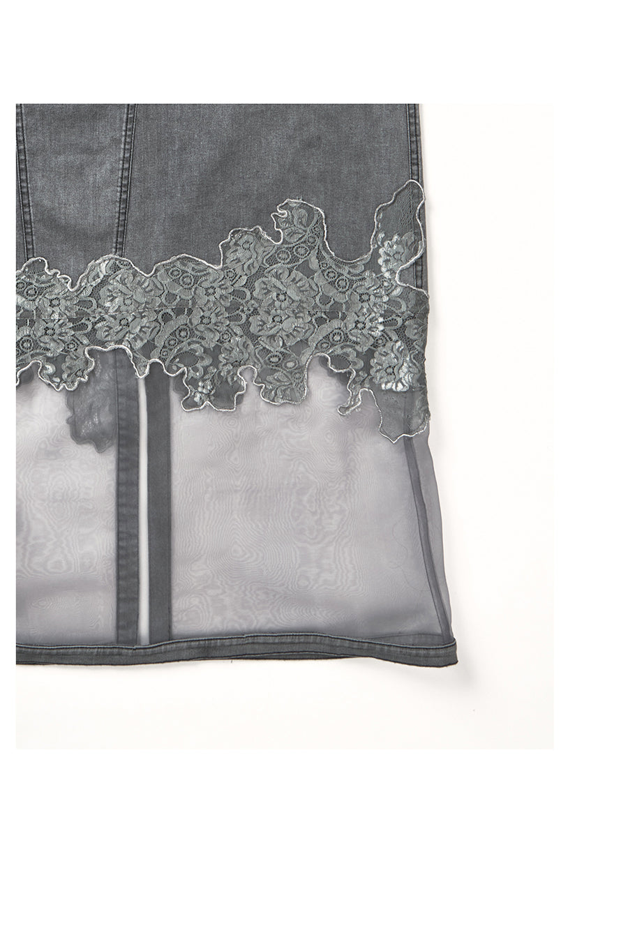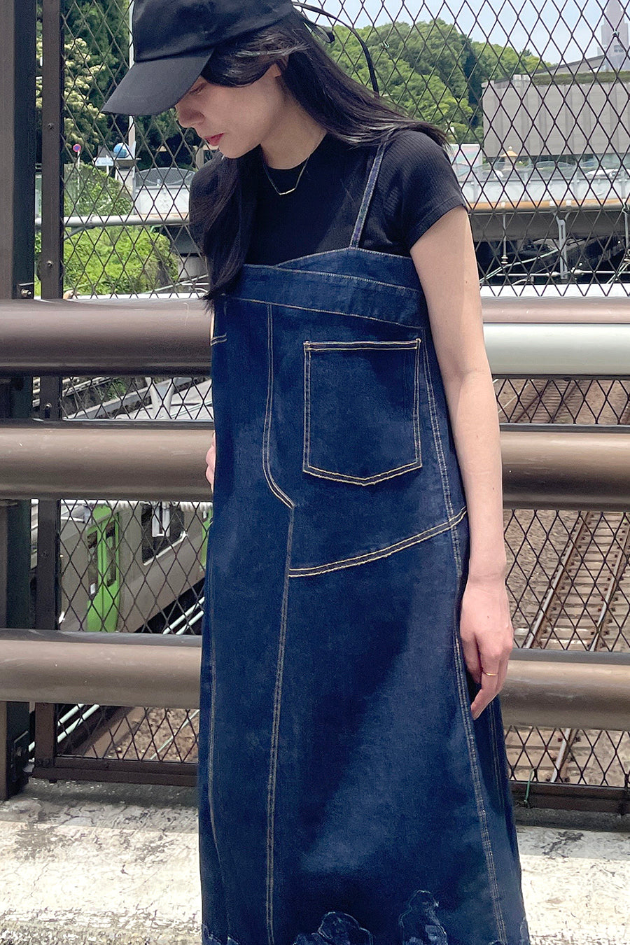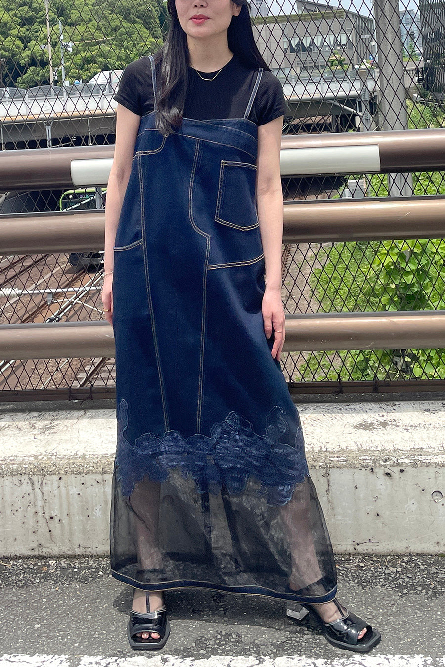 後ろゴム仕様でバストまわりにフィット、裾には繊細な花柄のパーツレースとオーガンジーを重ね、レディライクな印象に。華やかなパーツレースによってカジュアルなデニムもラグジュアリーな雰囲気に仕上げた他にはないアイテム。