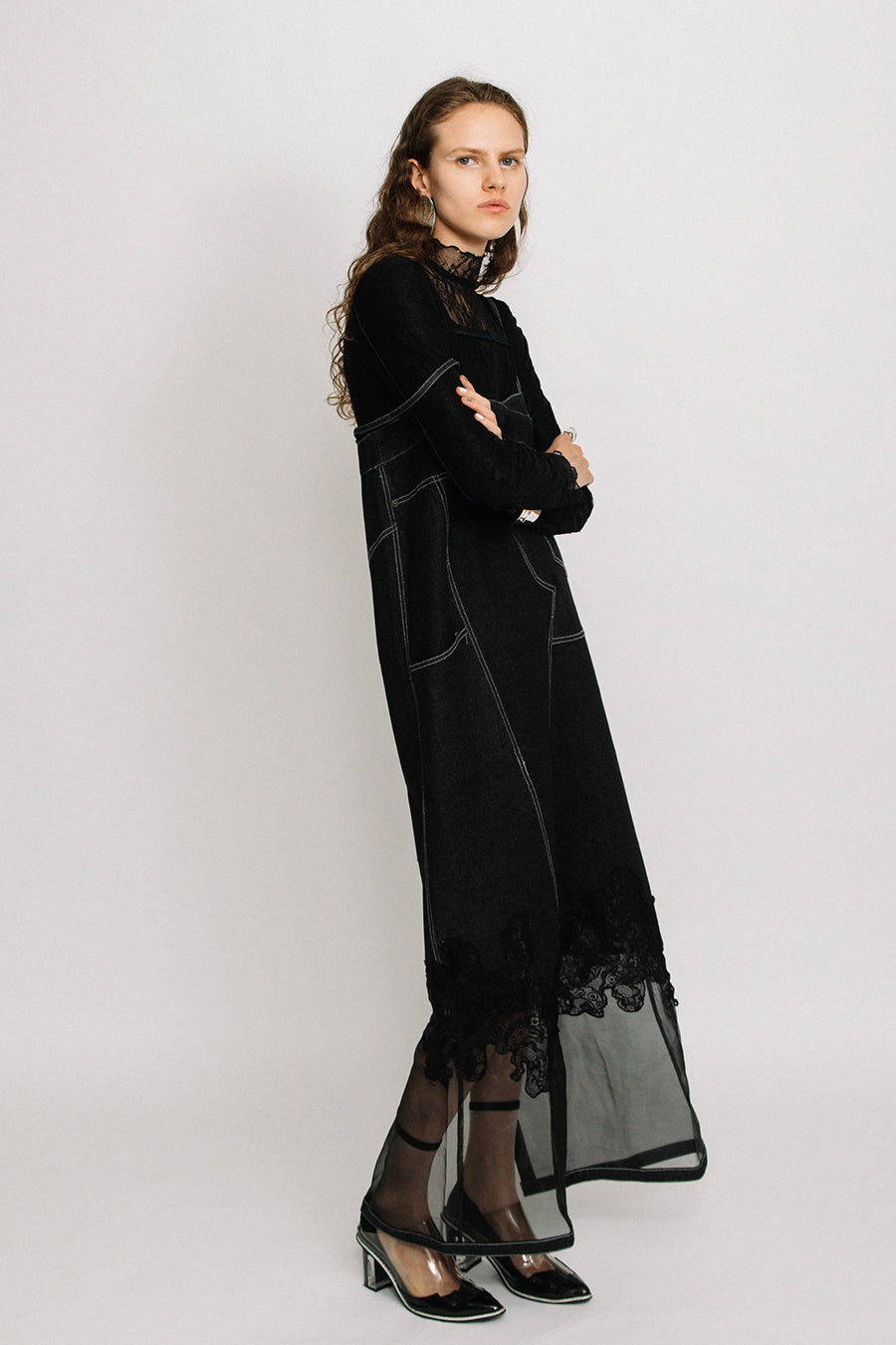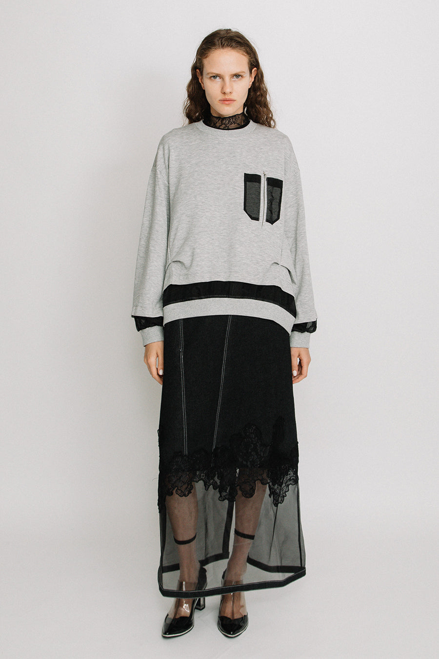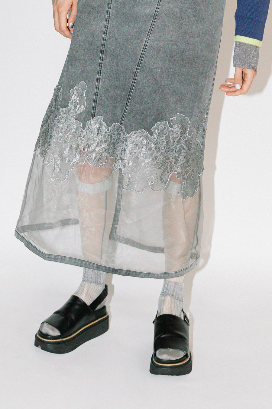 後ろゴム仕様でバストまわりにフィット、裾には繊細な花柄のパーツレースとオーガンジーを重ね、レディライクな印象に。華やかなパーツレースによってカジュアルなデニムもラグジュアリーな雰囲気に仕上げた他にはないアイテム。