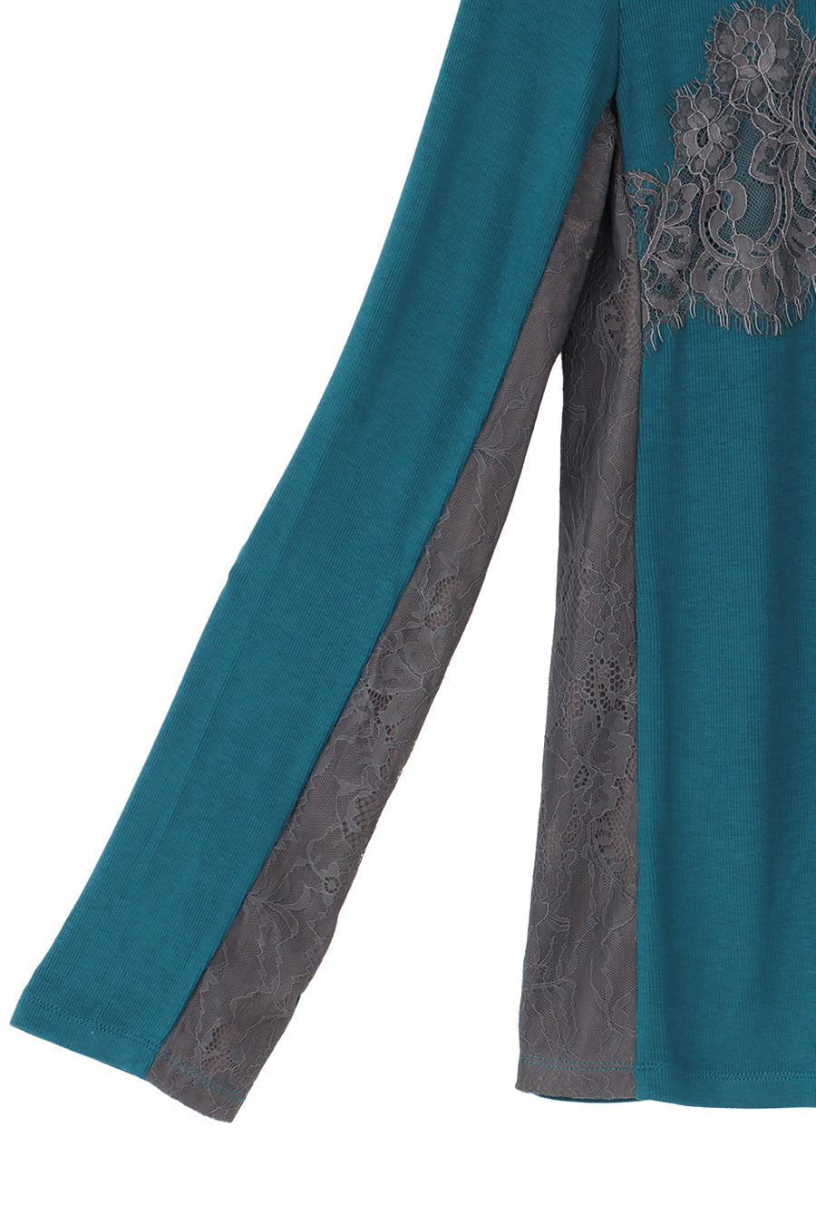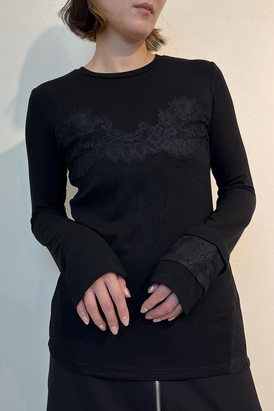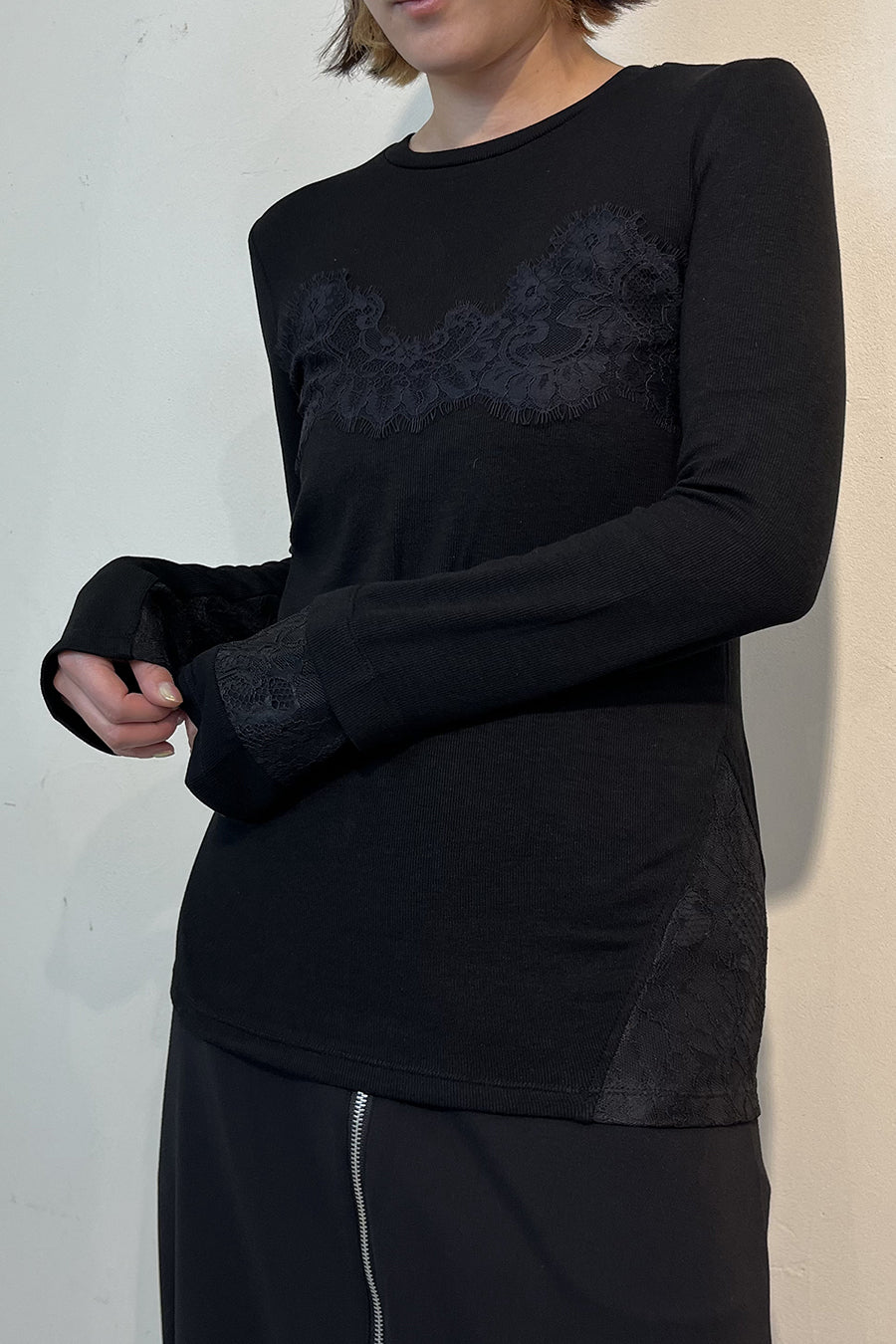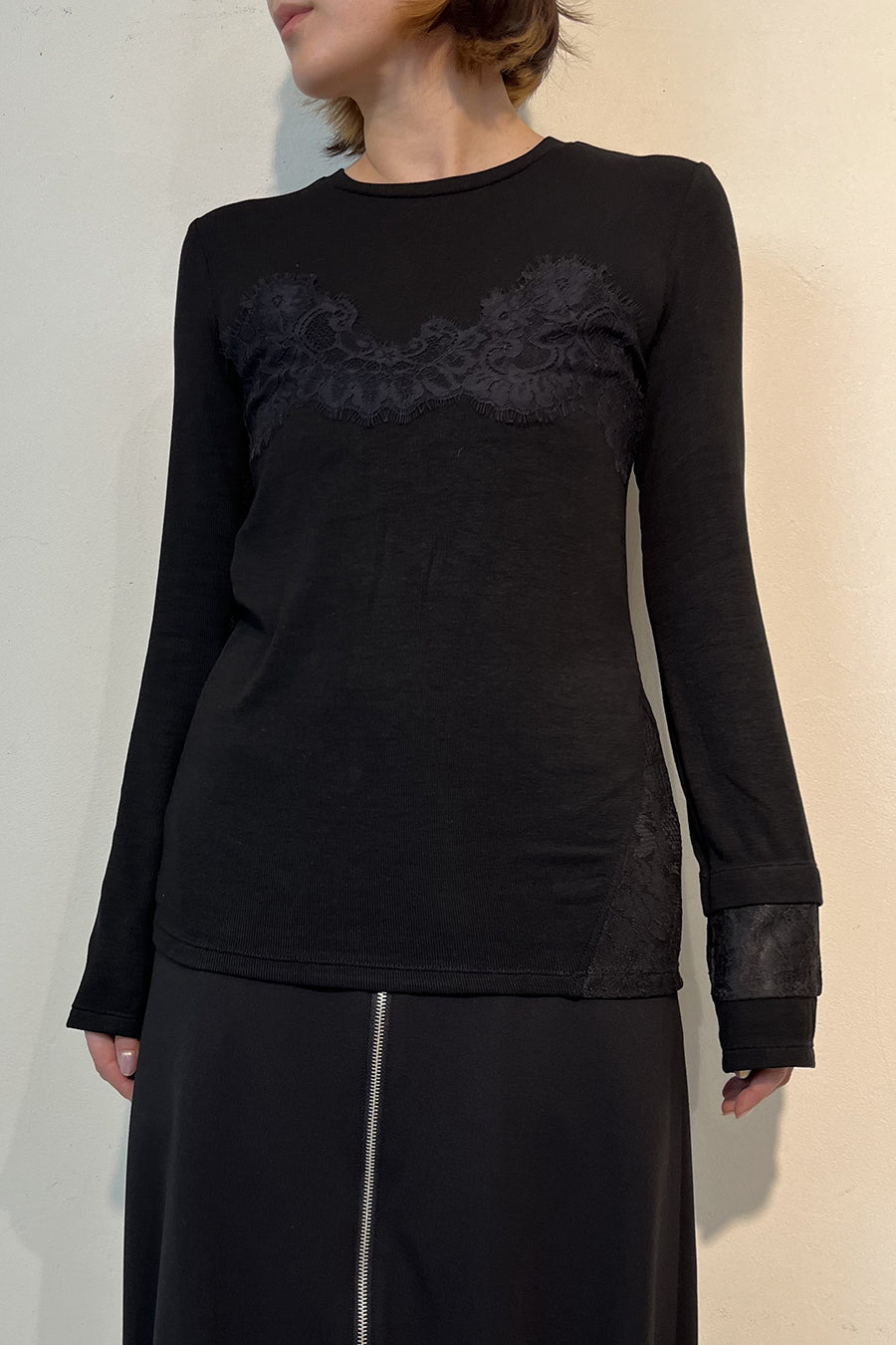 繊細なレースを脇や袖口に左右アシンメトリーでさりげなく切り替え、存在感がありながらもボトムを選ばす、様々なスタイリングに活躍する1枚です。