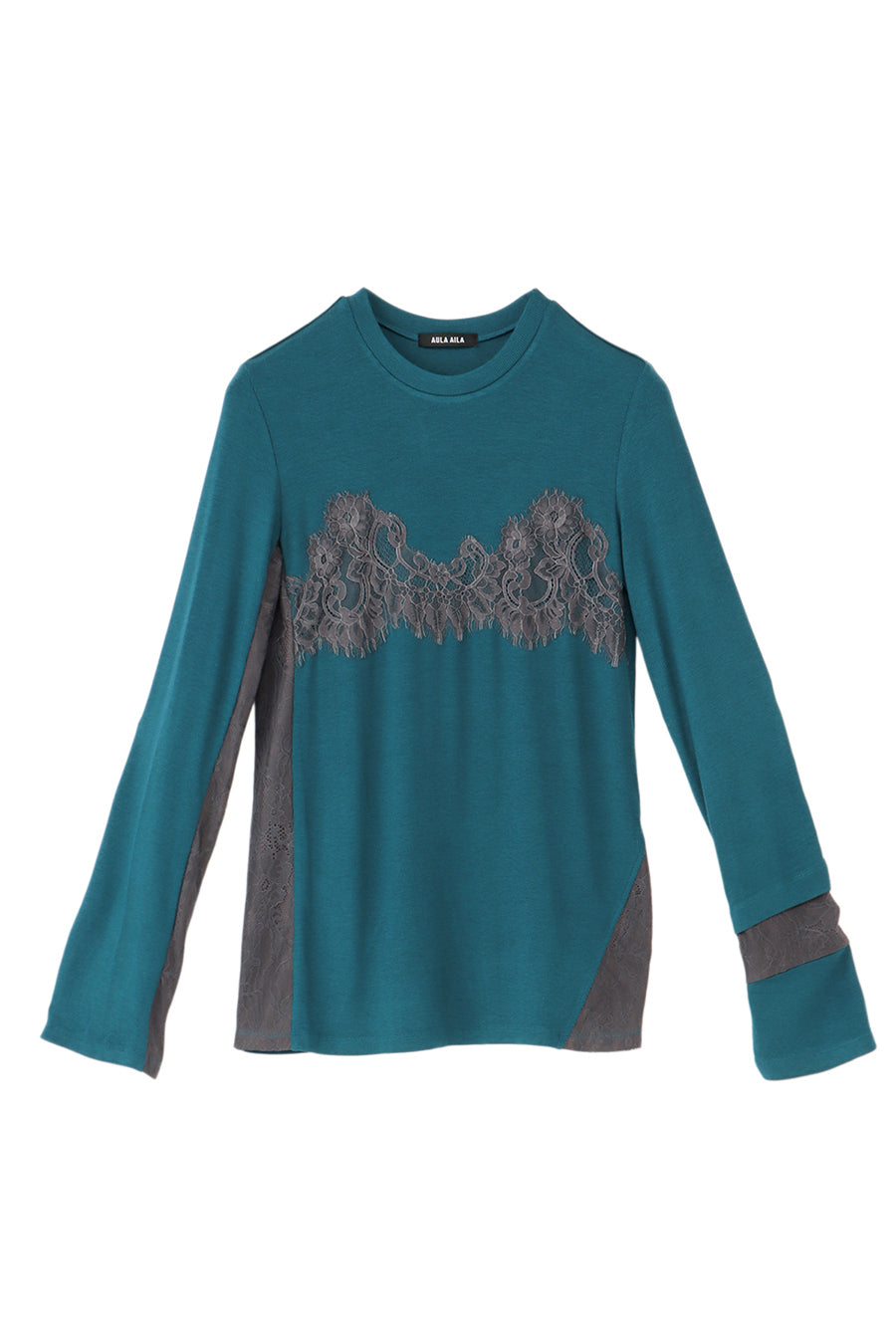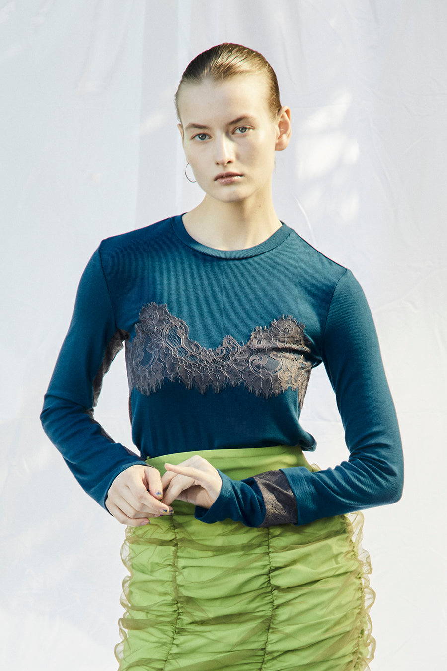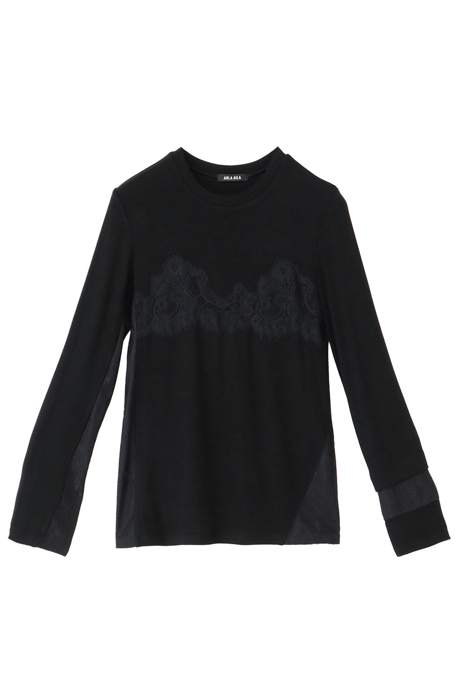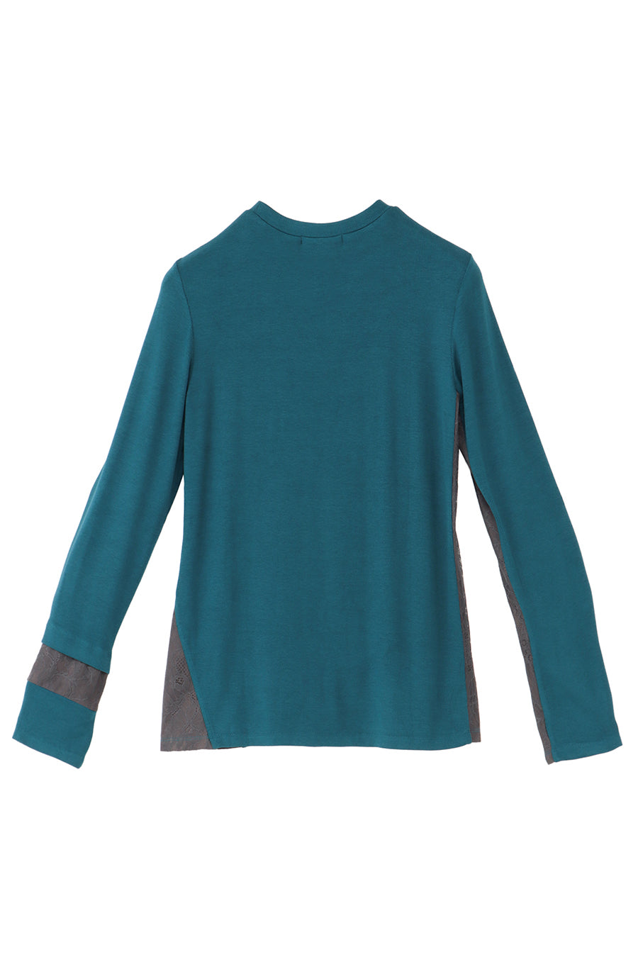 繊細なレースを脇や袖口に左右アシンメトリーでさりげなく切り替え、存在感がありながらもボトムを選ばす、様々なスタイリングに活躍する1枚です。