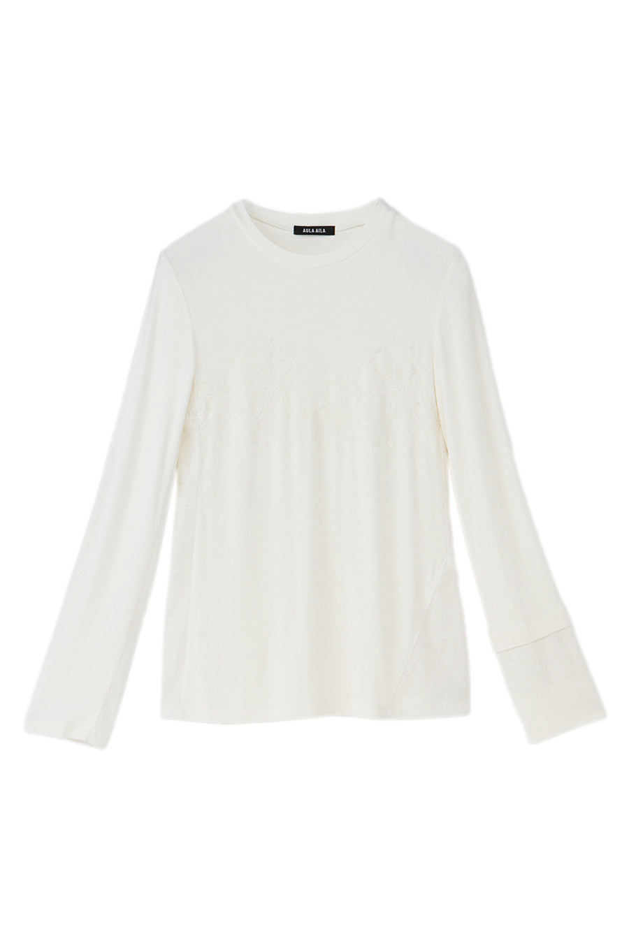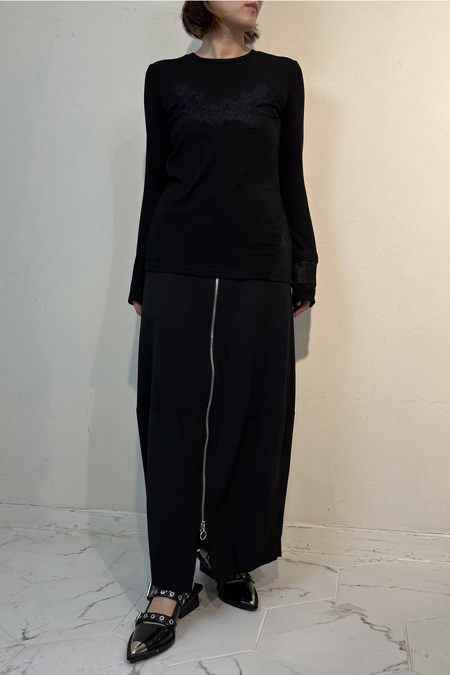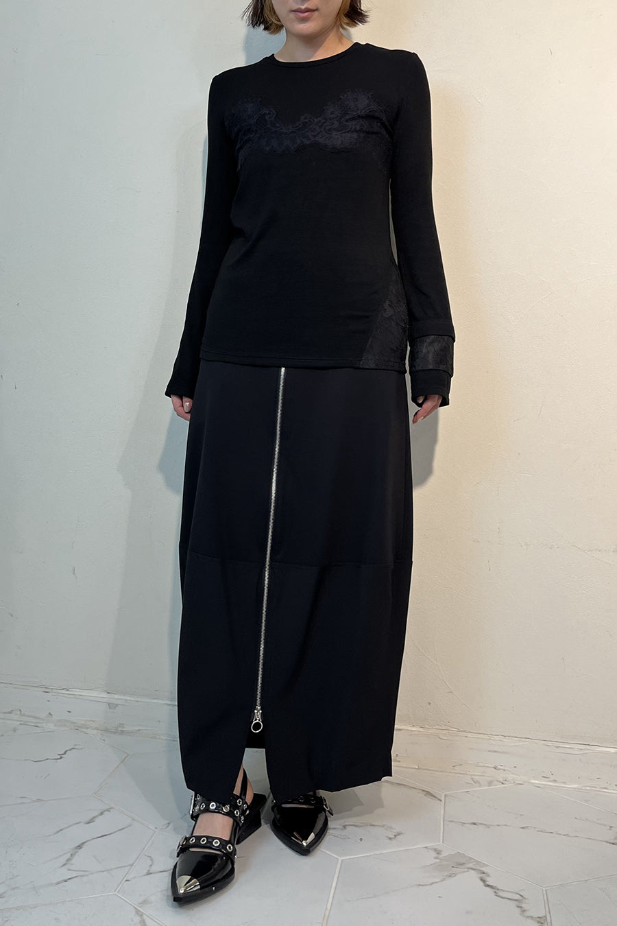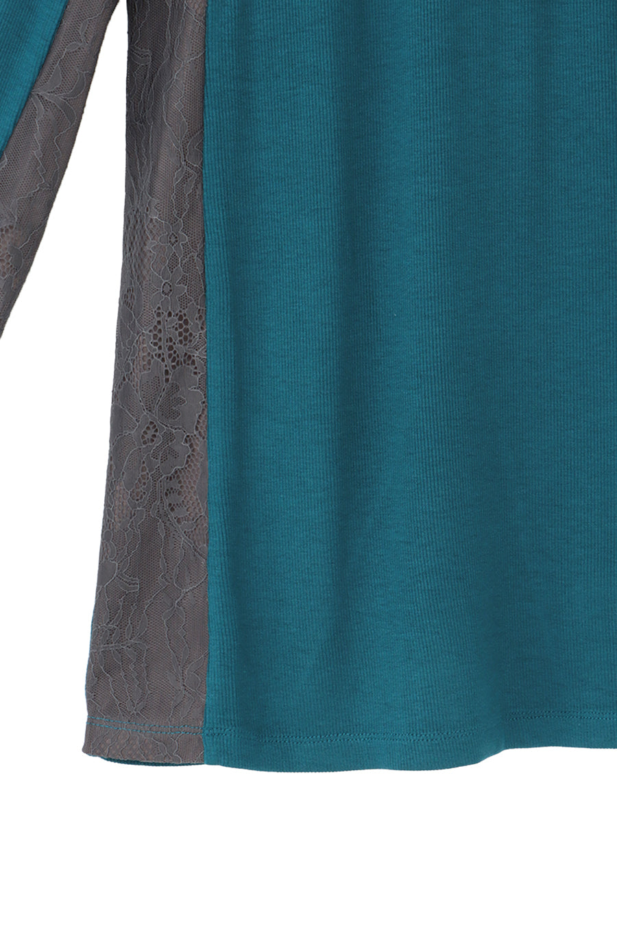 繊細なレースを脇や袖口に左右アシンメトリーでさりげなく切り替え、存在感がありながらもボトムを選ばす、様々なスタイリングに活躍する1枚です。