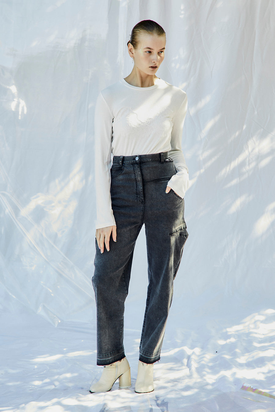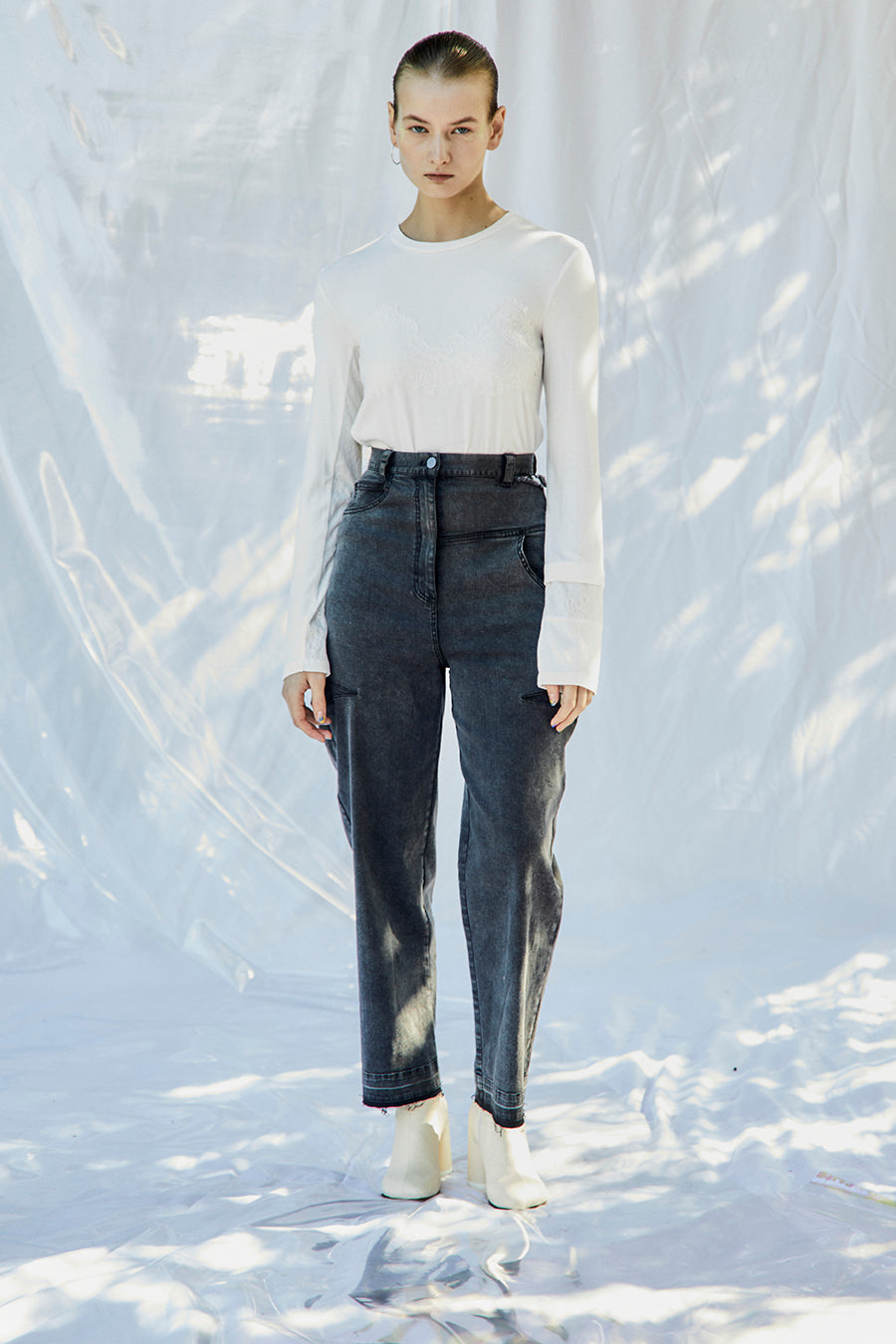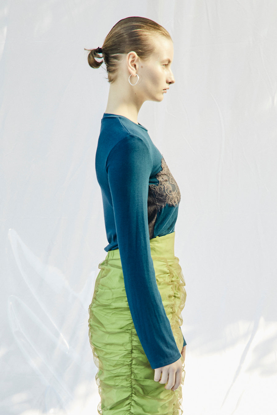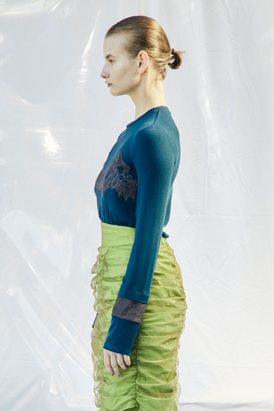 繊細なレースを脇や袖口に左右アシンメトリーでさりげなく切り替え、存在感がありながらもボトムを選ばす、様々なスタイリングに活躍する1枚です。