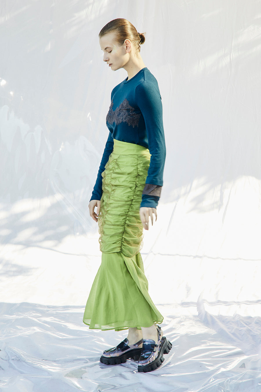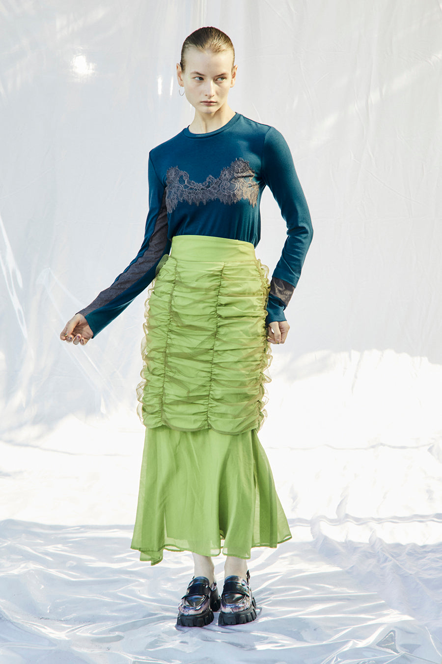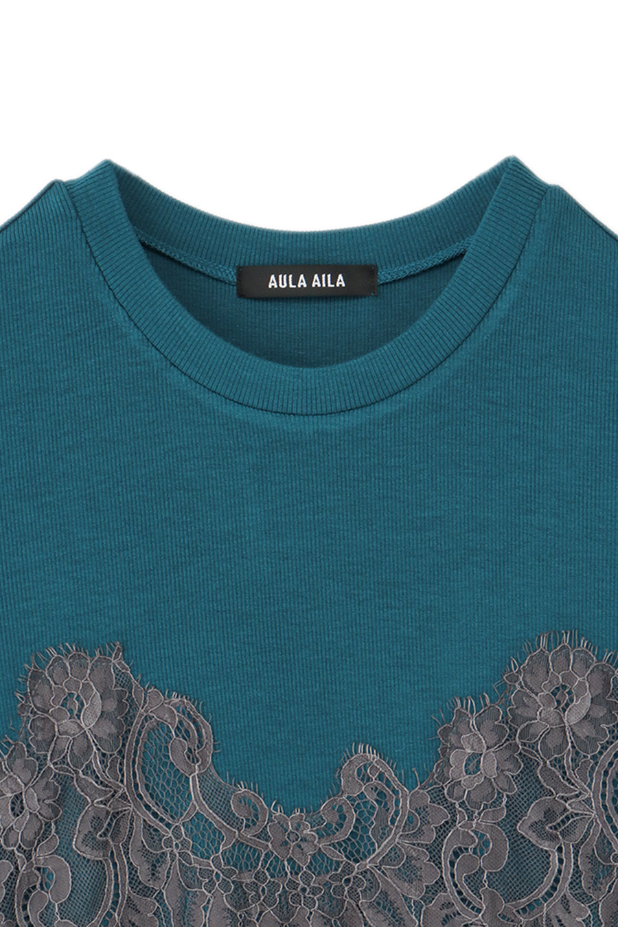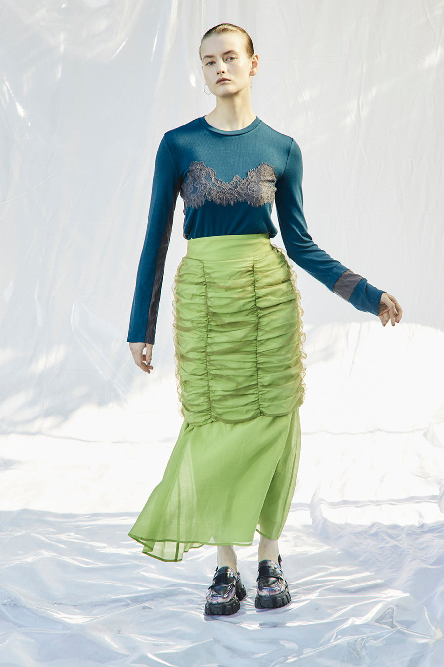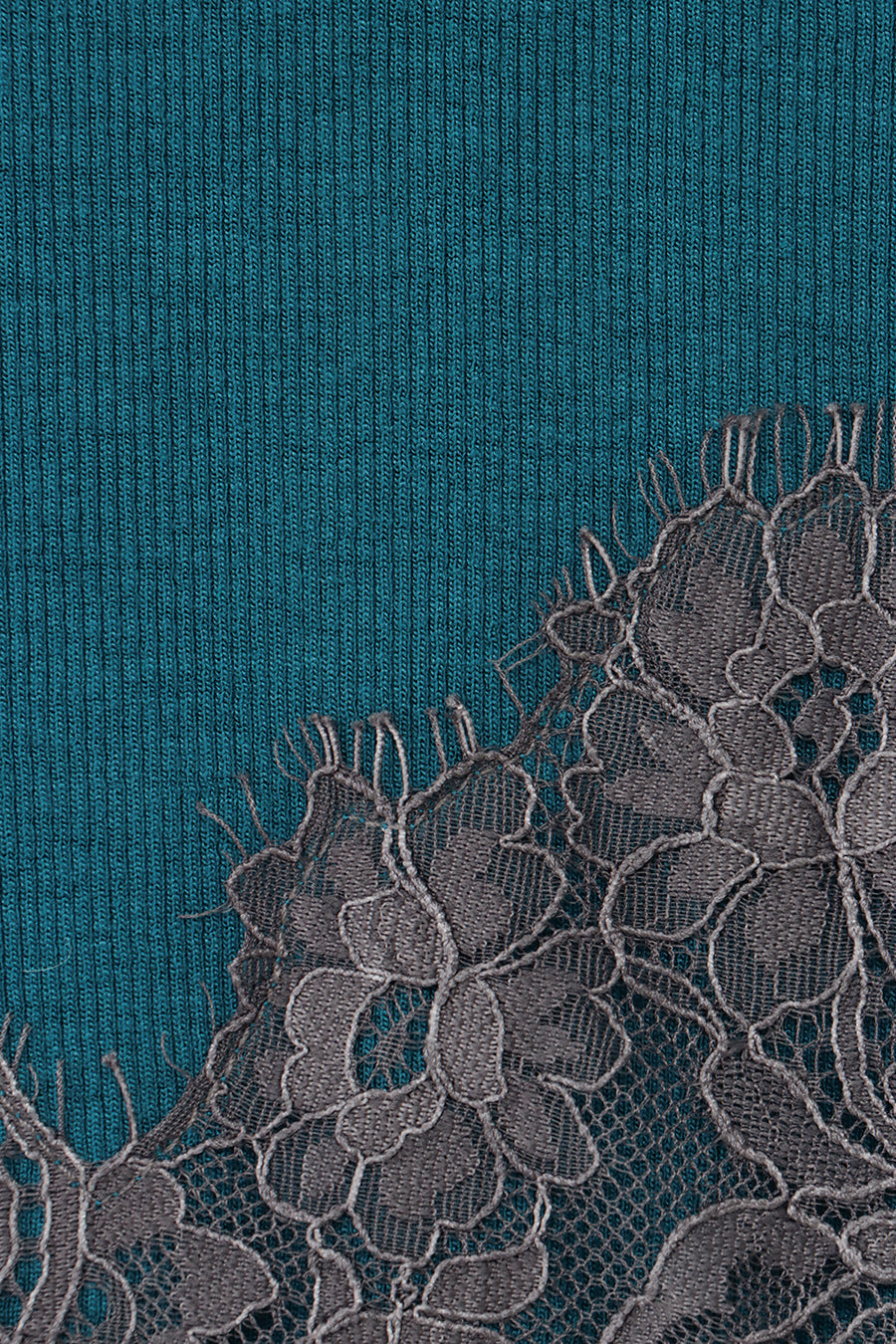 ブラックとオフは同色のレースを使用、ターコイズはチャコールグレーのレースを使用して微配色でモードな印象に。