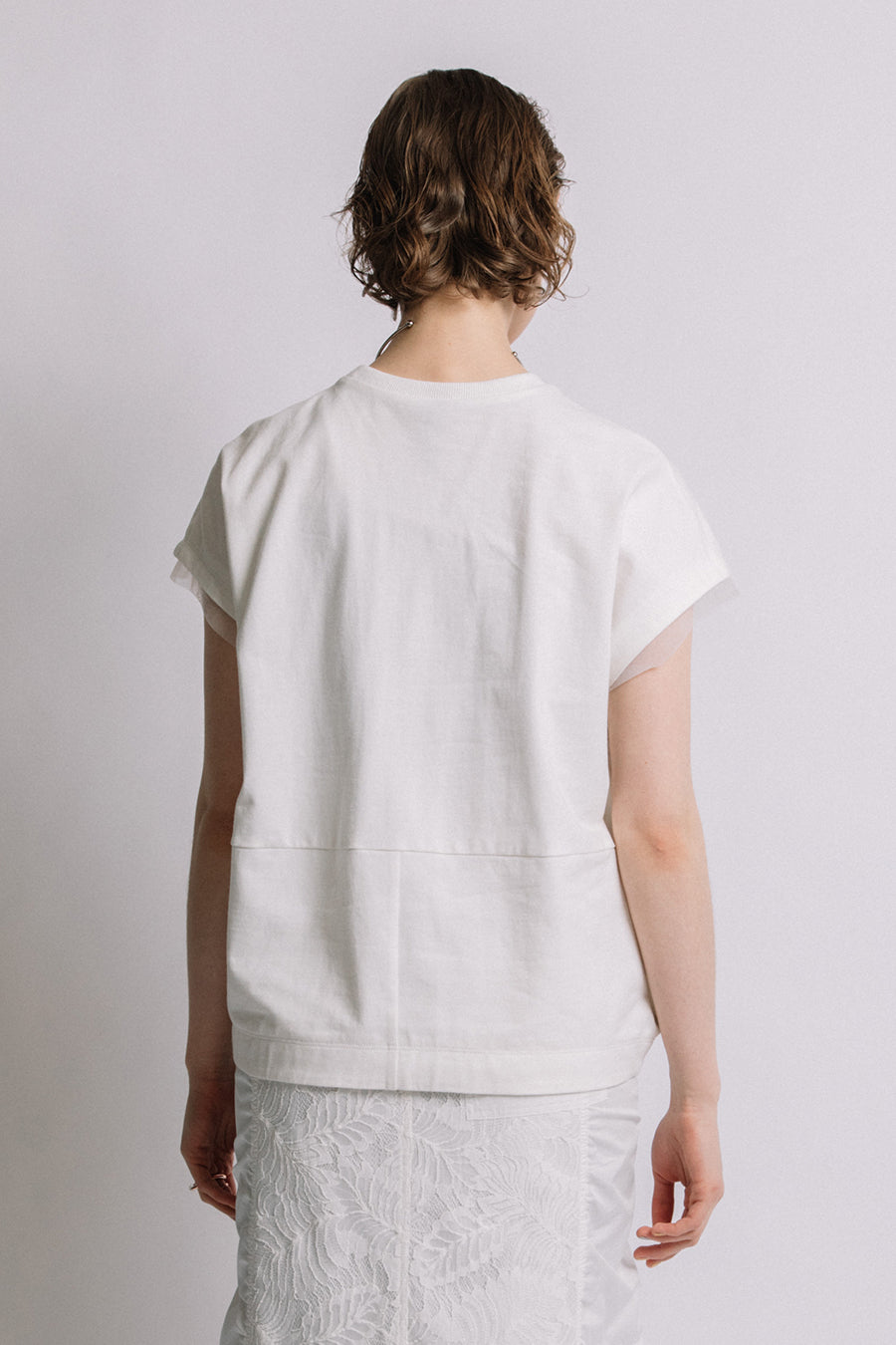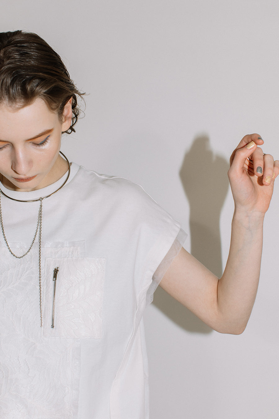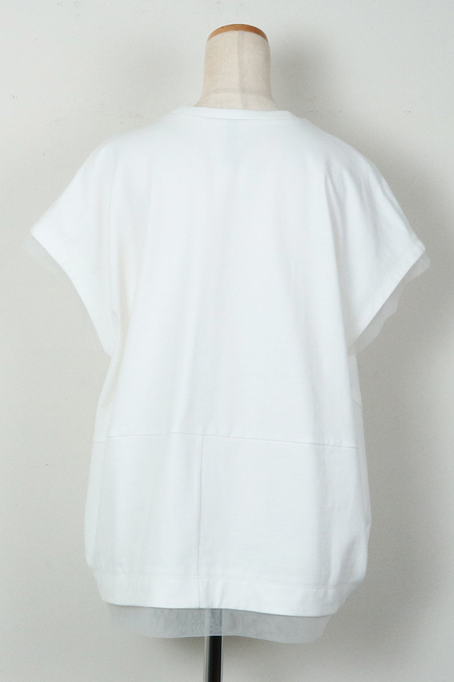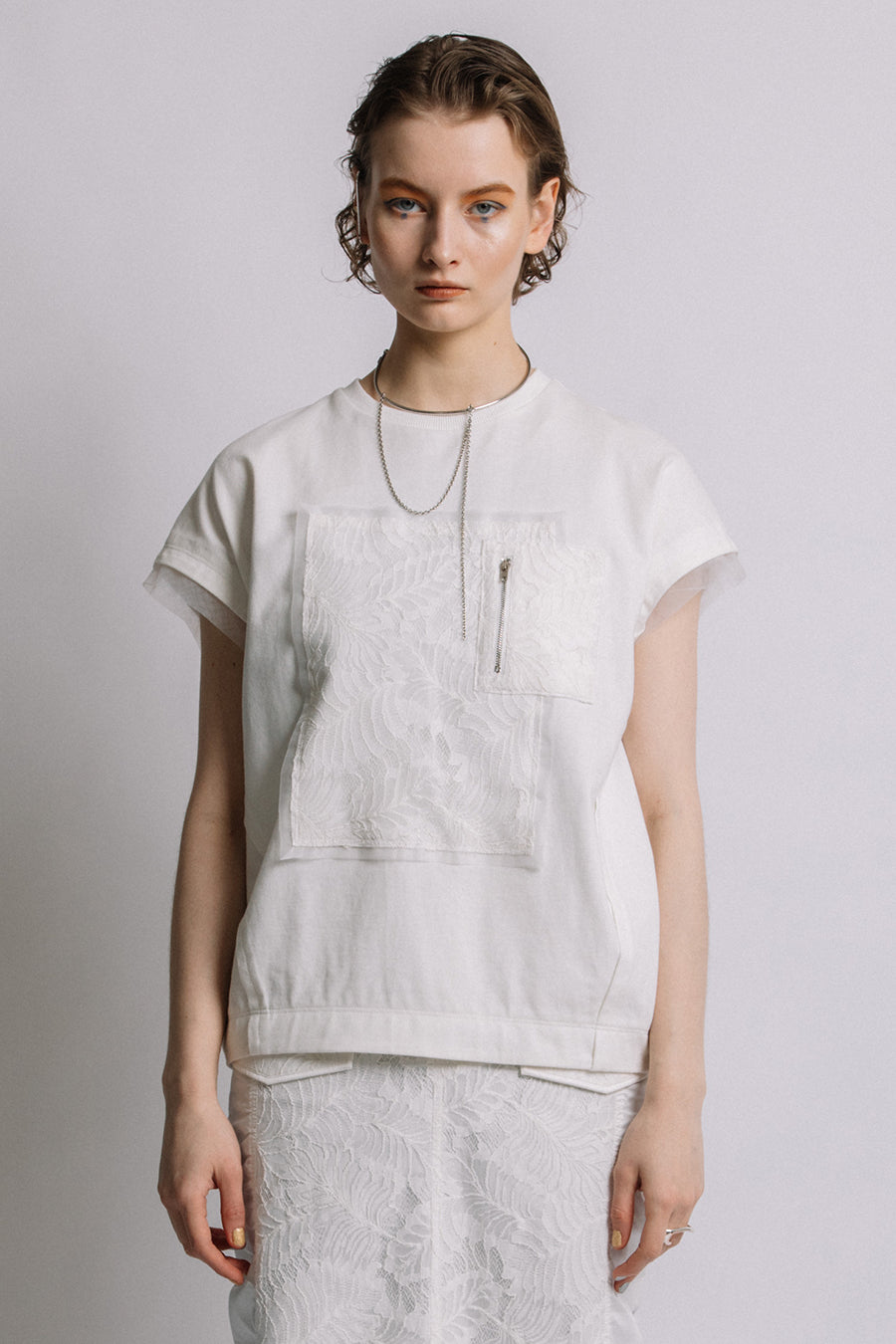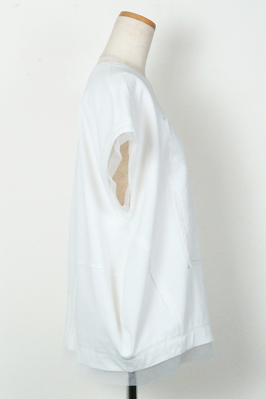 繊細なボタニカル柄レースがまるでプリントTシャツのようにフロントに施された大人のこなれ感を引き立たせる一枚。きれいめなコットンスムース素材を使用し、ゆとりを持たせたシルエットで、袖は二の腕をカバーしてくれるフレンチスリーブに。袖口と裾にはチュールが覗いているようなレイヤードデザインで遊び心をプラス。後ろはさりげないコクーンシルエットで膨らみすぎず、程よい立体感を構築。生地と同色のレースを使用し、華やかさがありながら大人のスタイリングに溶け込む着回し力抜群のアイテム。ボトムを選ぶこと無く、カジュアルからキレイめスタイルまで幅広く着回しがきくのも◎