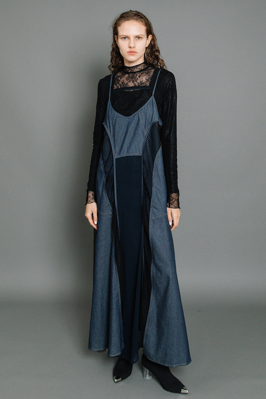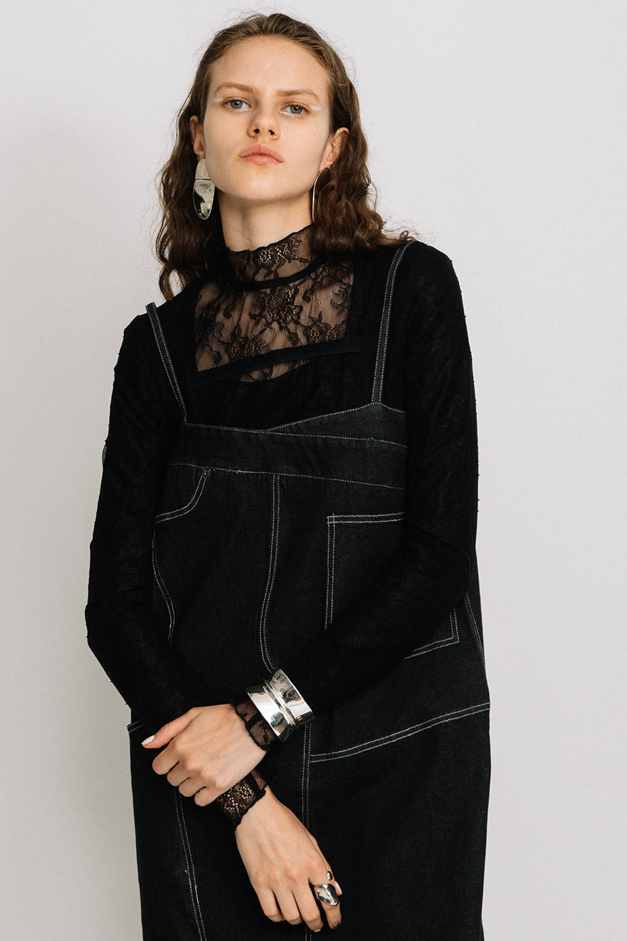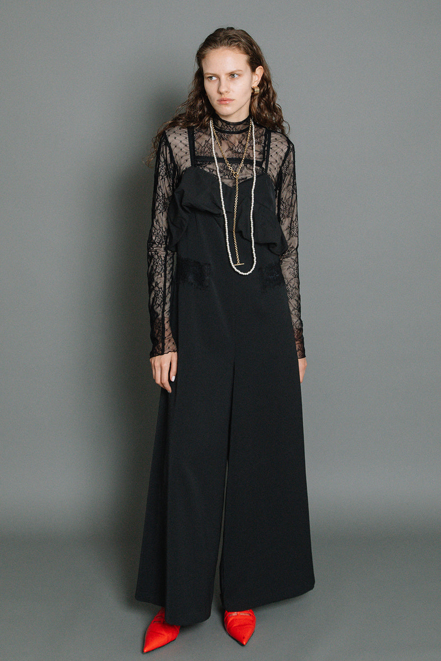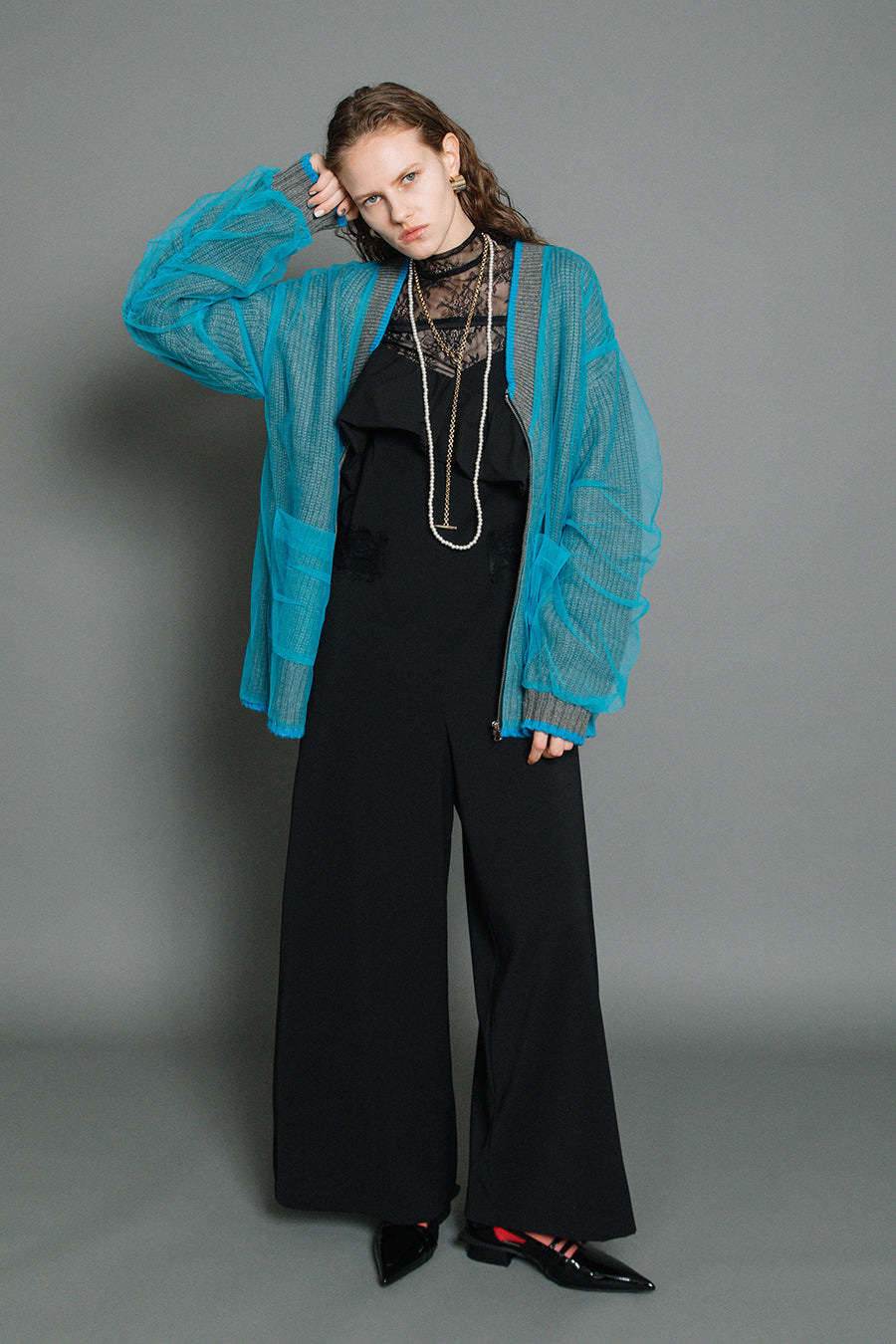 ブラック以外は、インナーが配色なので、レースの柄や配色のパイピング、メローがアクセントとなり1枚でもお洒落に着こなせるアイテム。後ろファスナー開き。