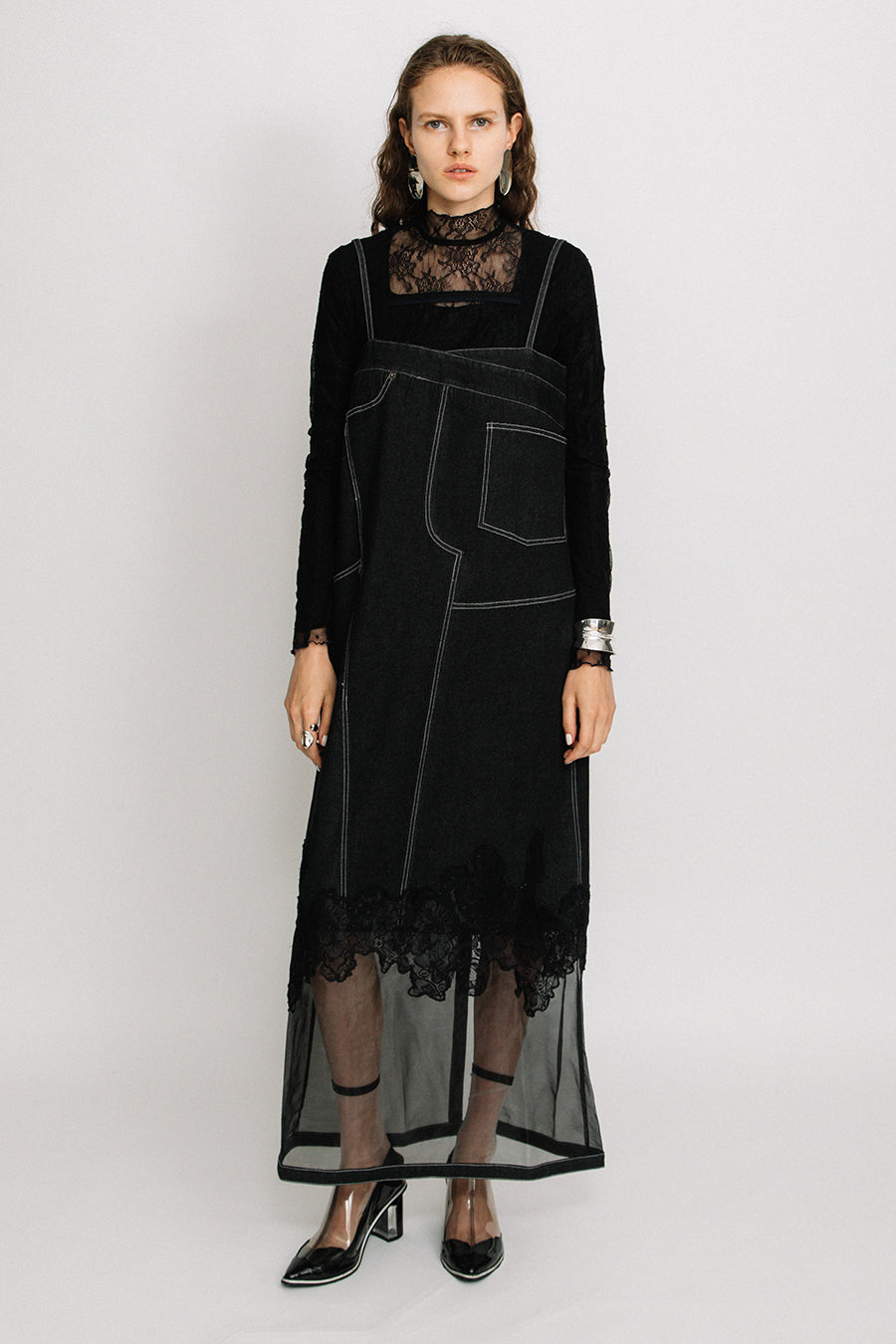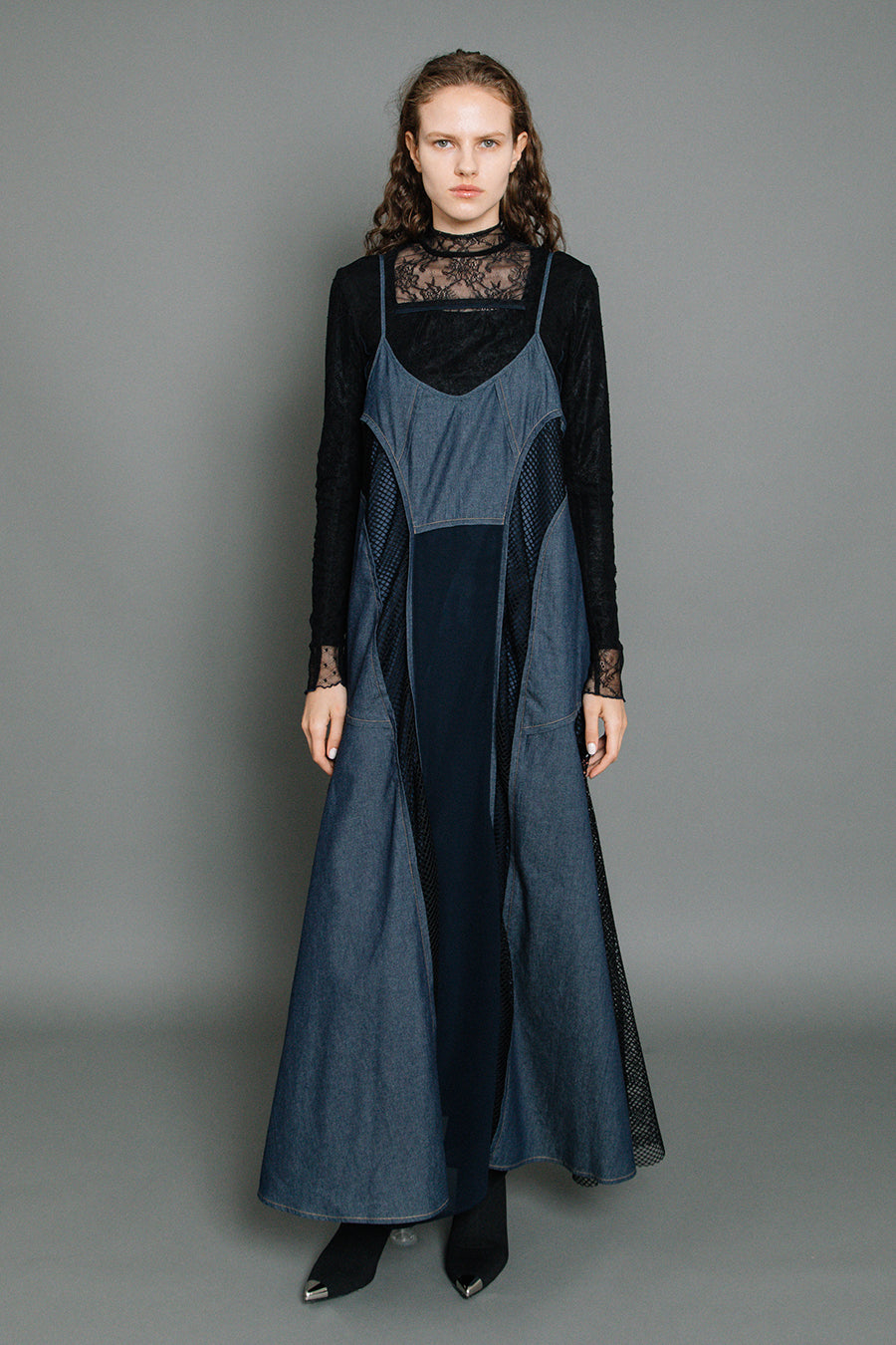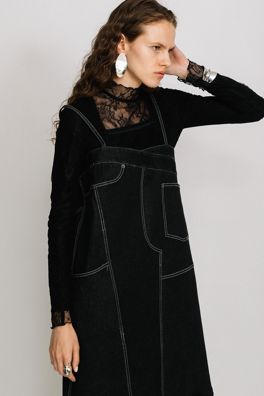 ブラック以外は、インナーが配色なので、レースの柄や配色のパイピング、メローがアクセントとなり1枚でもお洒落に着こなせるアイテム。後ろファスナー開き。