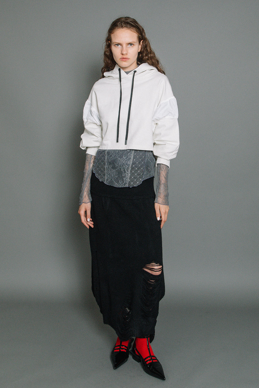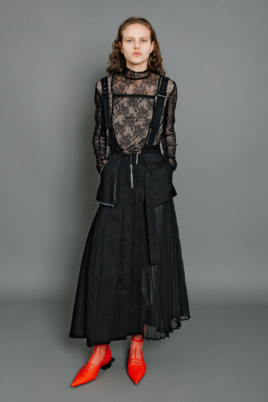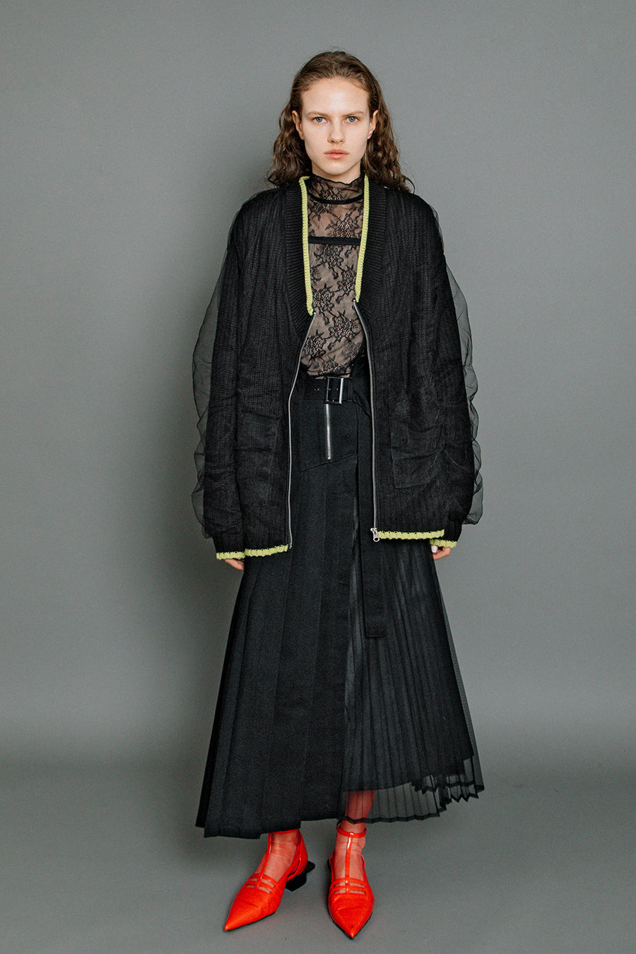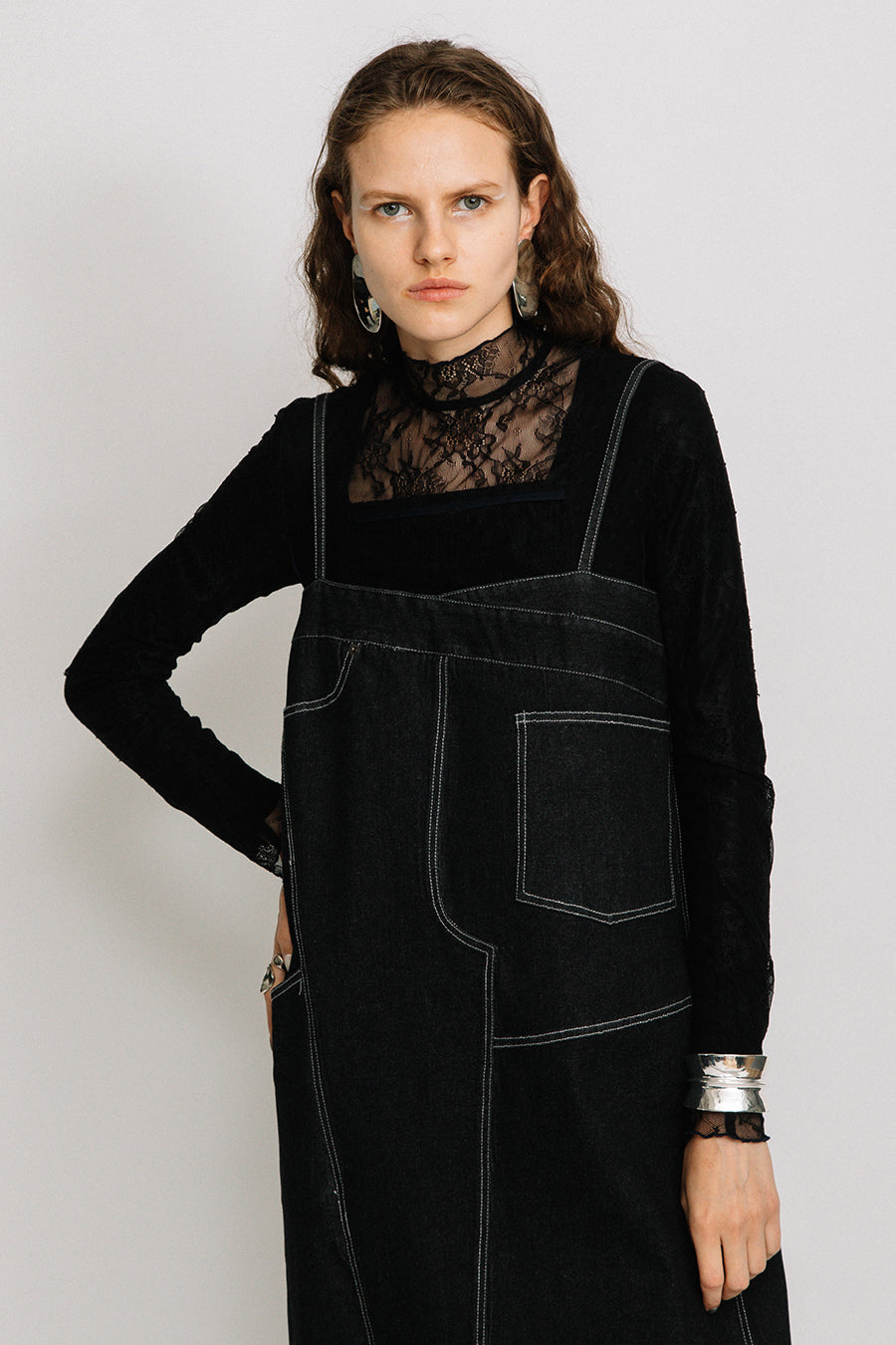 ブラック以外は、インナーが配色なので、レースの柄や配色のパイピング、メローがアクセントとなり1枚でもお洒落に着こなせるアイテム。後ろファスナー開き。