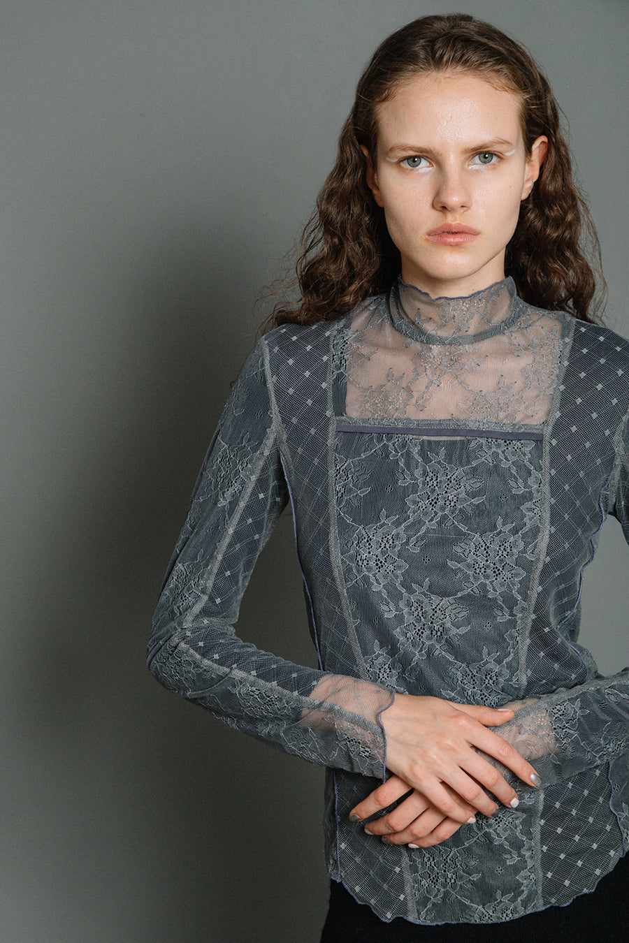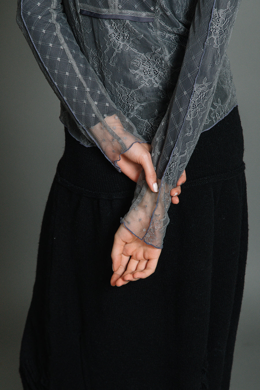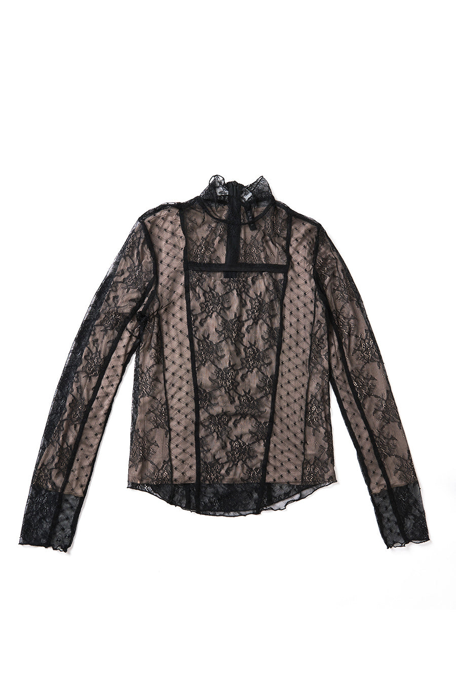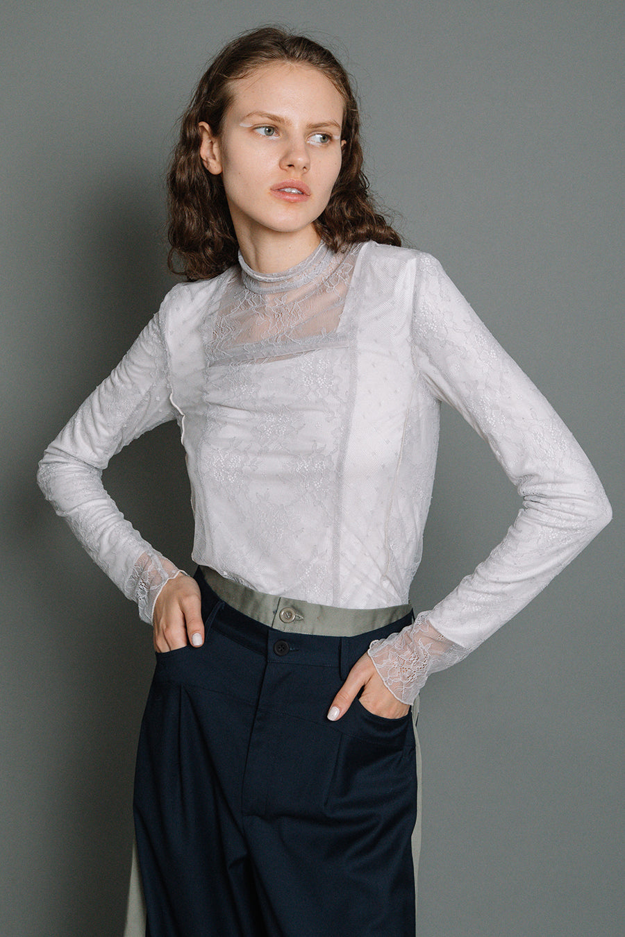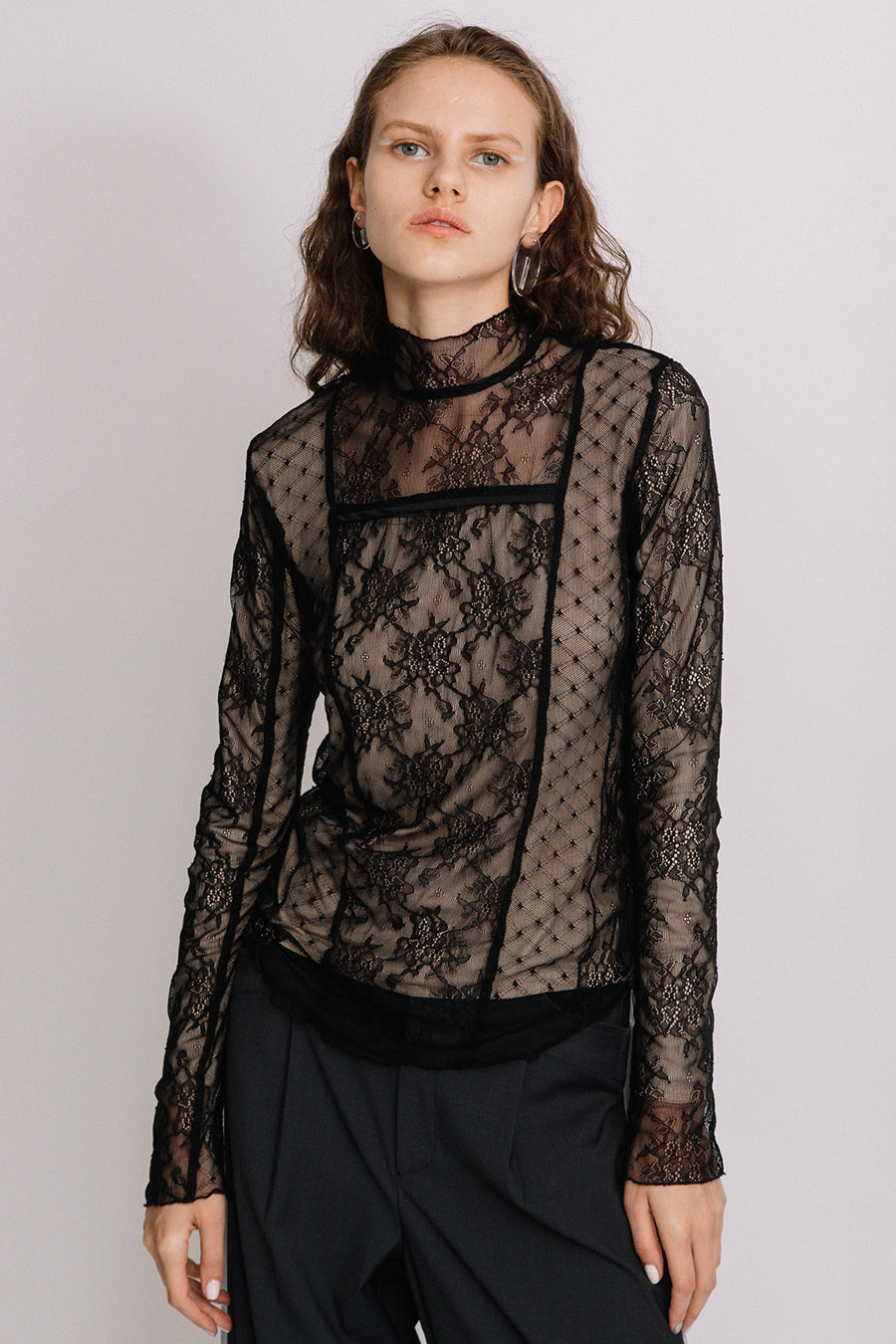 デコルテ部分のみ透け感があり女性らしさを演出しつつも、ストレッチカットソーのインナー付きなので、透け感を気にせず着られるのも嬉しいポイント。