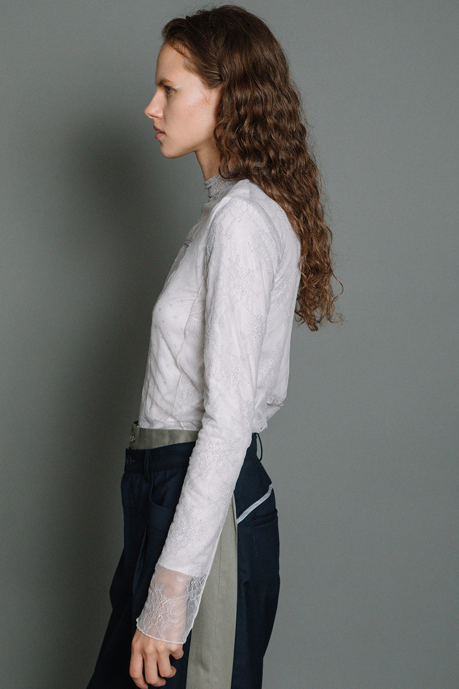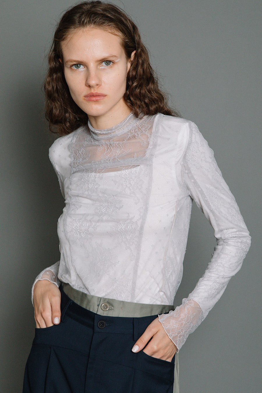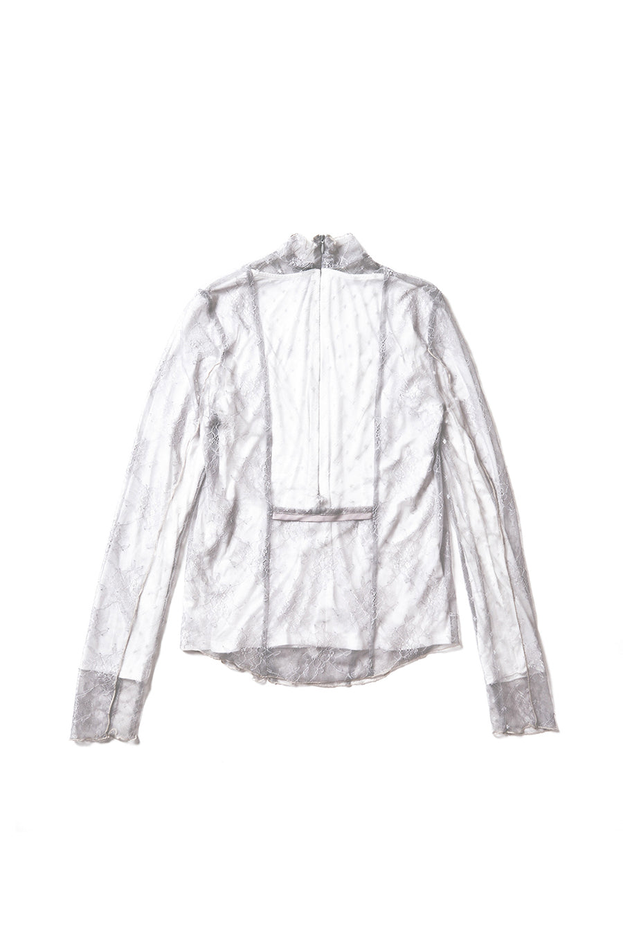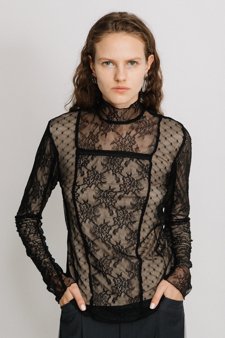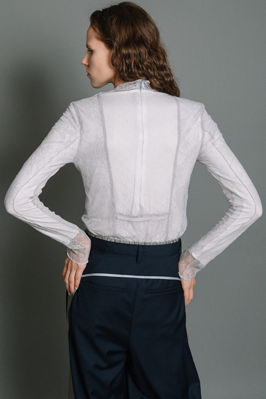 デコルテ部分のみ透け感があり女性らしさを演出しつつも、ストレッチカットソーのインナー付きなので、透け感を気にせず着られるのも嬉しいポイント。