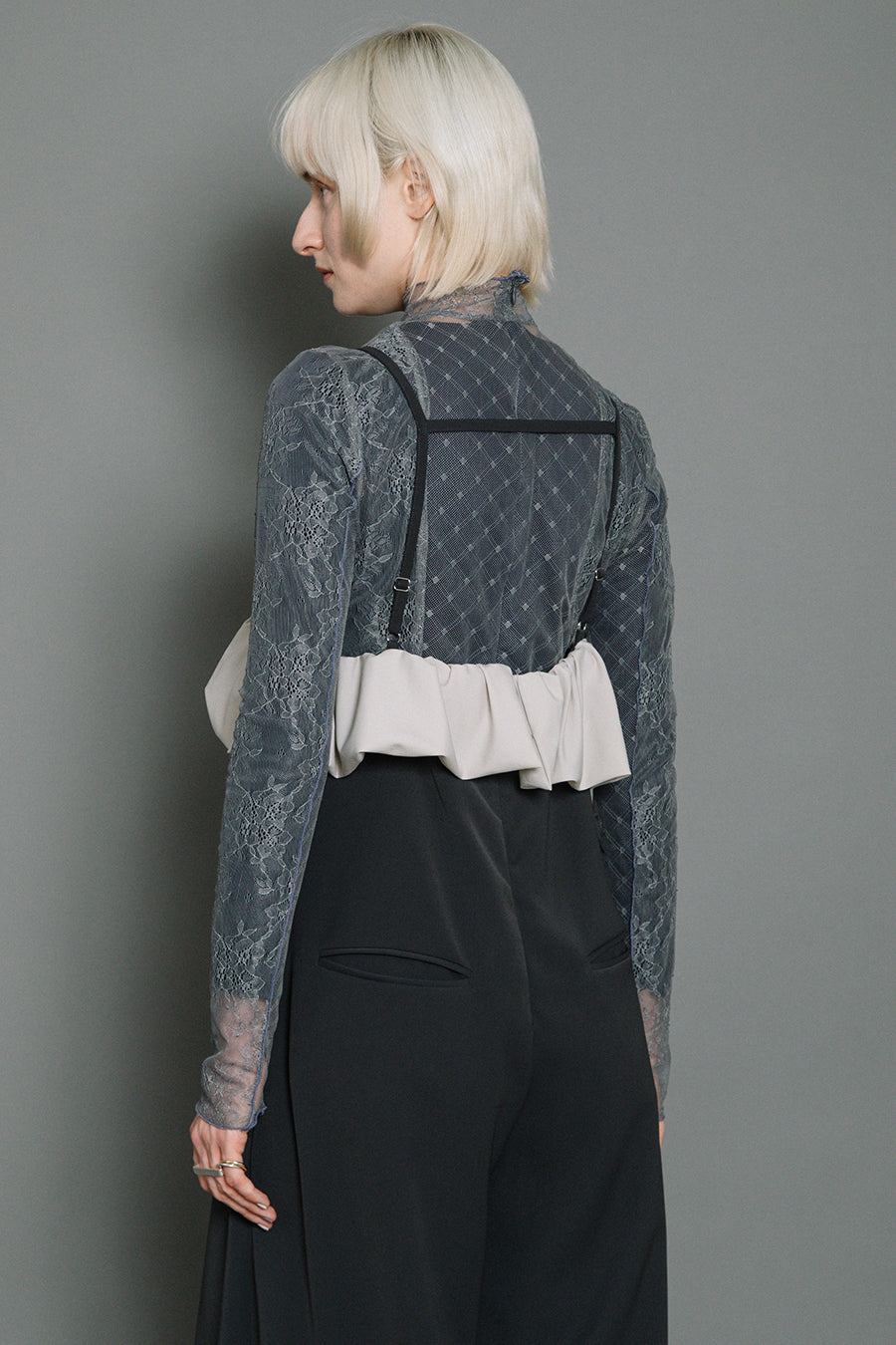 フラワー柄とスクエア柄のストレッチレースをコンビネーションした裏地付きインナートップス。