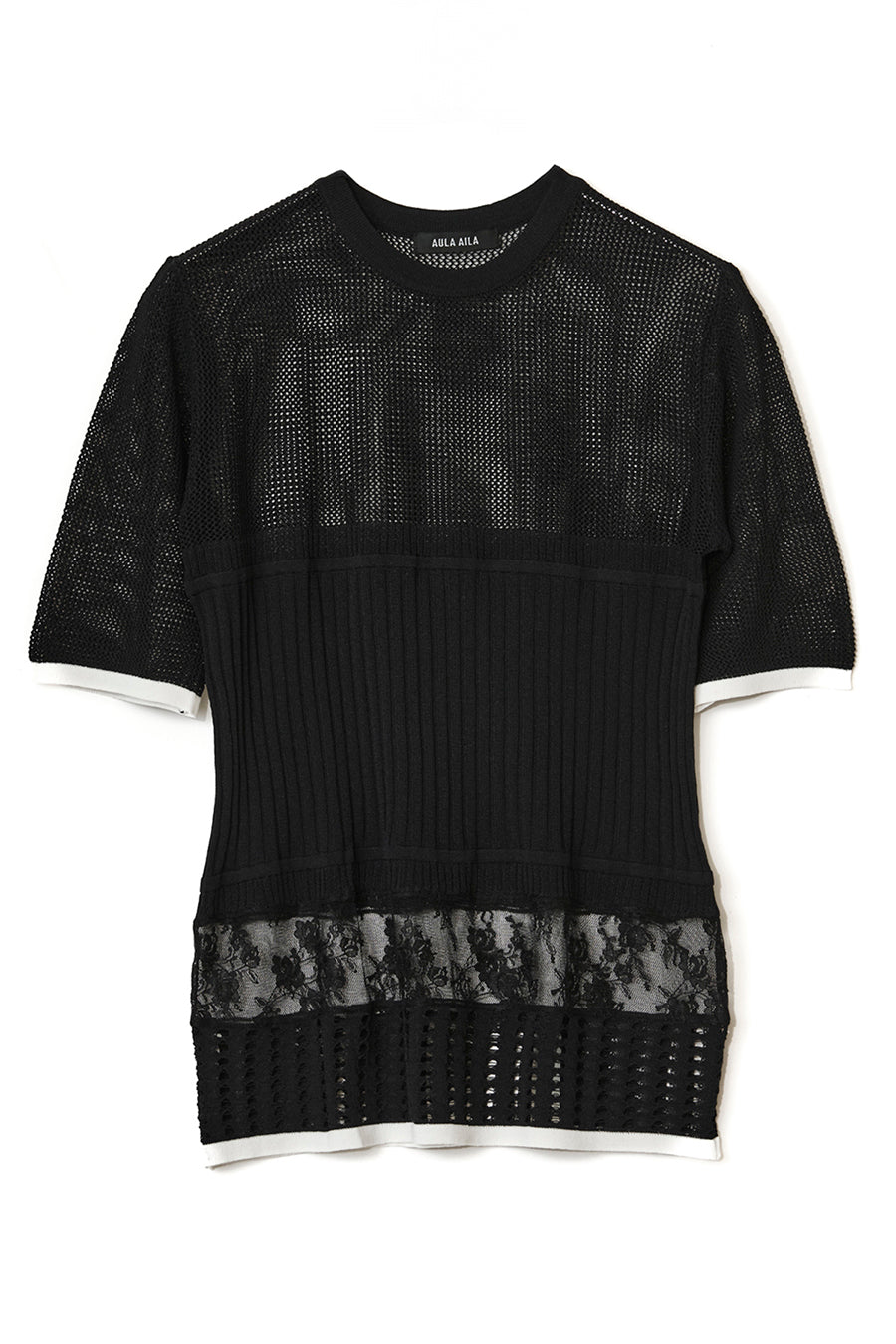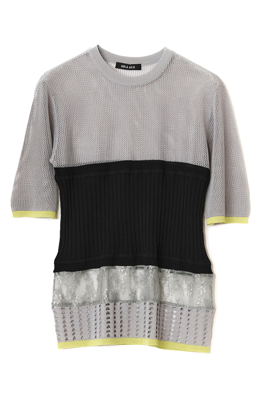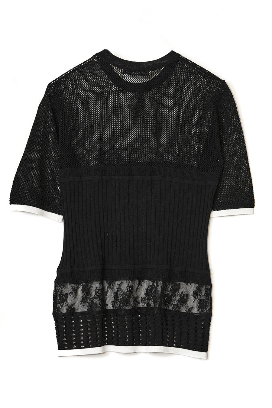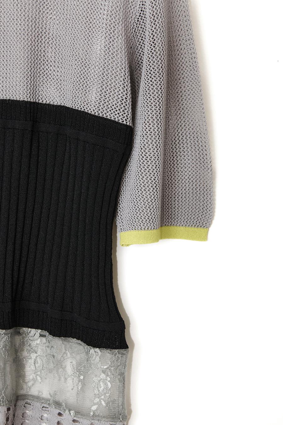 大小メッシュ編み、太細リブのニット編地とレースのでコンビネーションニットプルオーバー。身頃は、太リブのベアトップを着ているような配色の切り替えデ