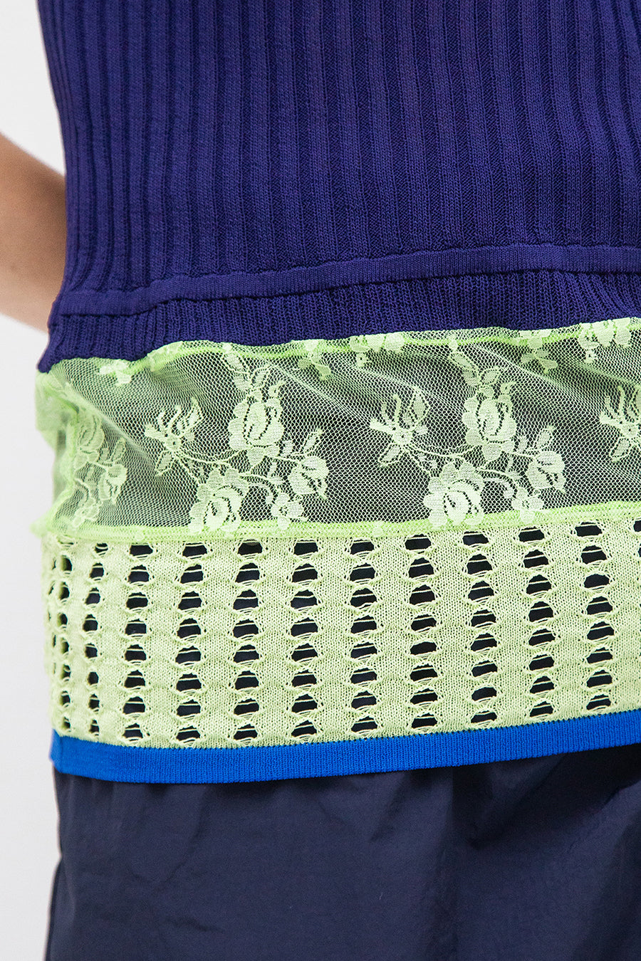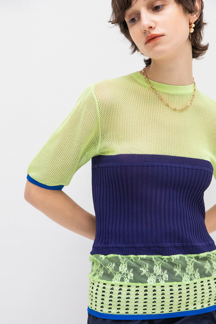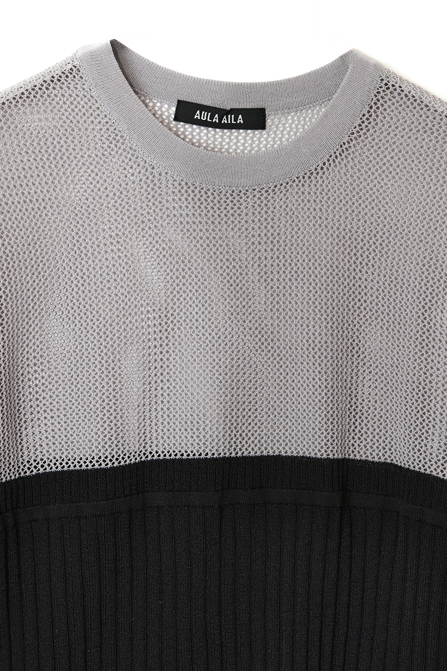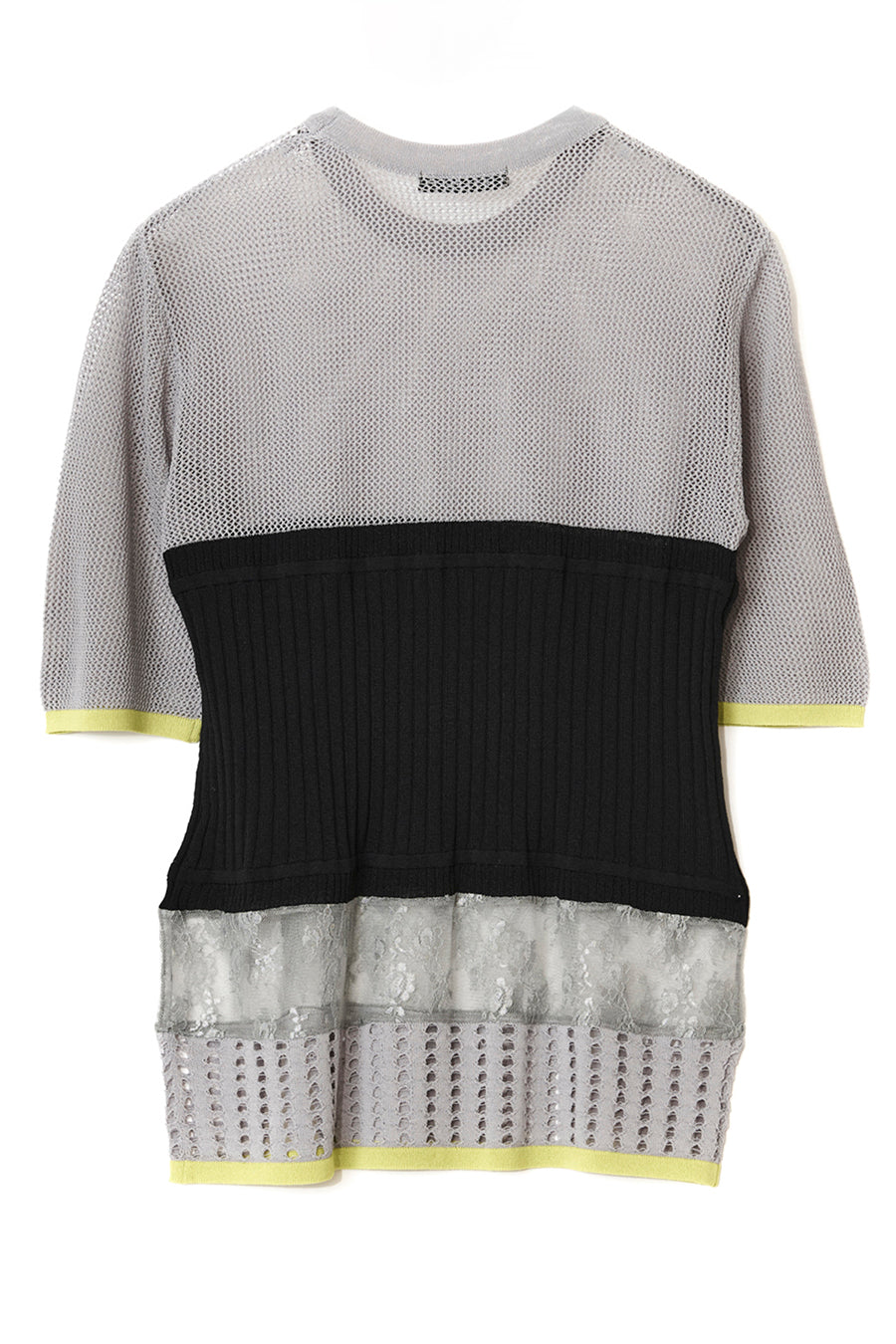 大小メッシュ編み、太細リブのニット編地とレースのでコンビネーションニットプルオーバー。身頃は、太リブのベアトップを着ているような配色の切り替えデ
