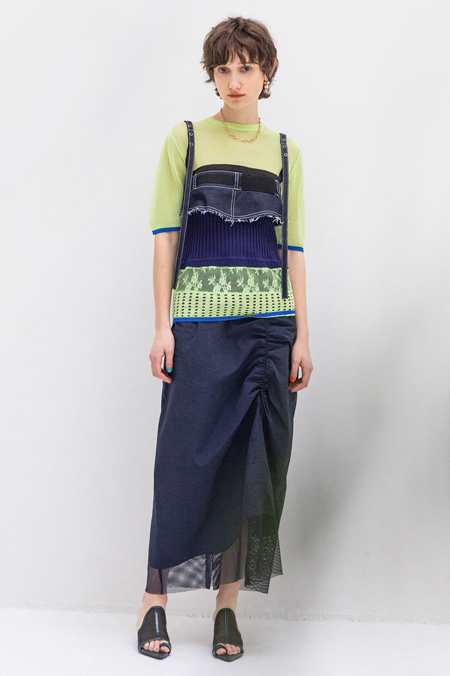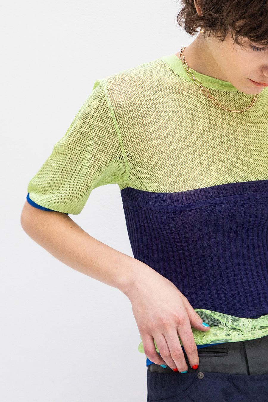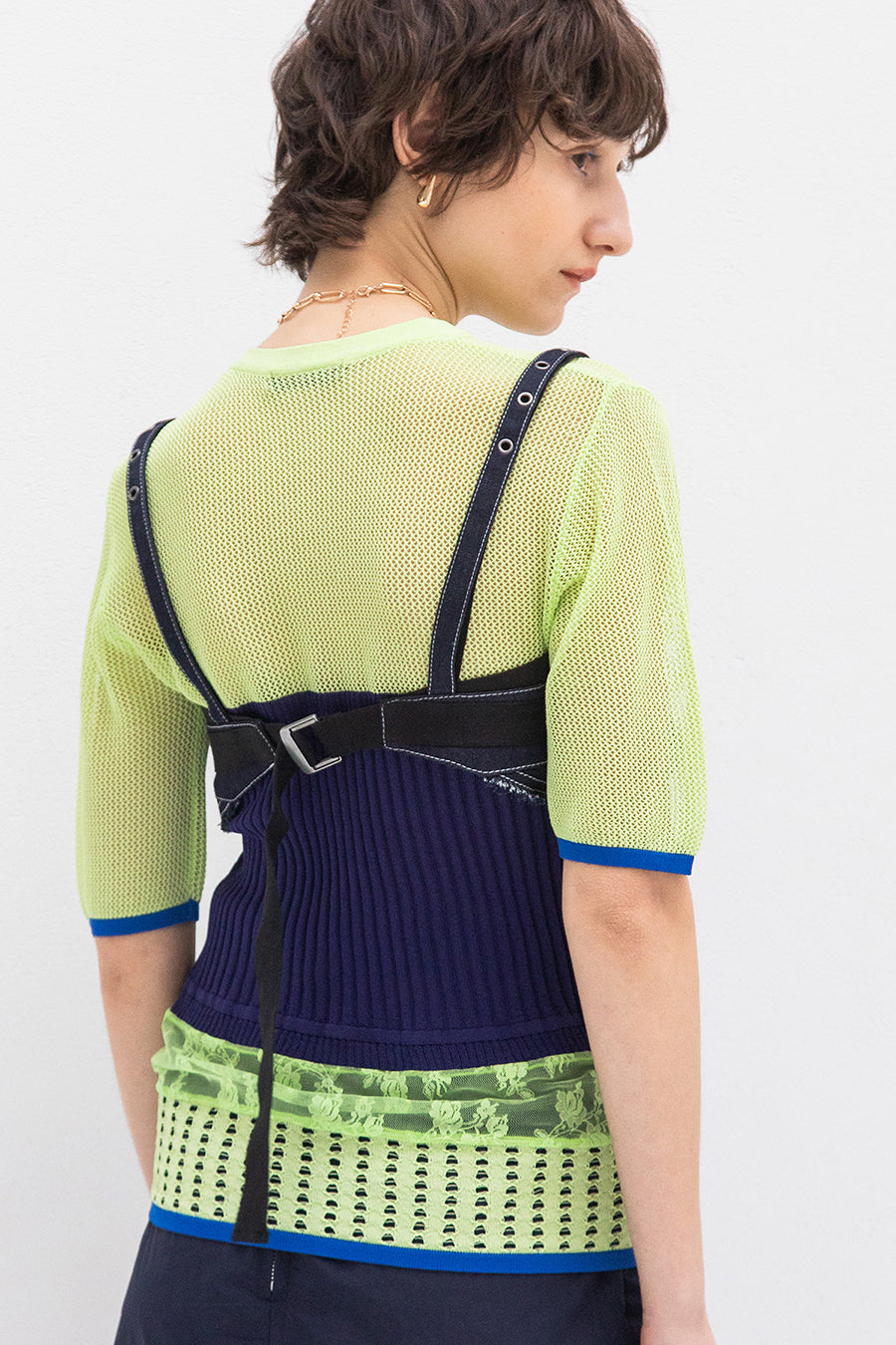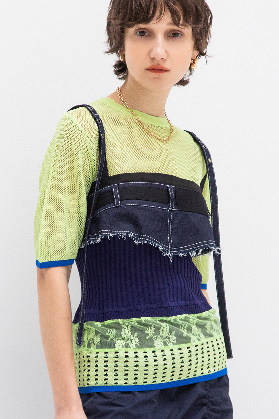 大小メッシュ編み、太細リブのニット編地とレースのでコンビネーションニットプルオーバー。身頃は、太リブのベアトップを着ているような配色の切り替えデ
