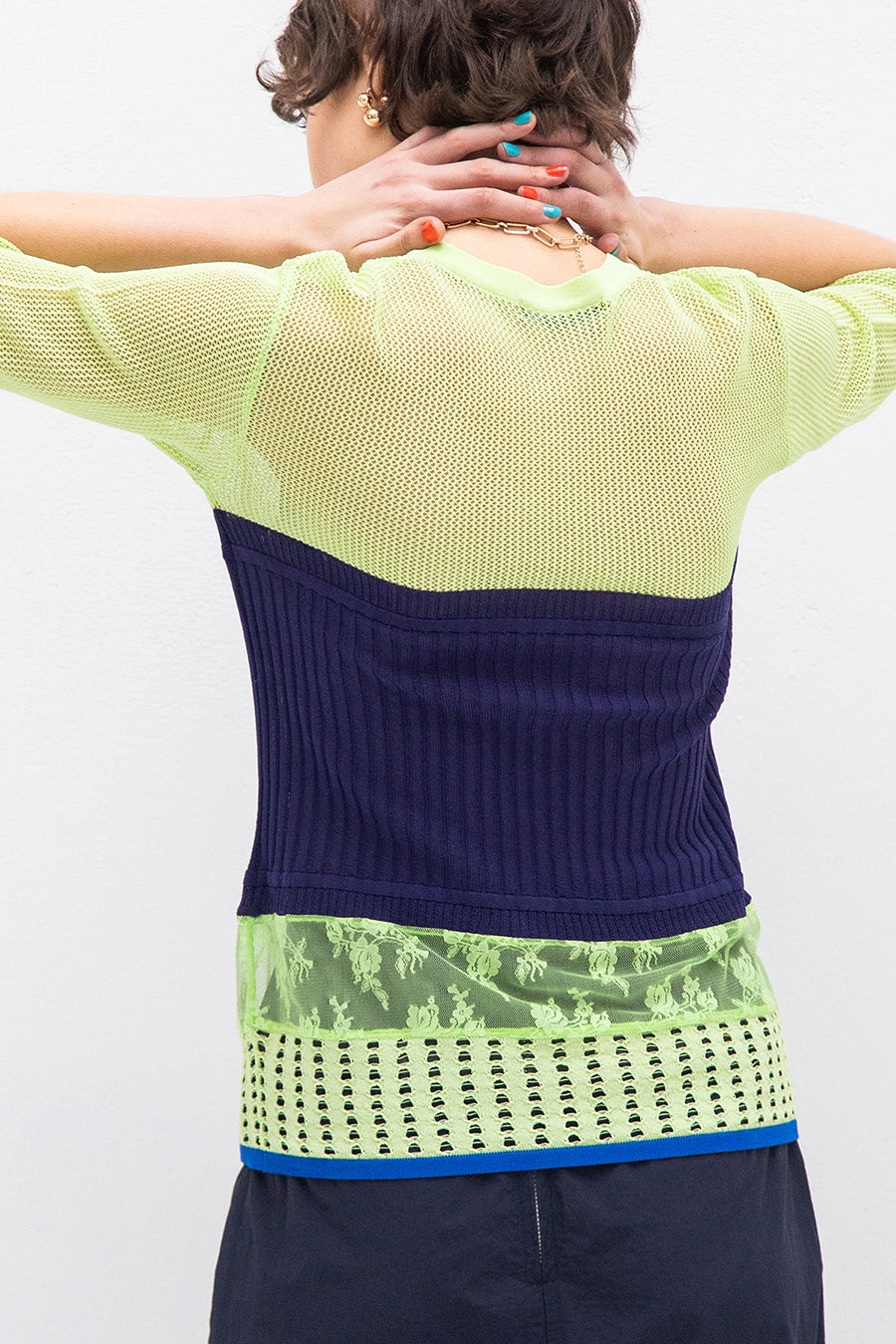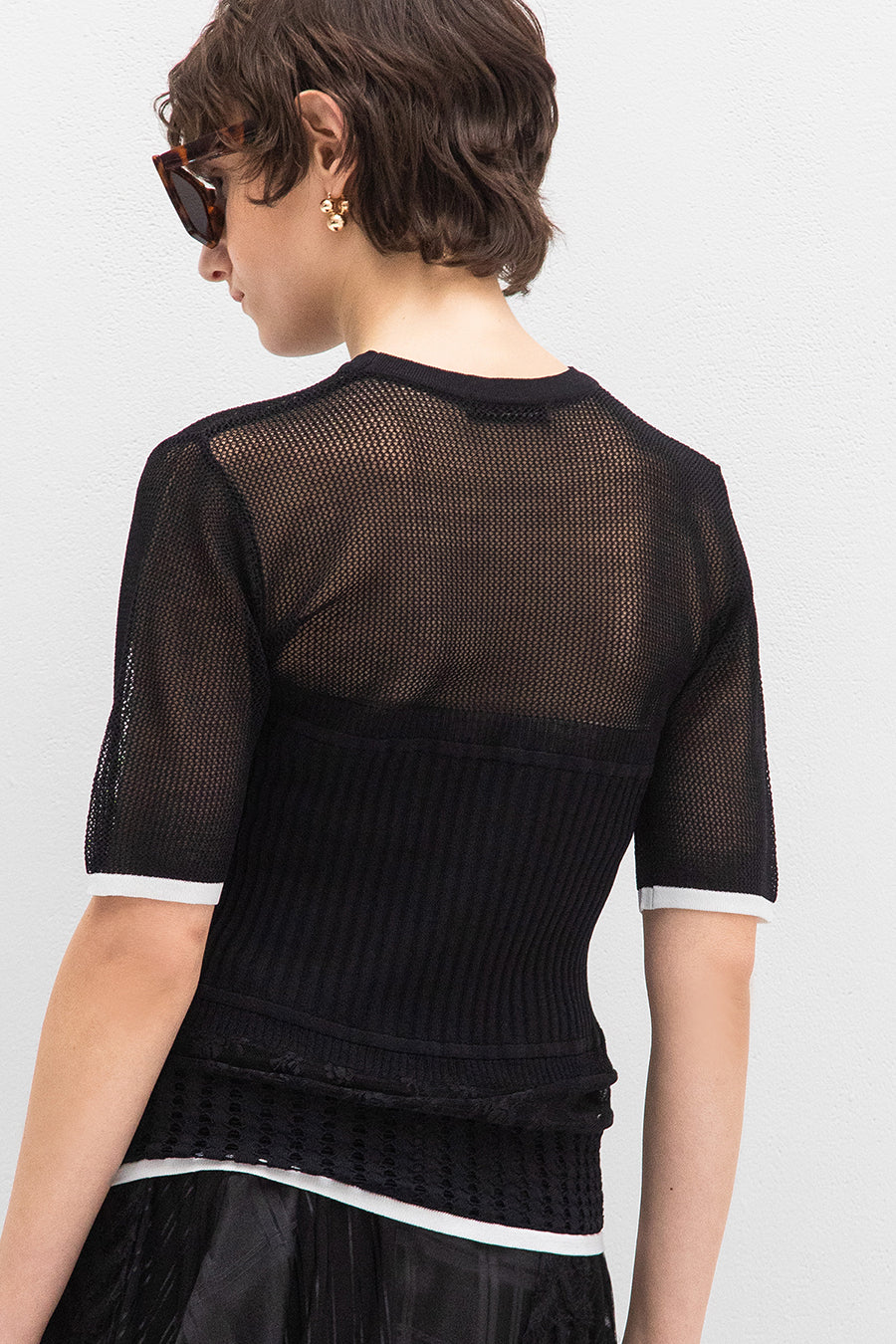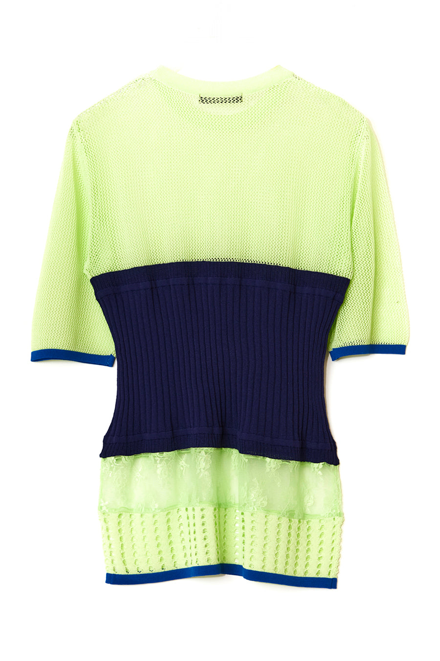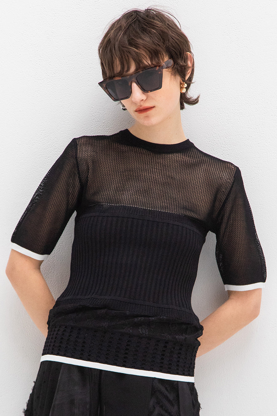 ザイン。上身頃と袖は小メッシュ編地、裾はレースと大メッシュ編地に切り替えたのも目を惹くポイント。袖口と裾は配色ラインでアクセントを加え、全体にシ