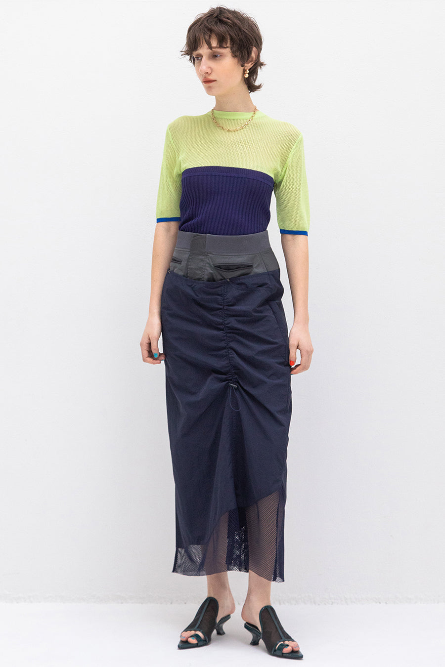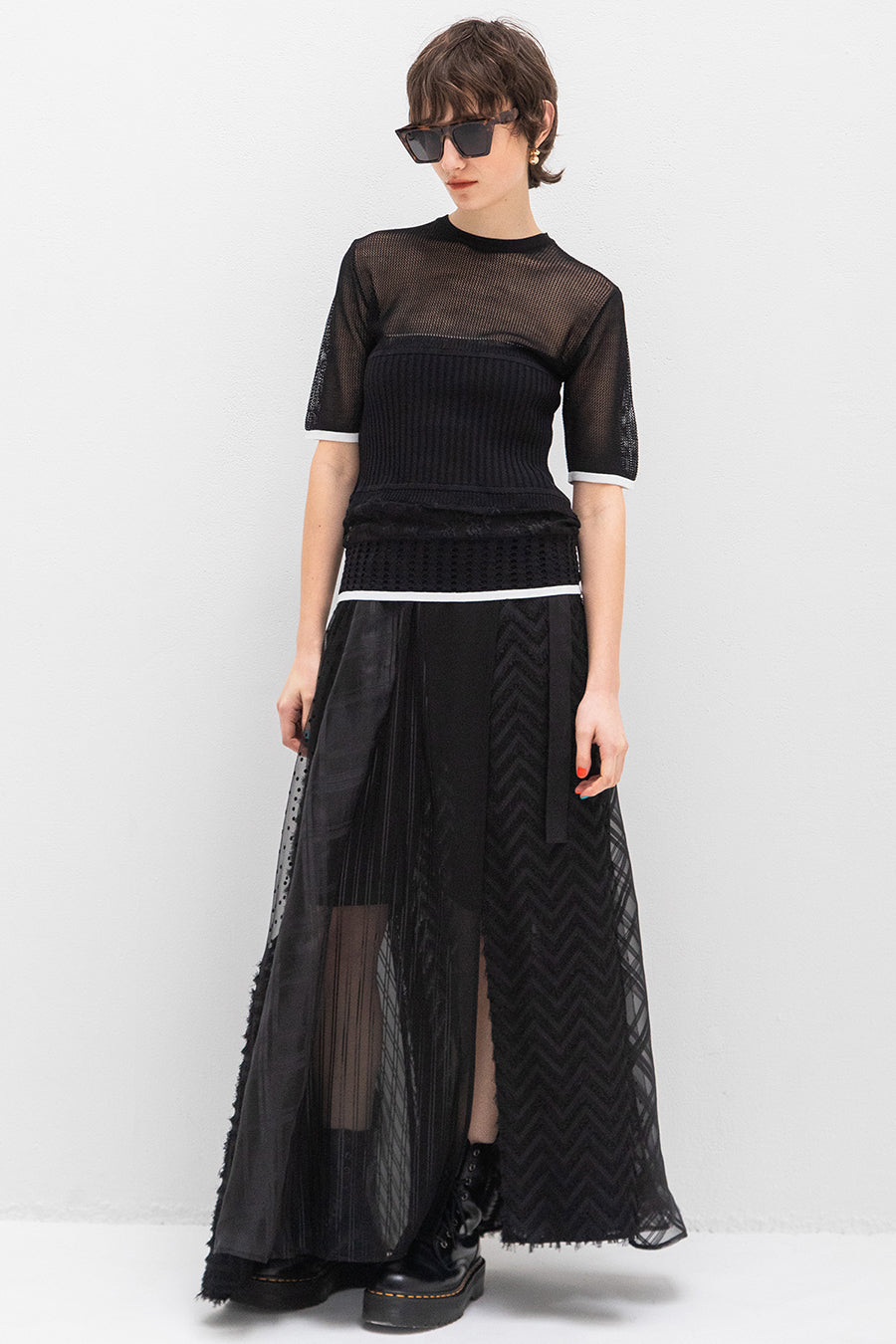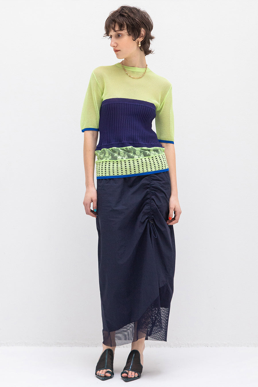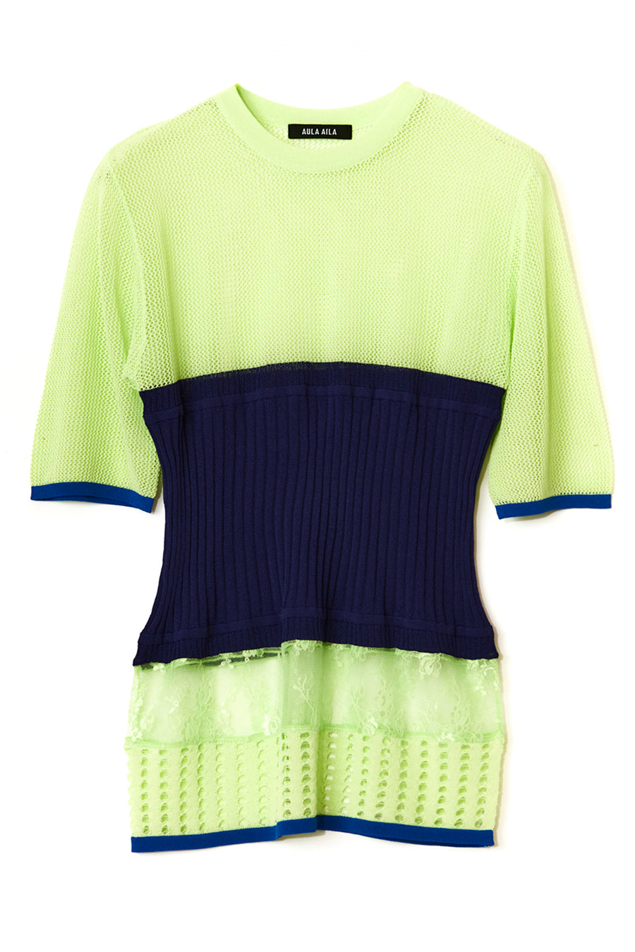 ザイン。上身頃と袖は小メッシュ編地、裾はレースと大メッシュ編地に切り替えたのも目を惹くポイント。袖口と裾は配色ラインでアクセントを加え、全体にシ