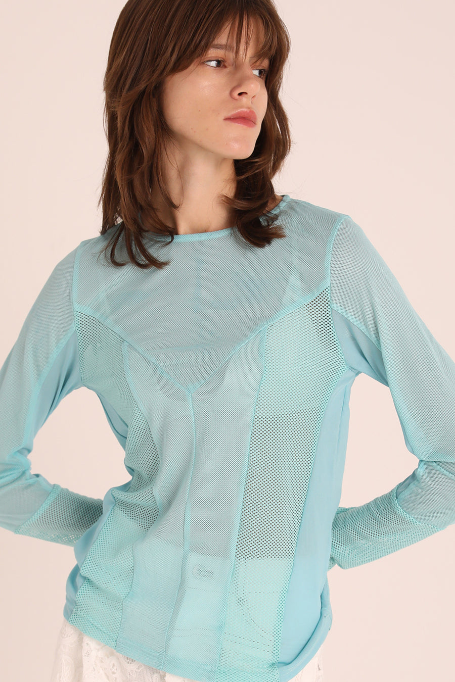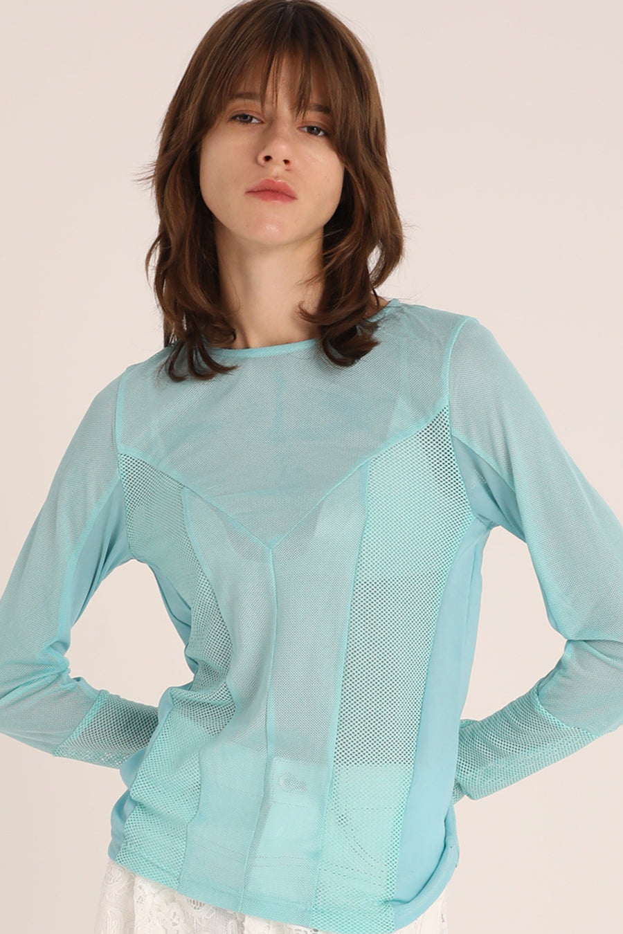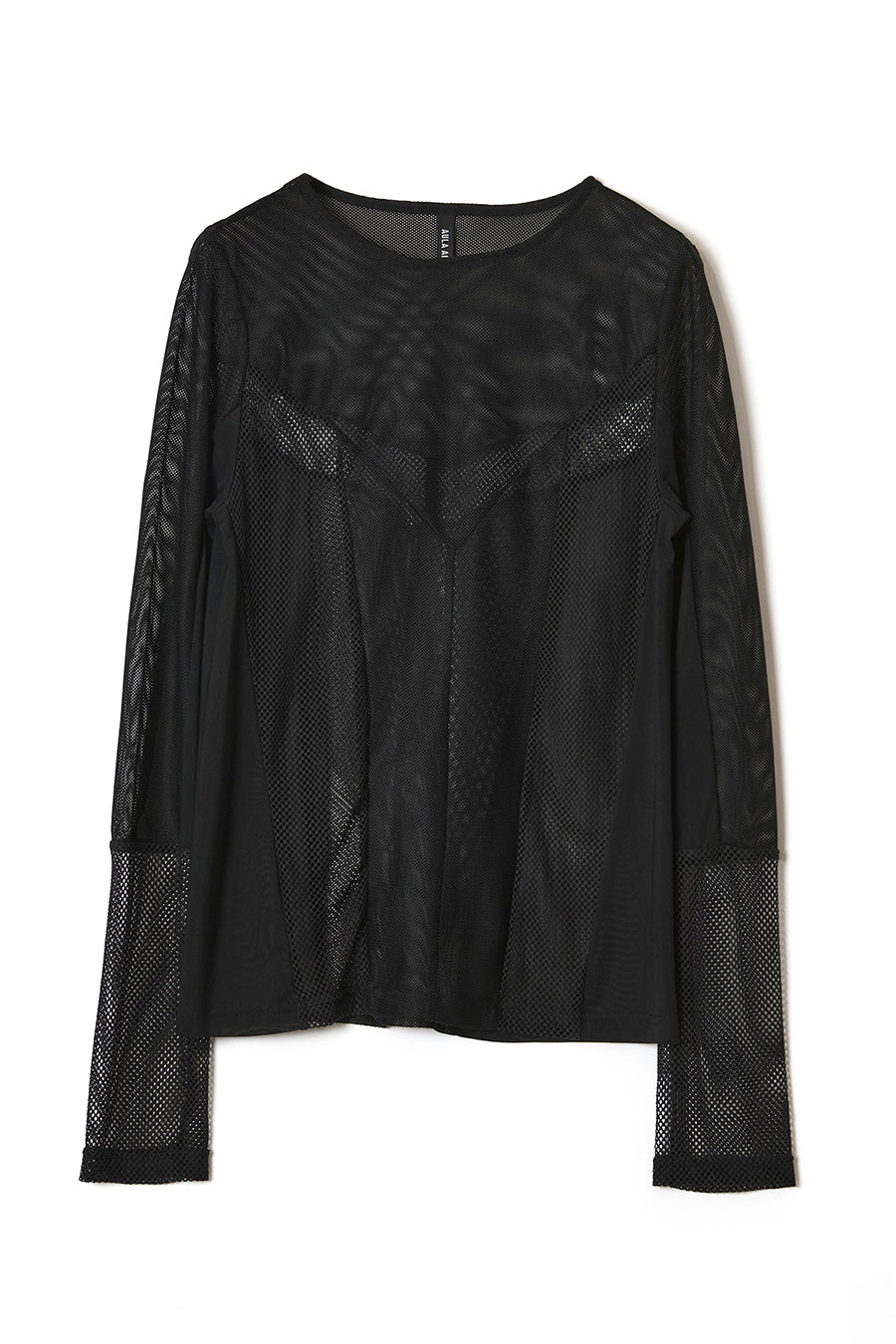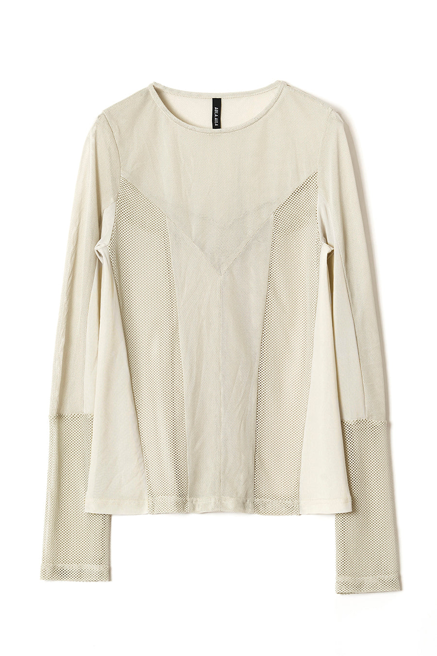 3種類のメッシュをコンビネーションしたアウラアイラらしいシアートップス。縦に切り替えを入れているので、体のラインを美しく魅せてくれる。ストレッチ性のある柔らかいメッシュは着心地が良く、バストや袖巾はゆとりのある寸法設定でストレスフリーに着用可能。細かいメッシュなのでスタイリングに合わせやすく、1枚ではもちろん、スウェットなどのインナーにして袖口からメッシュを覗かせるのもおすすめ◎。いつものスタイリングを格上げしてくれる着回し力抜群のトップス。