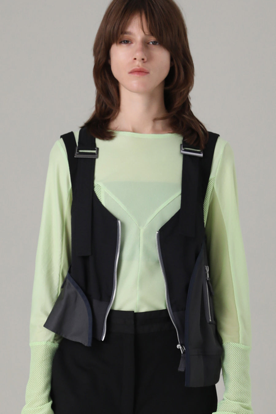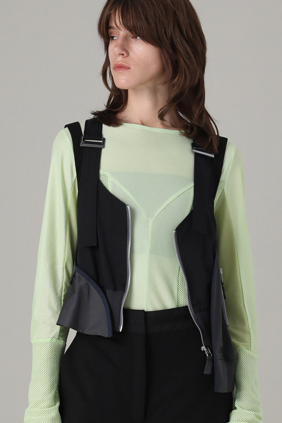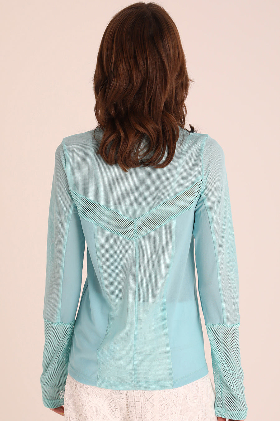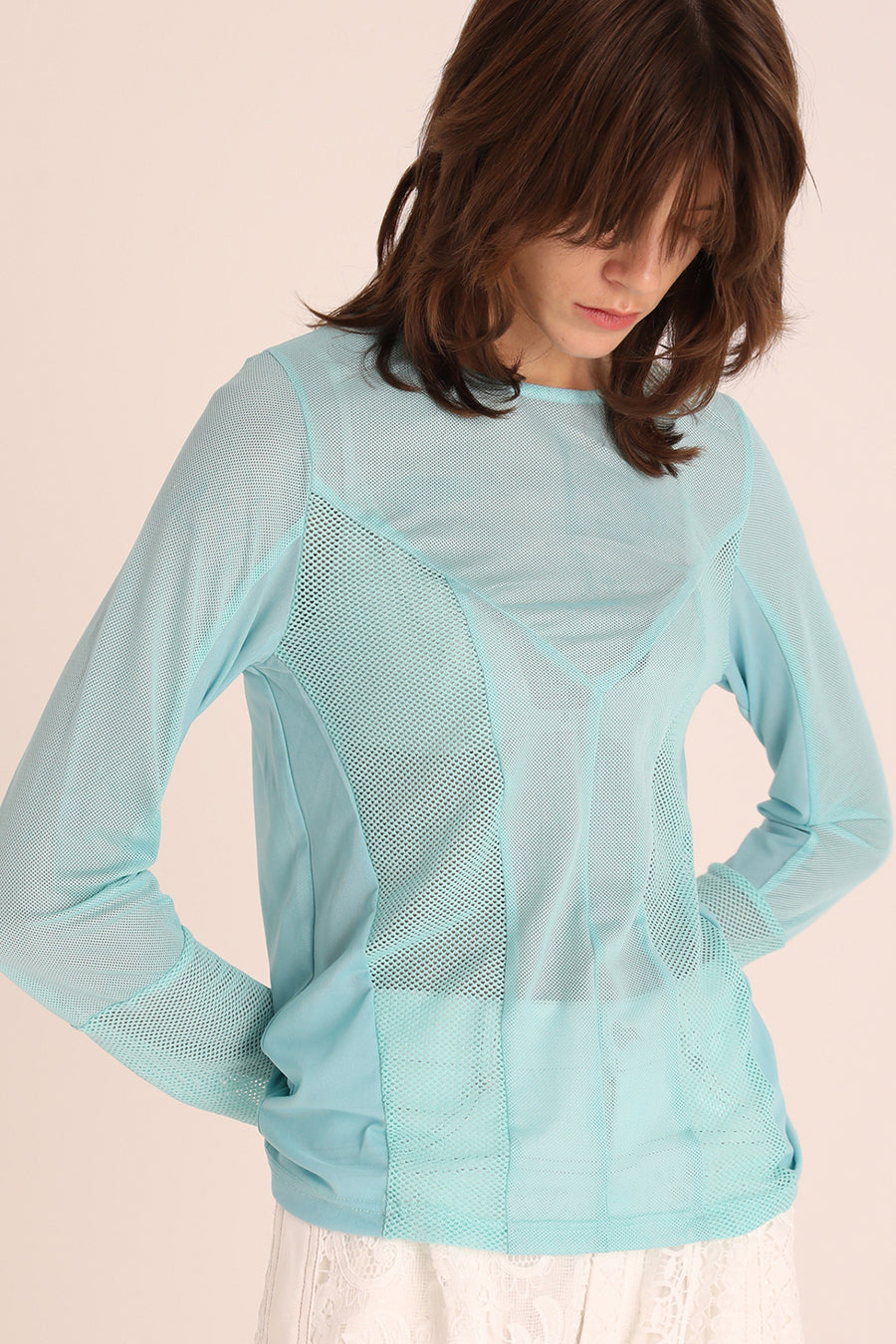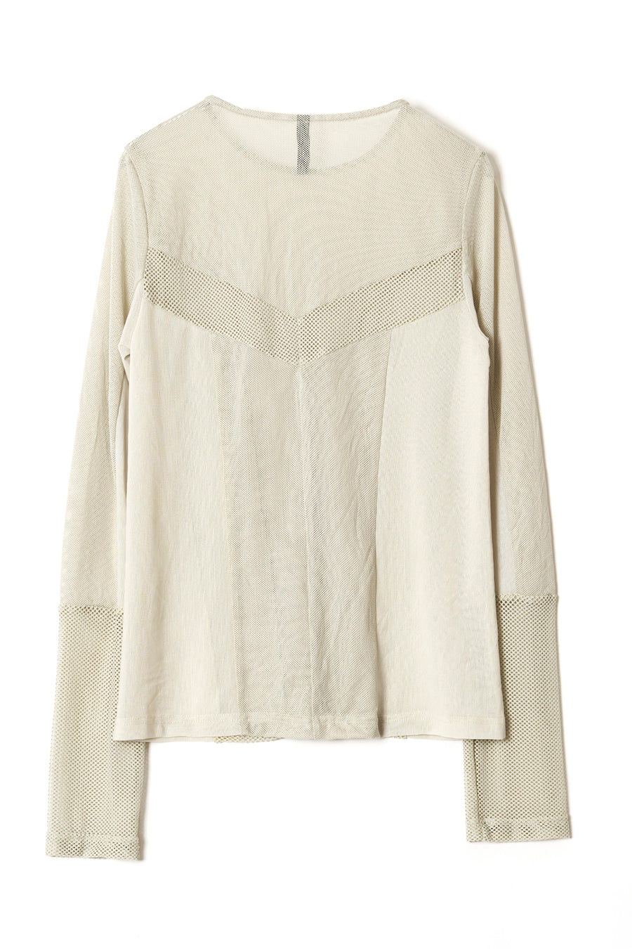 3種類のメッシュをコンビネーションしたアウラアイラらしいシアートップス。縦に切り替えを入れているので、体のラインを美しく魅せてくれる。ストレッチ性のある柔らかいメッシュは着心地が良く、バストや袖巾はゆとりのある寸法設定でストレスフリーに着用可能。細かいメッシュなのでスタイリングに合わせやすく、1枚ではもちろん、スウェットなどのインナーにして袖口からメッシュを覗かせるのもおすすめ◎。いつものスタイリングを格上げしてくれる着回し力抜群のトップス。
