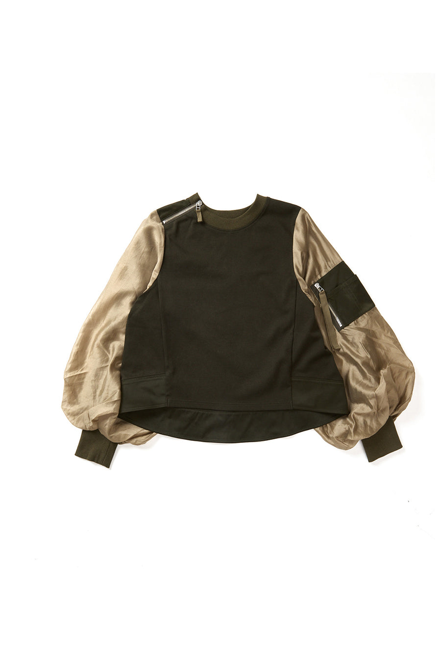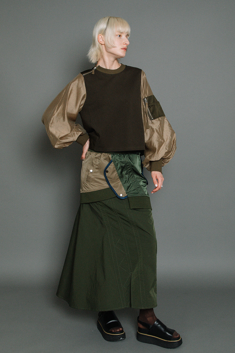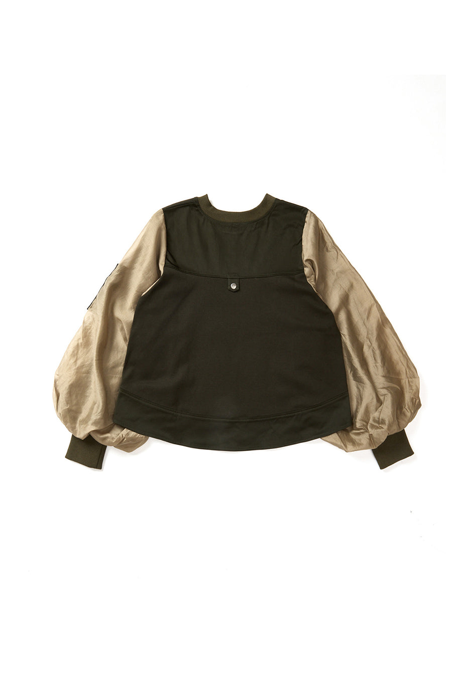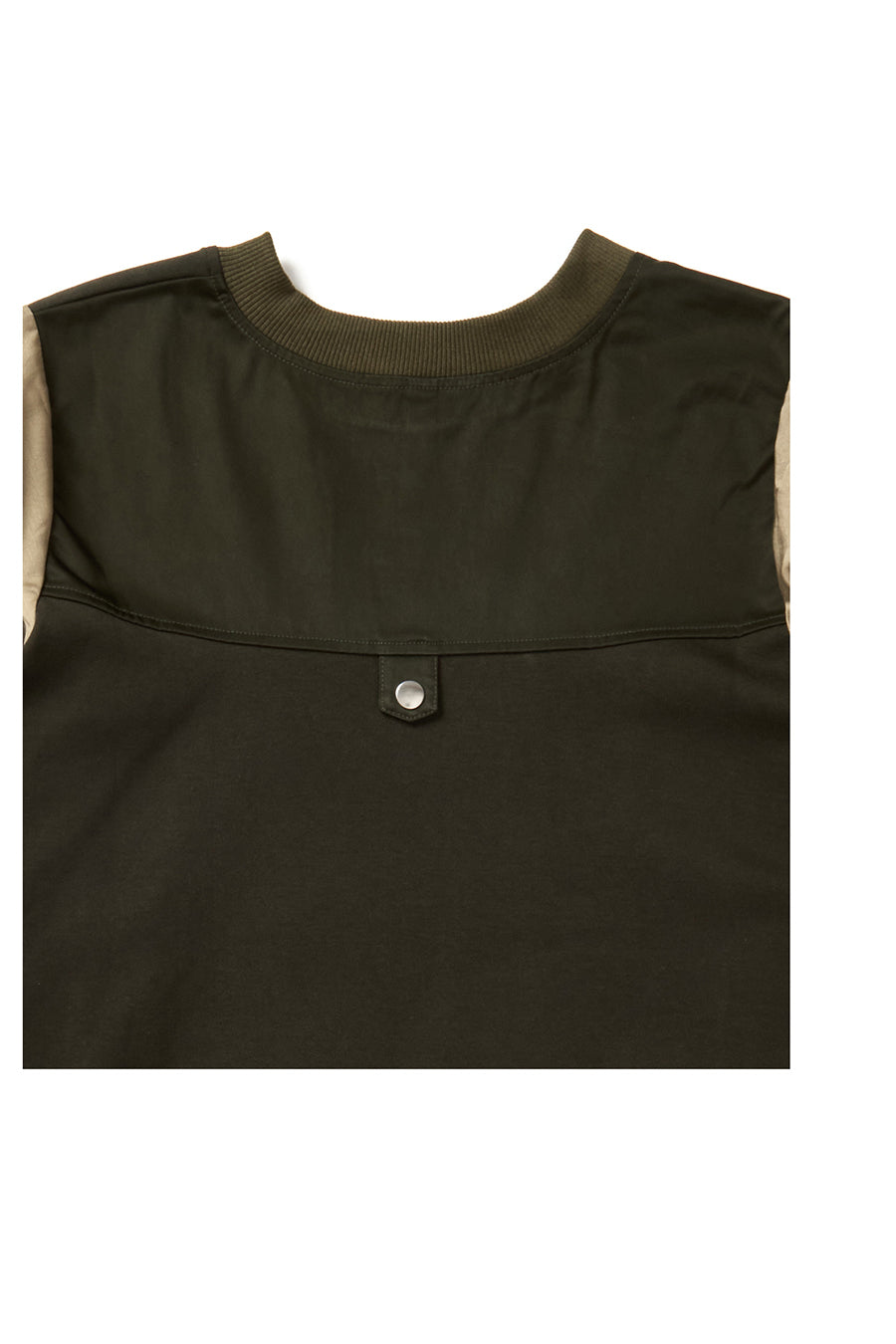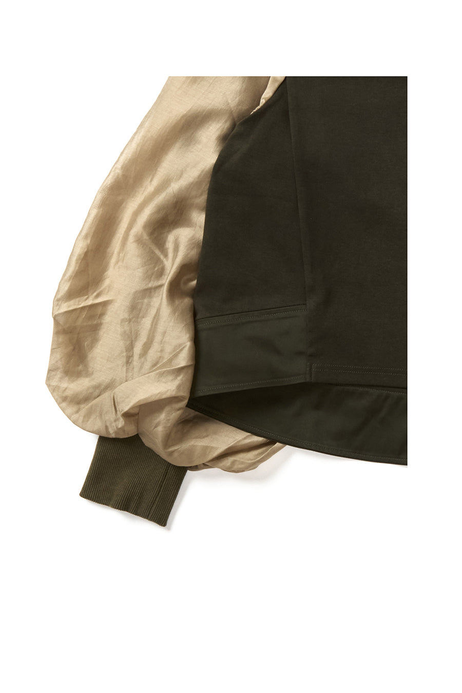 身頃はコットンスムース、袖はシアー素材、そのほか袖ポケットやバックスタイスにはナイロンツイルと、異素材をコンビネーションしたミリタリーテイストのトップス。