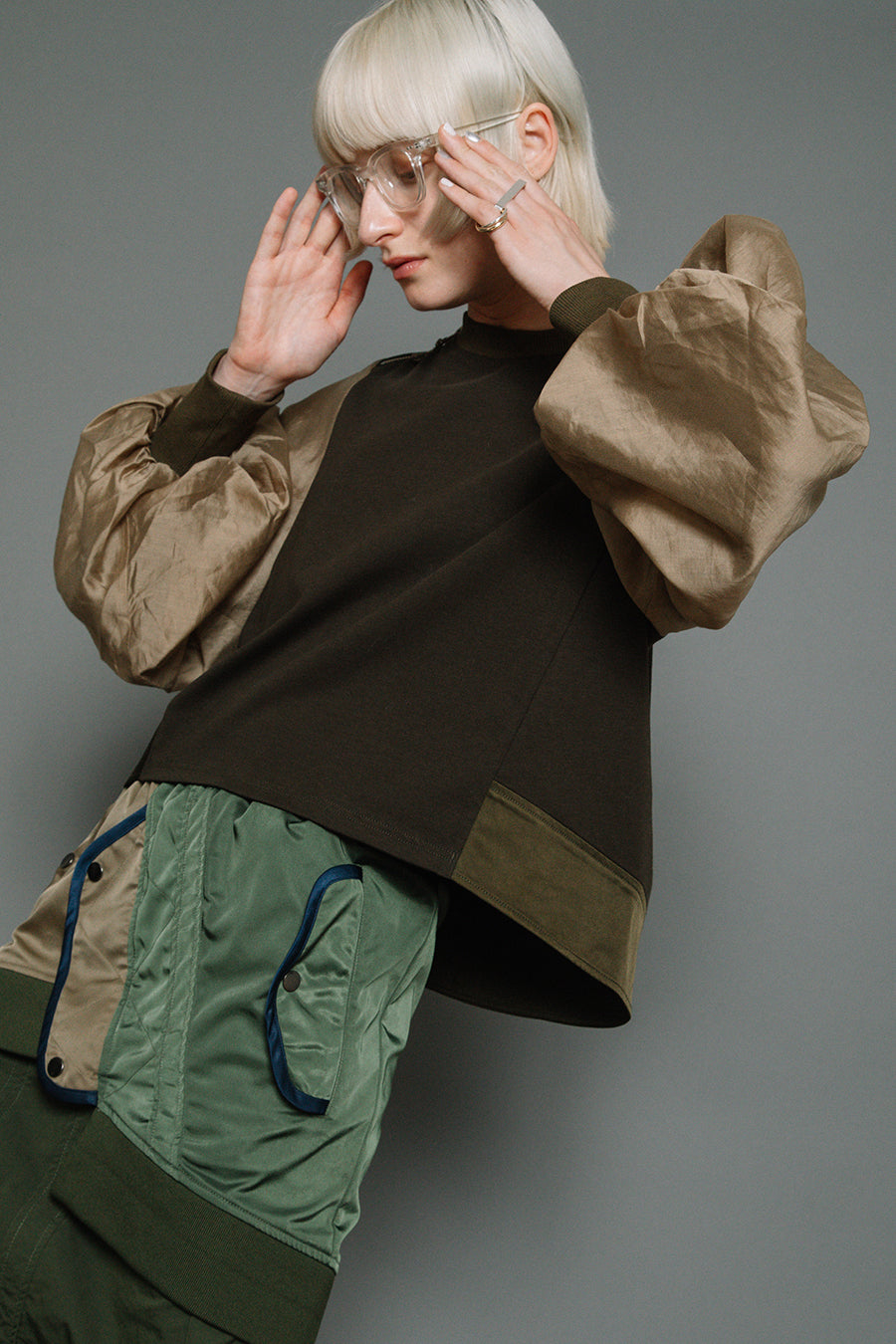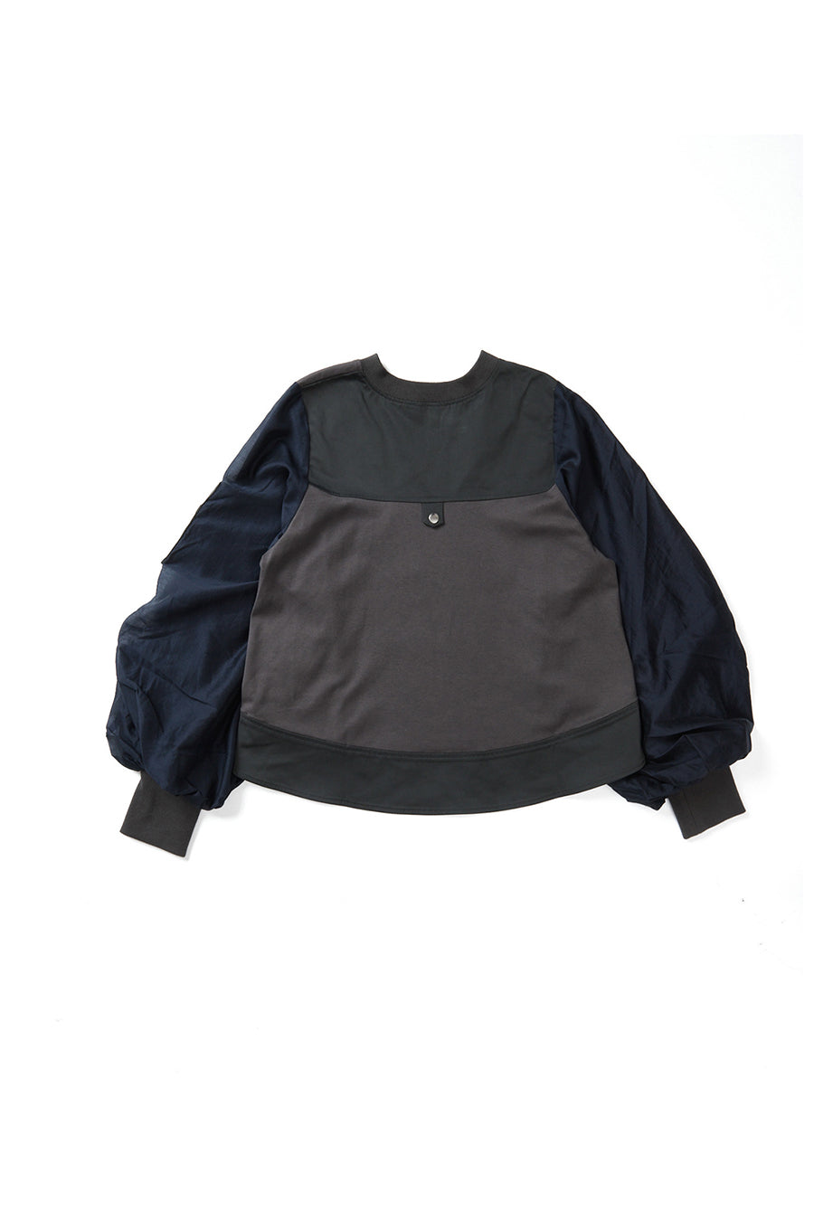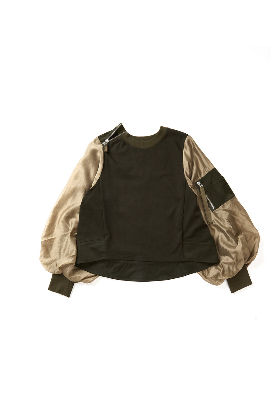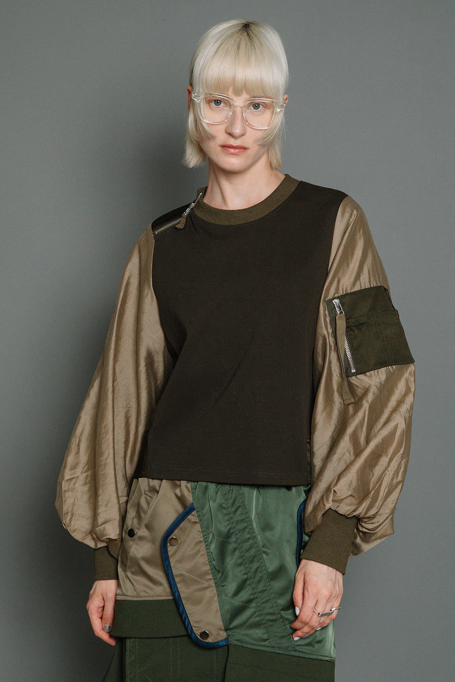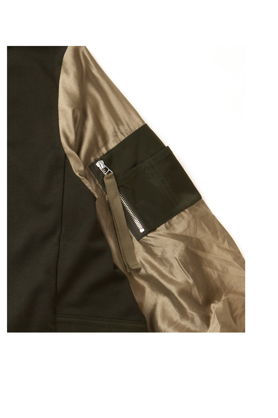 身頃はコットンスムース、袖はシアー素材、そのほか袖ポケットやバックスタイスにはナイロンツイルと、異素材をコンビネーションしたミリタリーテイストのトップス。
