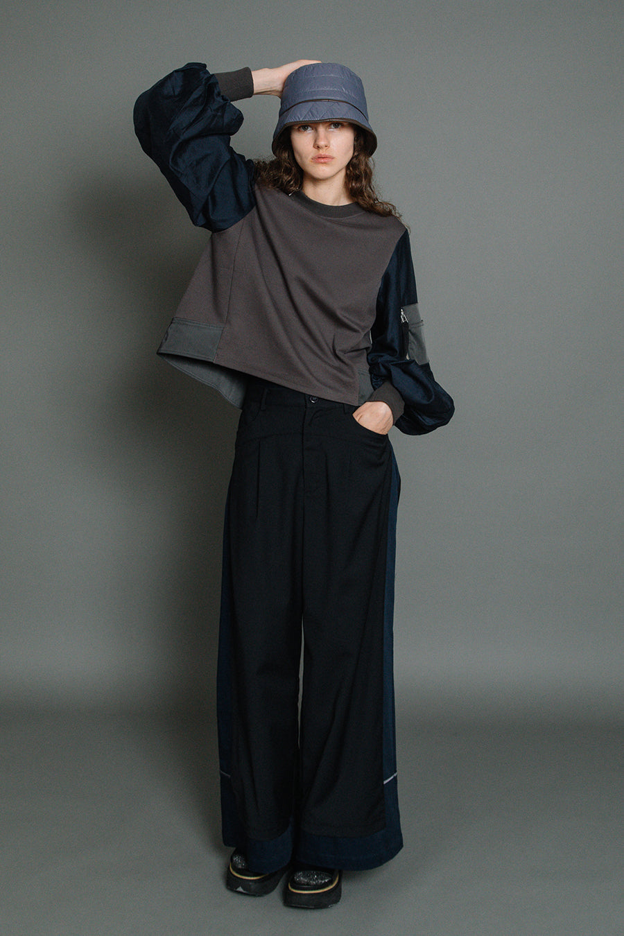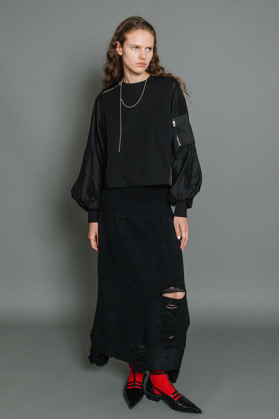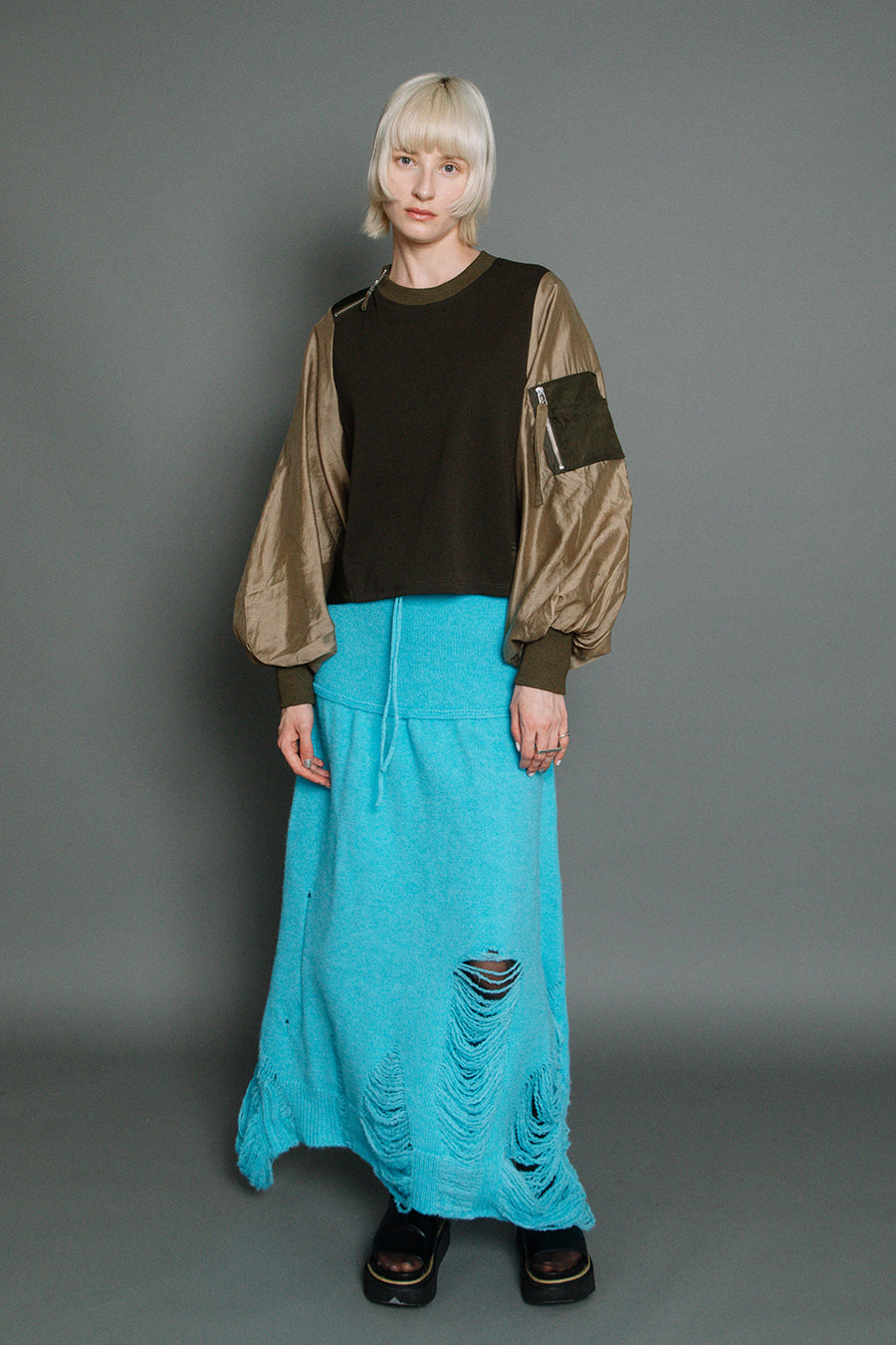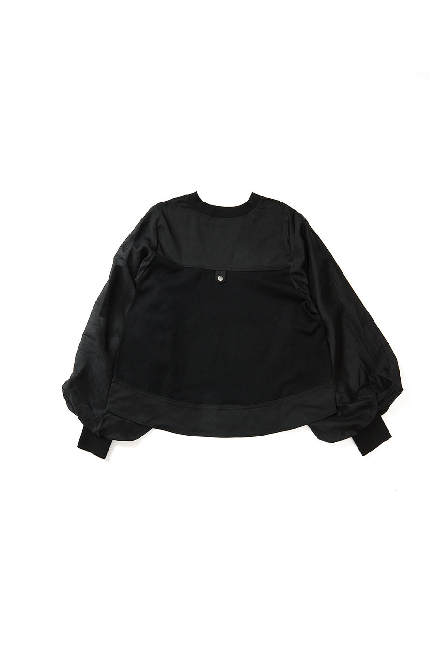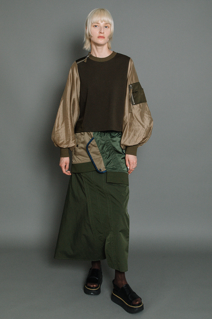身頃はコットンスムース、袖はシアー素材、そのほか袖ポケットやバックスタイスにはナイロンツイルと、異素材をコンビネーションしたミリタリーテイストのトップス。