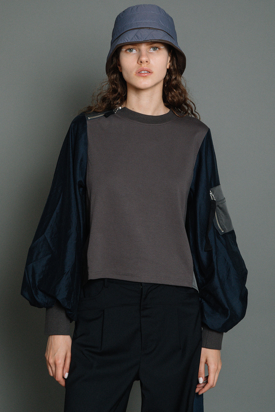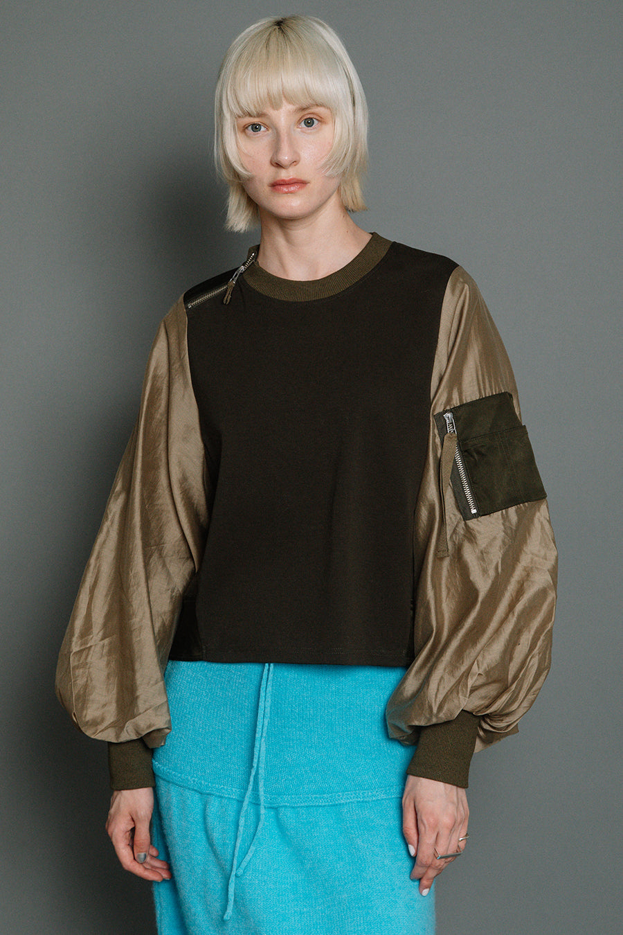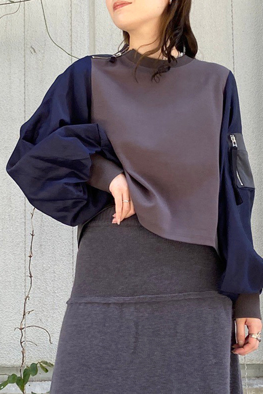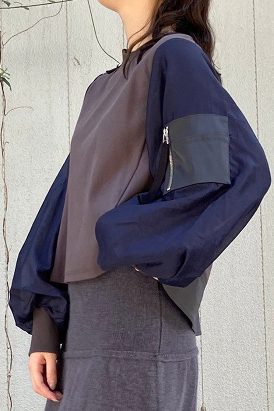袖は、MA-1ブルゾンのような、ジップ付きポケットが付いていて、袖口はボリューミーなバルーン袖。