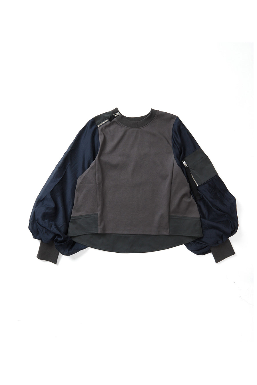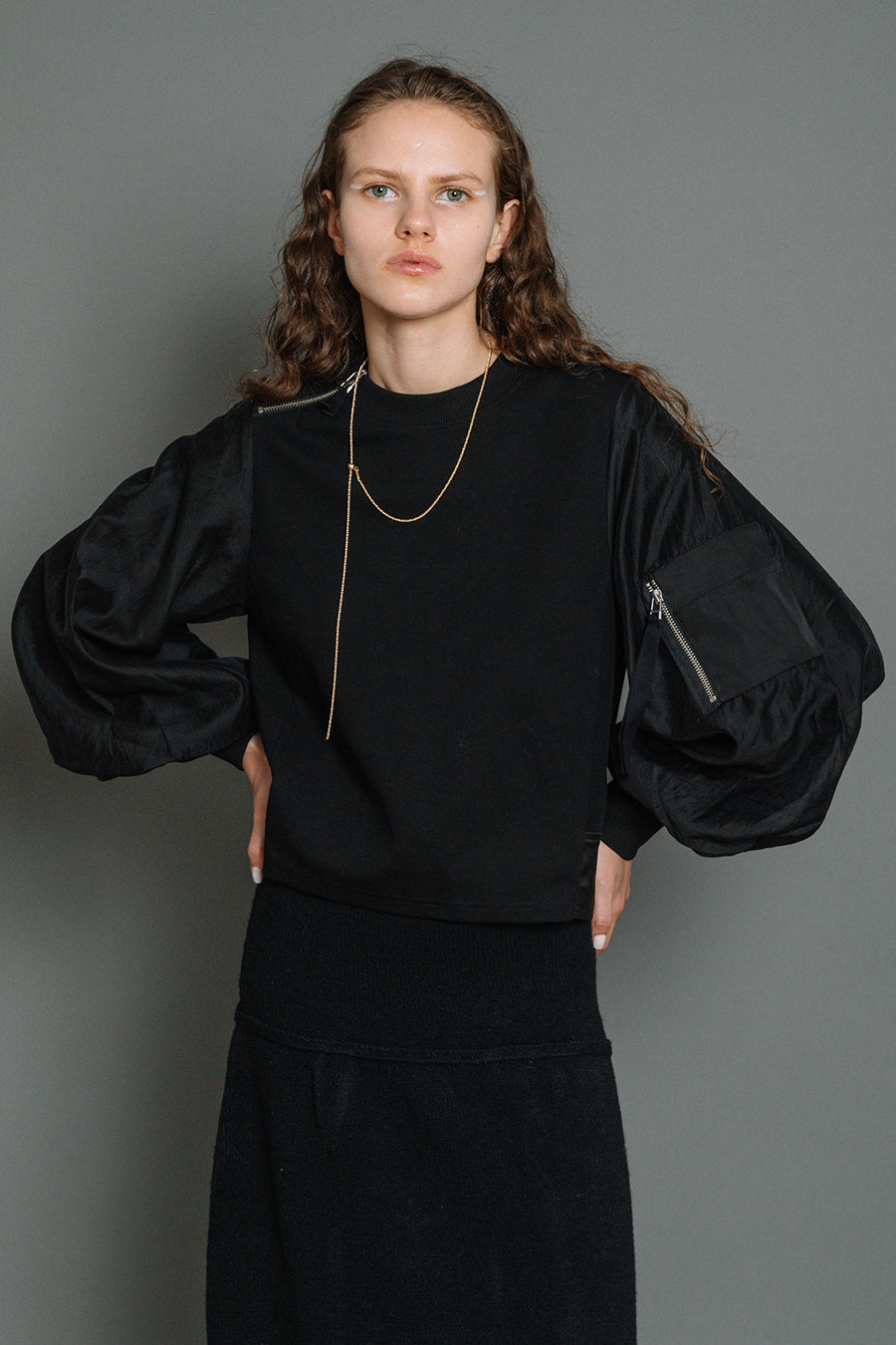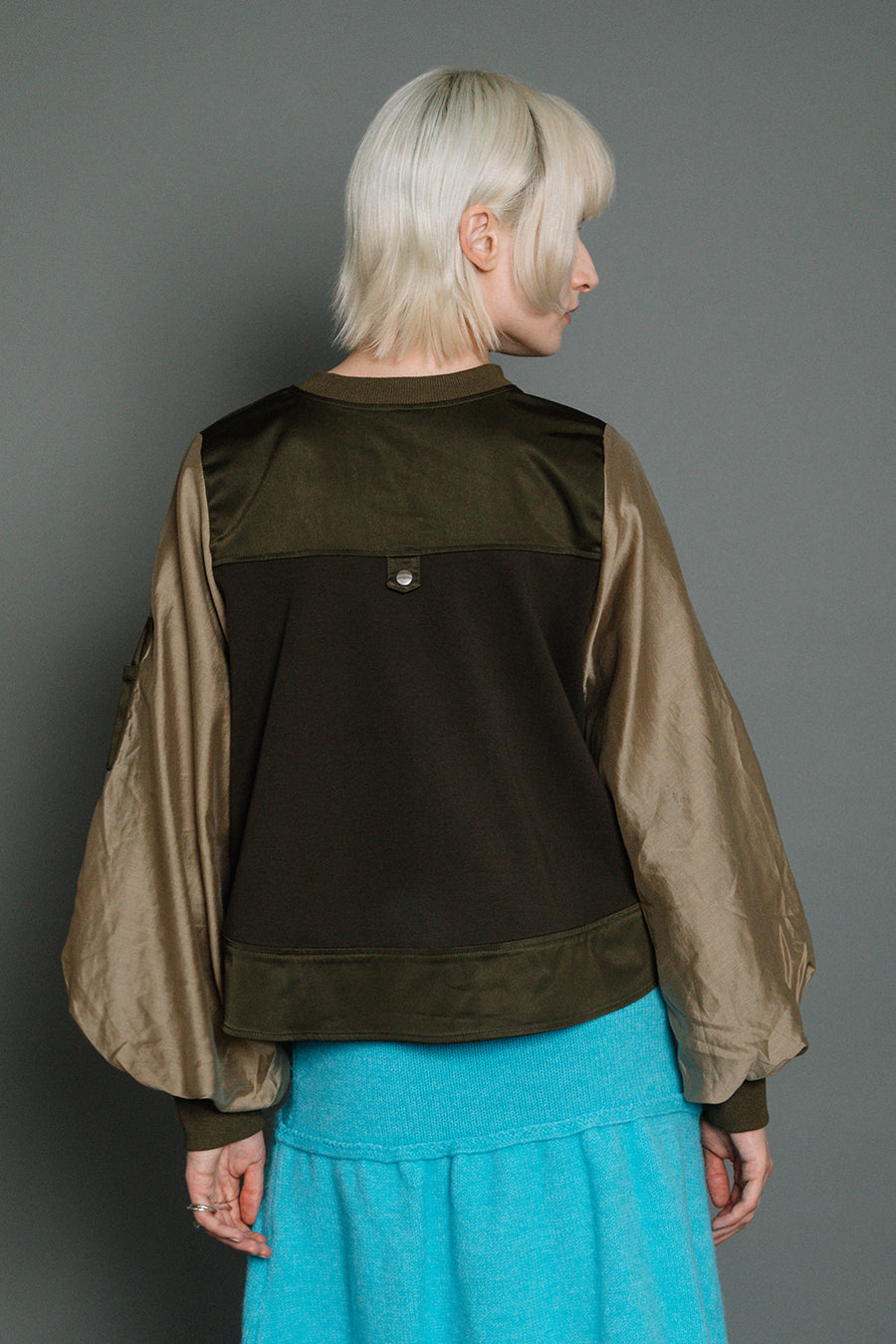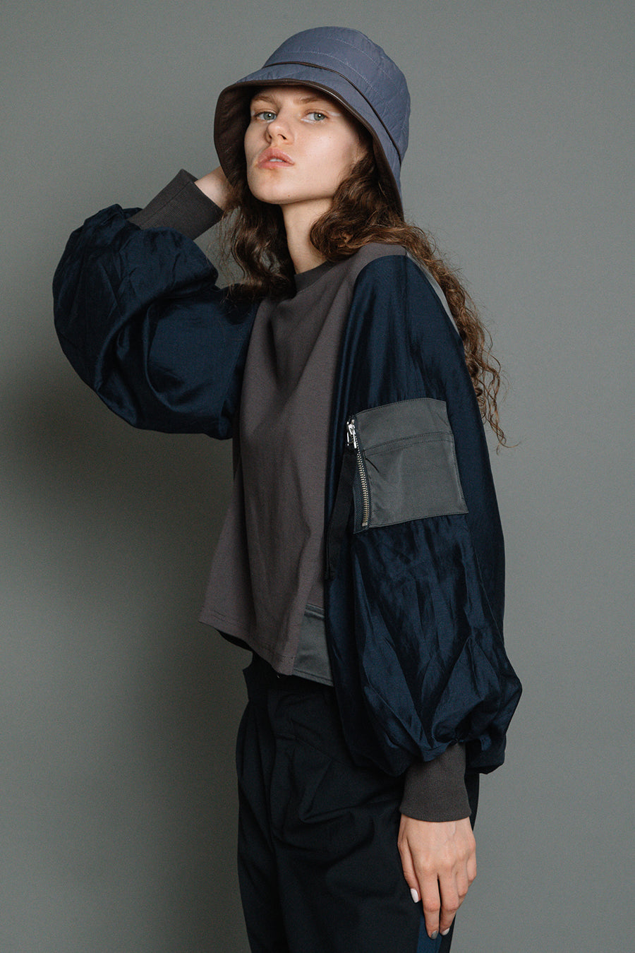 袖は、MA-1ブルゾンのような、ジップ付きポケットが付いていて、袖口はボリューミーなバルーン袖。