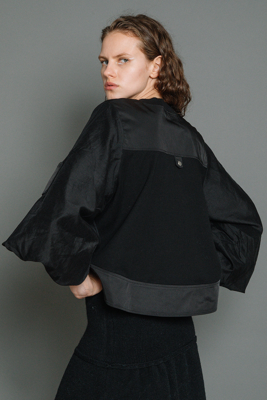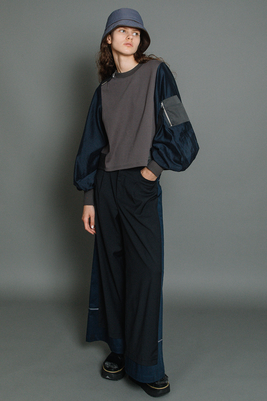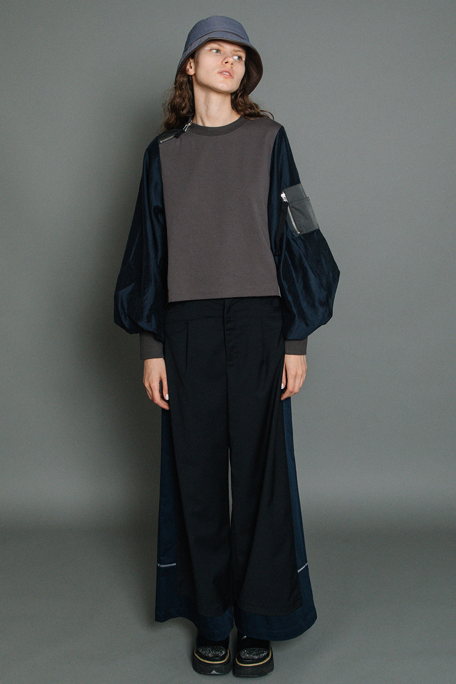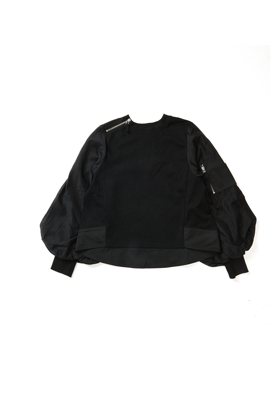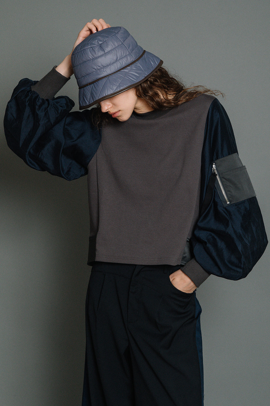 袖は、MA-1ブルゾンのような、ジップ付きポケットが付いていて、袖口はボリューミーなバルーン袖。