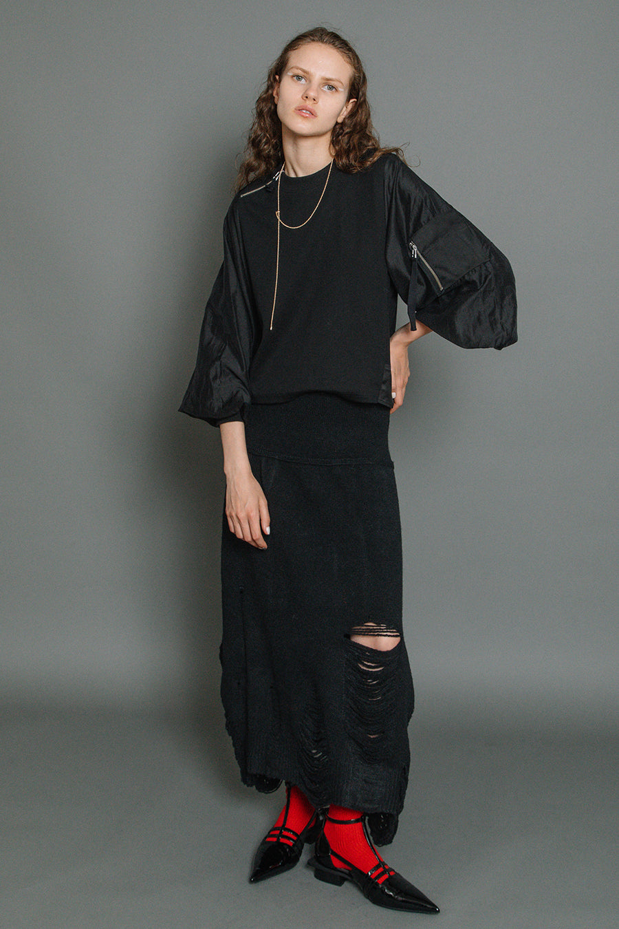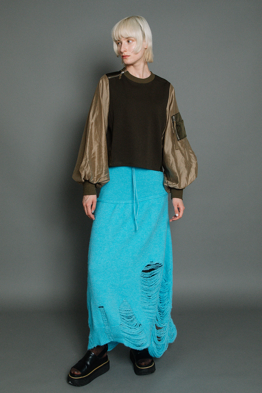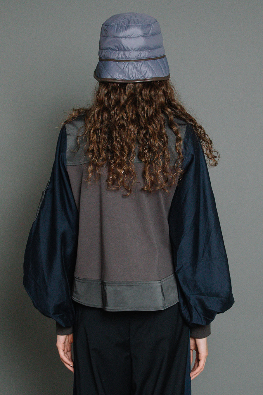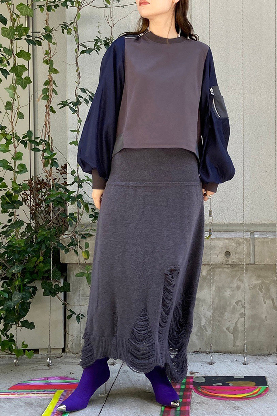 袖は、MA-1ブルゾンのような、ジップ付きポケットが付いていて、袖口はボリューミーなバルーン袖。