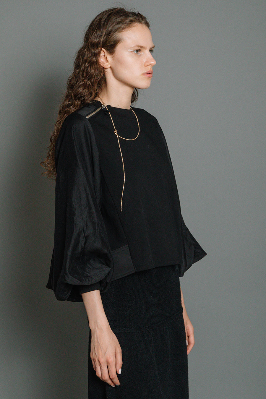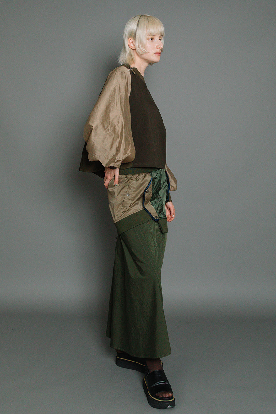 ヨーク下のタブドット釦もアクセントに。右肩部分はジップ開きで、素肌を少し見せたり、インナーにハイネックを合わせて見せても◎。フェミニンなシルエットと、ミリタリーディティールのミックスされたデザイン。