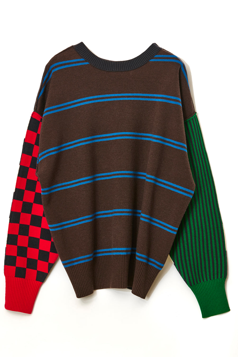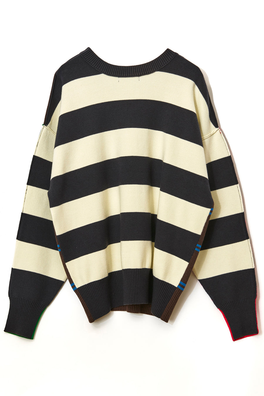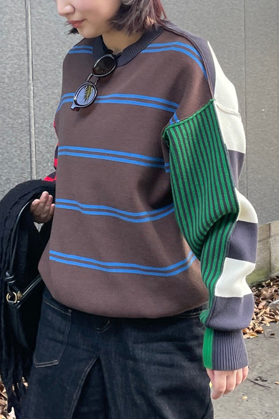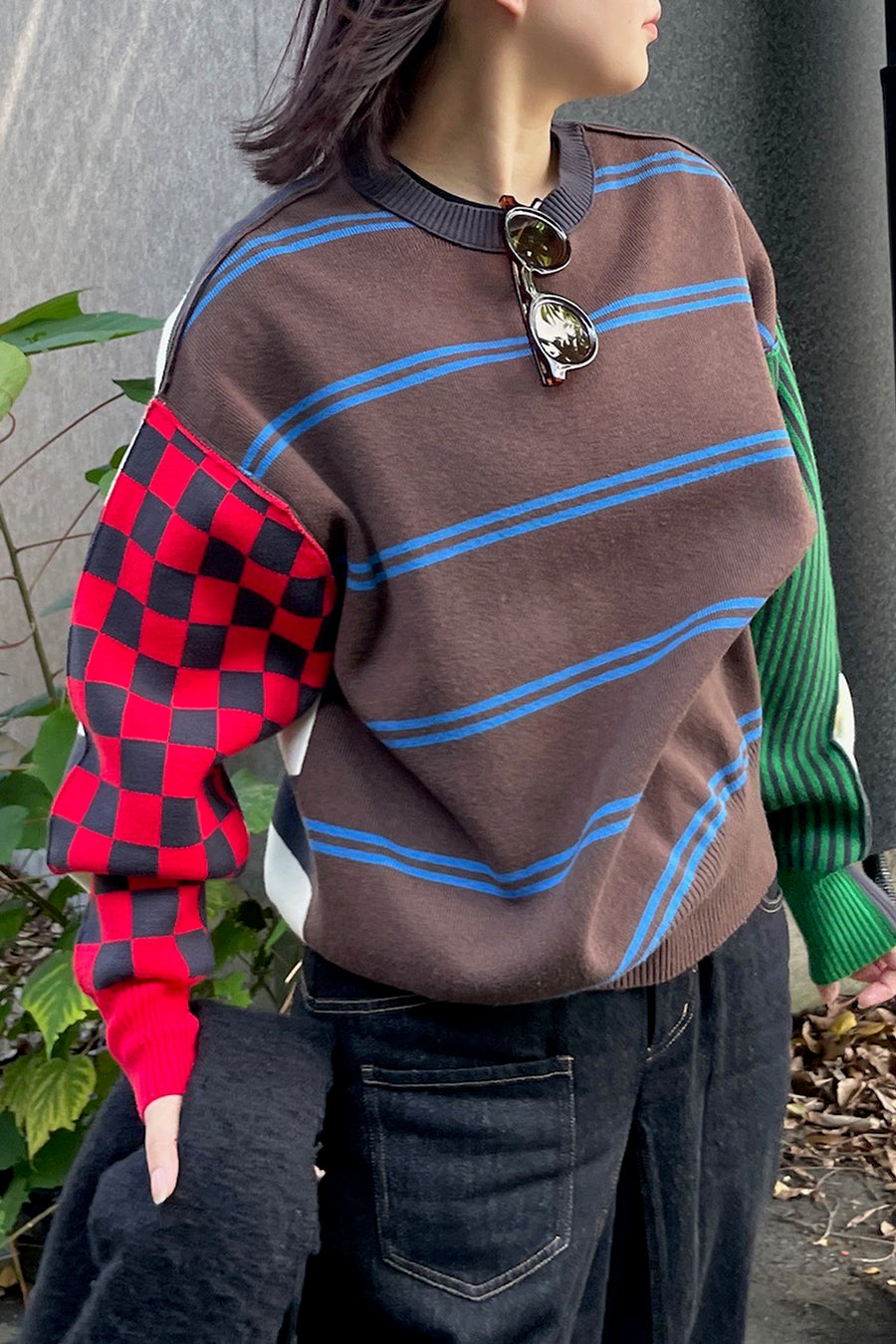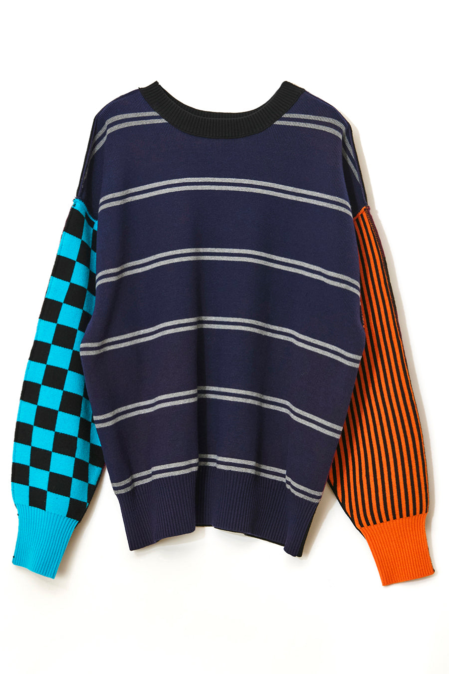 身頃の前後が違う太ボーダーで、袖は右がブロックチェック、左はストライプの4種類の柄をコンビネーションし、更に配色も6色と多様したマルチボーダーカラーニット。ポップなマルチカラーが、遊びのあるアイテムで、他にはないデザインが目を惹く。リンキングの糸端は敢えて表に出して抜け感のある雰囲気に仕上げている。レーヨン、ポリエステル、ナイロンの混紡糸の12Gゴム編みで、もちもちした肌触りは、心地良く人気な実績のある糸を使用。キックバックも良く、型崩れしにくい。