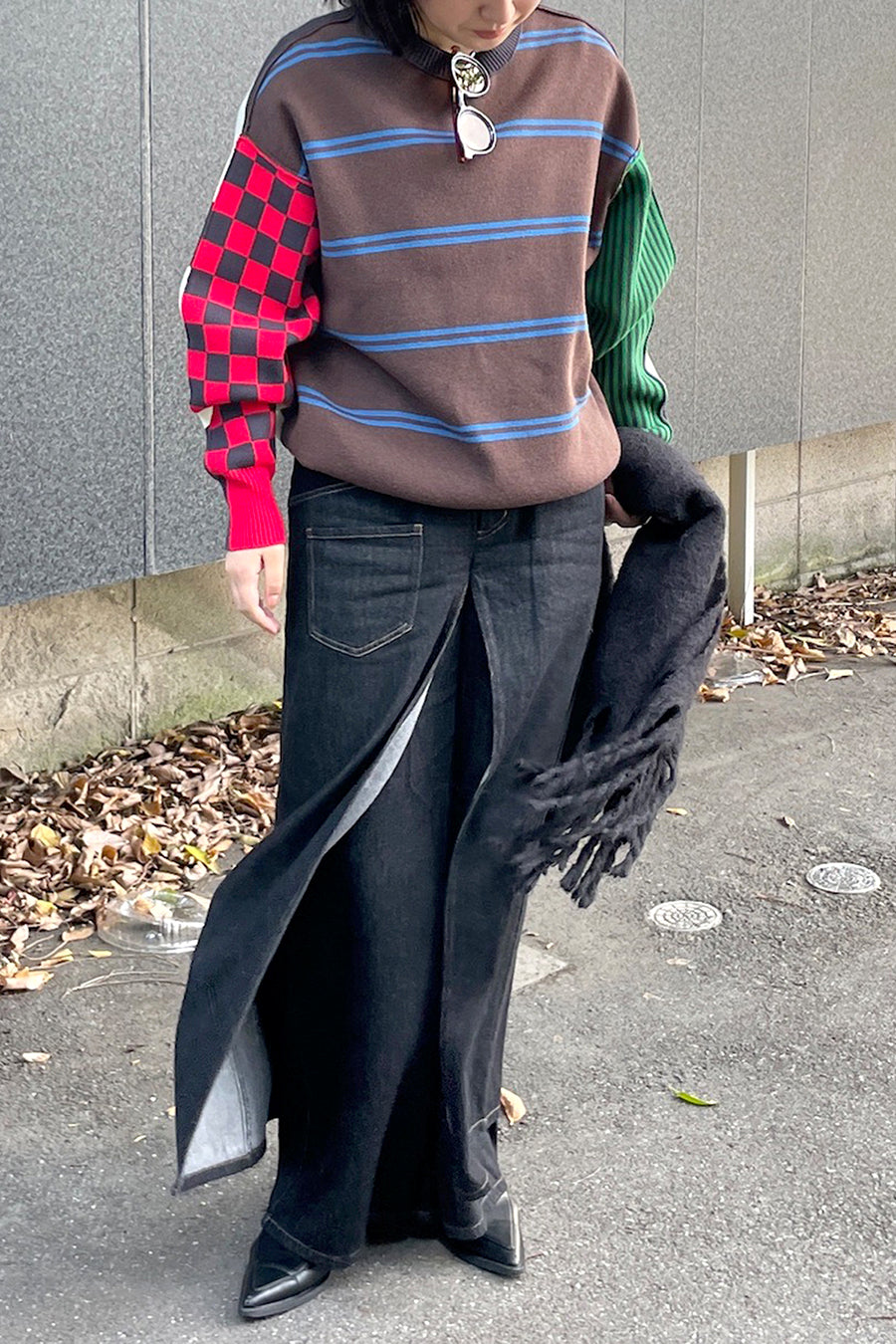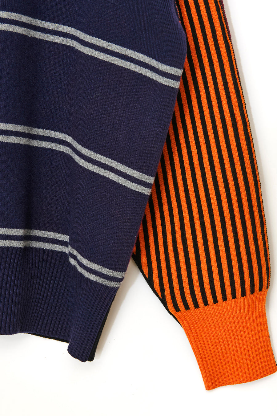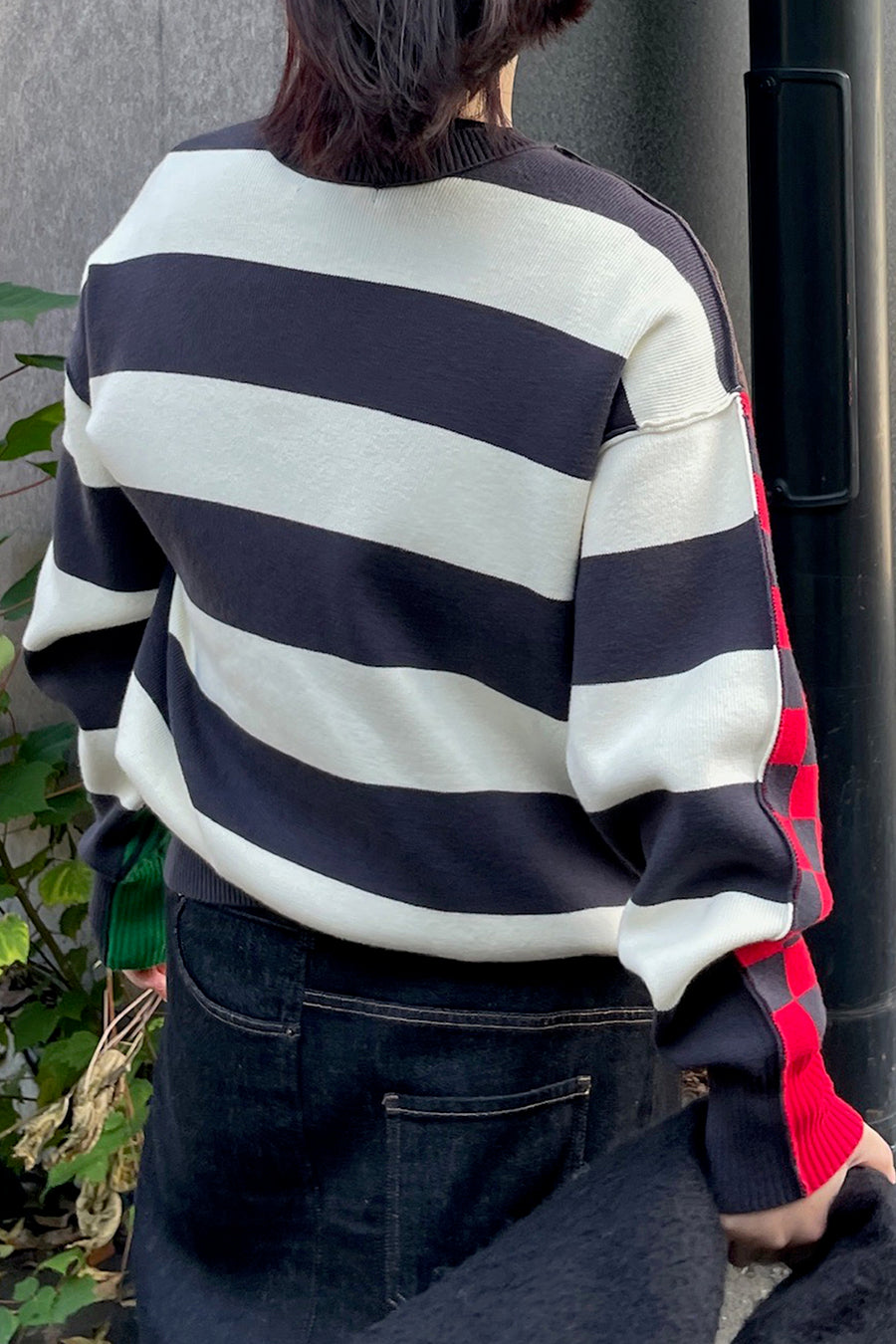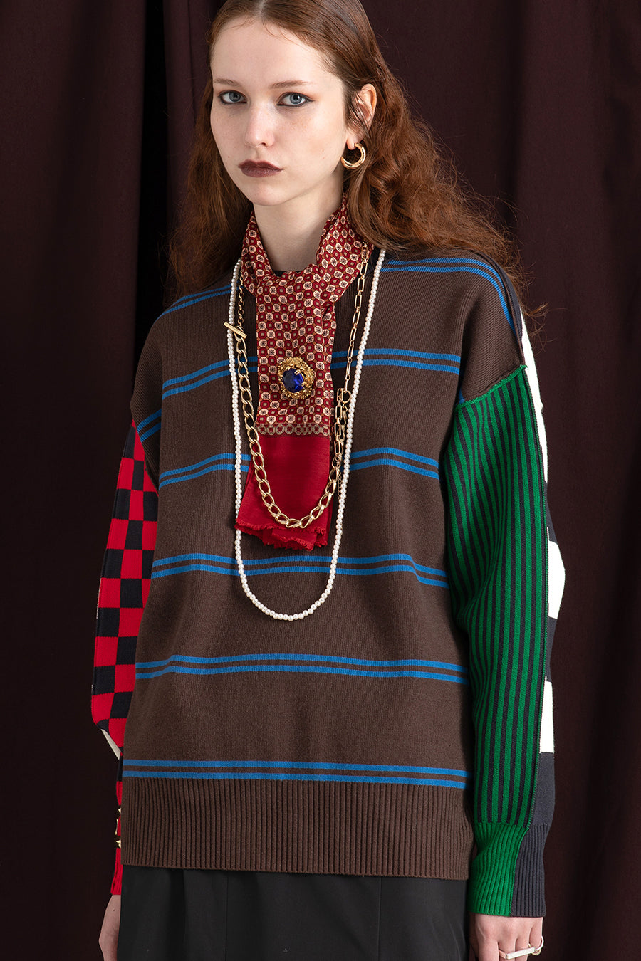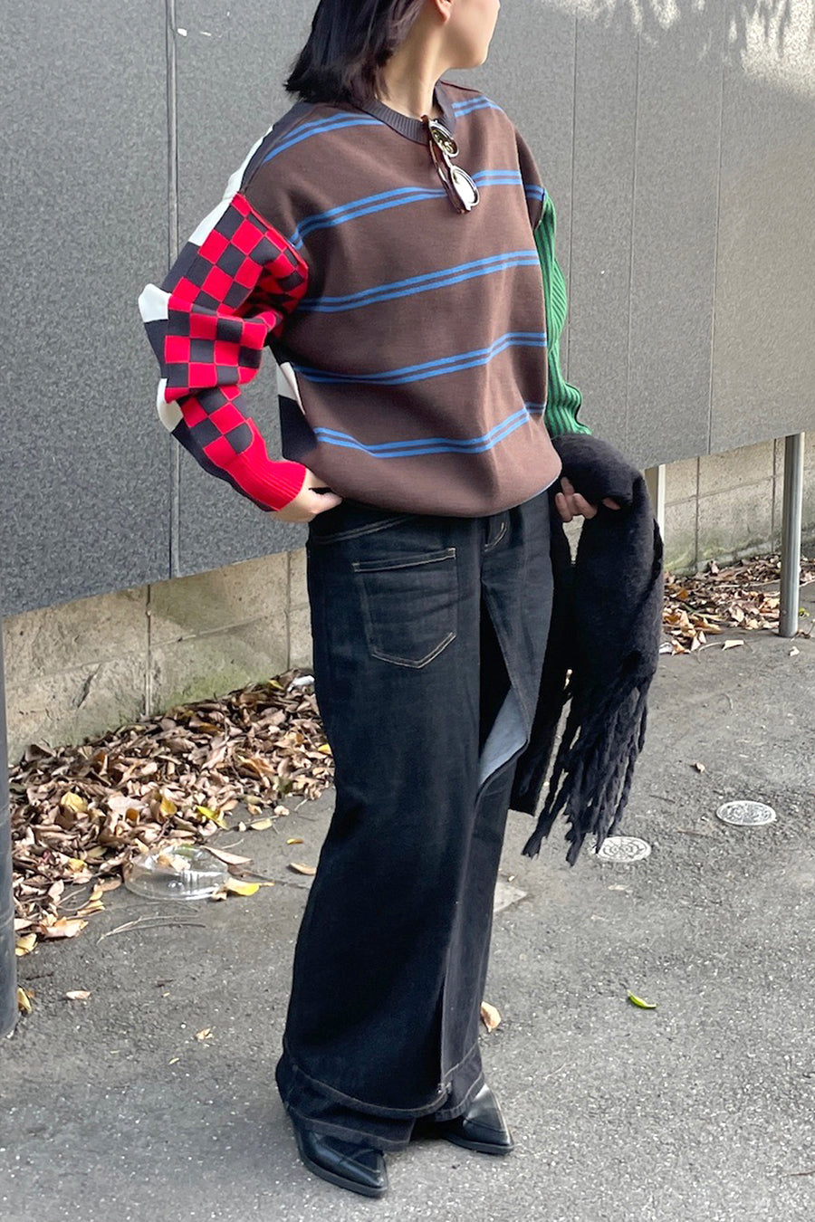 身頃の前後が違う太ボーダーで、袖は右がブロックチェック、左はストライプの4種類の柄をコンビネーションし、更に配色も6色と多様したマルチボーダーカラーニット。ポップなマルチカラーが、遊びのあるアイテムで、他にはないデザインが目を惹く。リンキングの糸端は敢えて表に出して抜け感のある雰囲気に仕上げている。レーヨン、ポリエステル、ナイロンの混紡糸の12Gゴム編みで、もちもちした肌触りは、心地良く人気な実績のある糸を使用。キックバックも良く、型崩れしにくい。