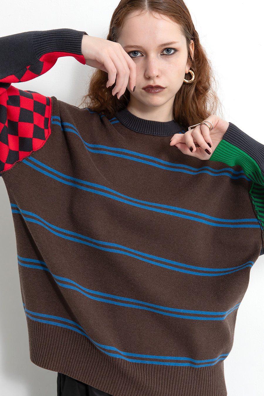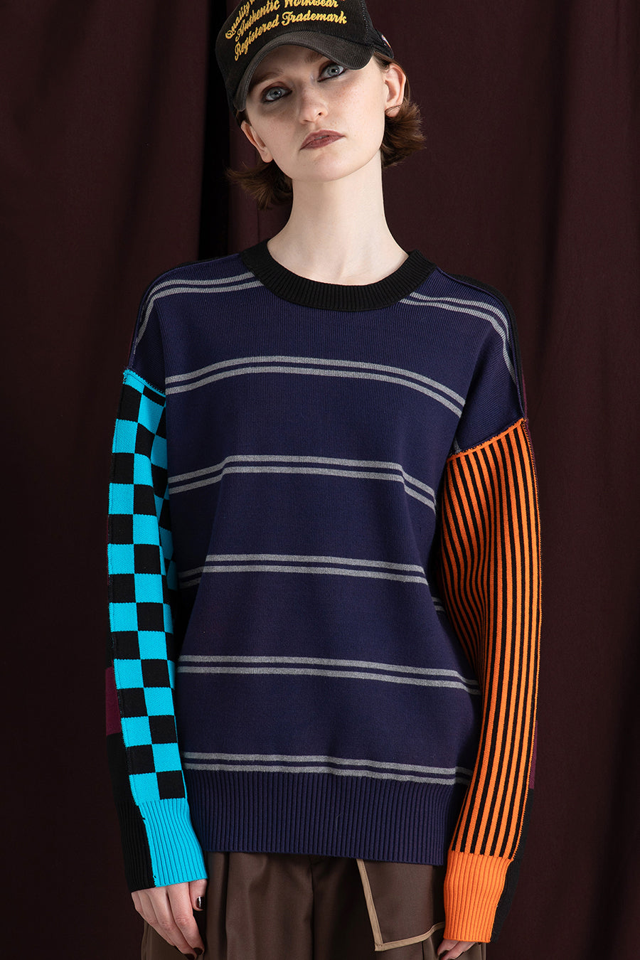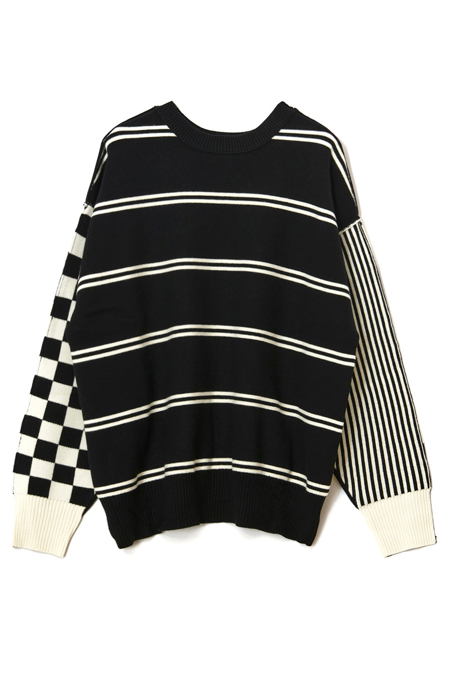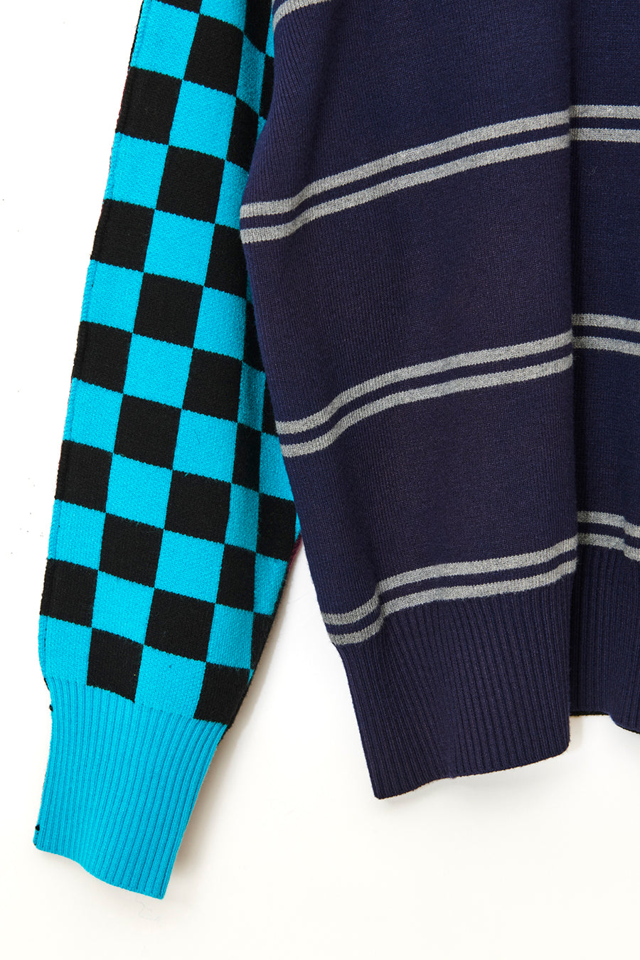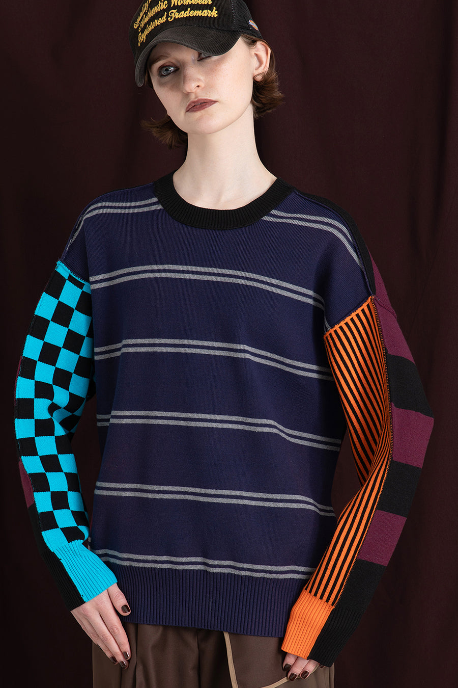 身頃の前後が違う太ボーダーで、袖は右がブロックチェック、左はストライプの4種類の柄をコンビネーションし、更に配色も6色と多様したマルチボーダーカラーニット。ポップなマルチカラーが、遊びのあるアイテムで、他にはないデザインが目を惹く。リンキングの糸端は敢えて表に出して抜け感のある雰囲気に仕上げている。レーヨン、ポリエステル、ナイロンの混紡糸の12Gゴム編みで、もちもちした肌触りは、心地良く人気な実績のある糸を使用。キックバックも良く、型崩れしにくい。