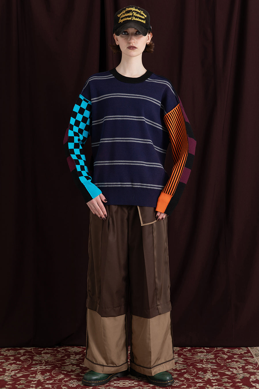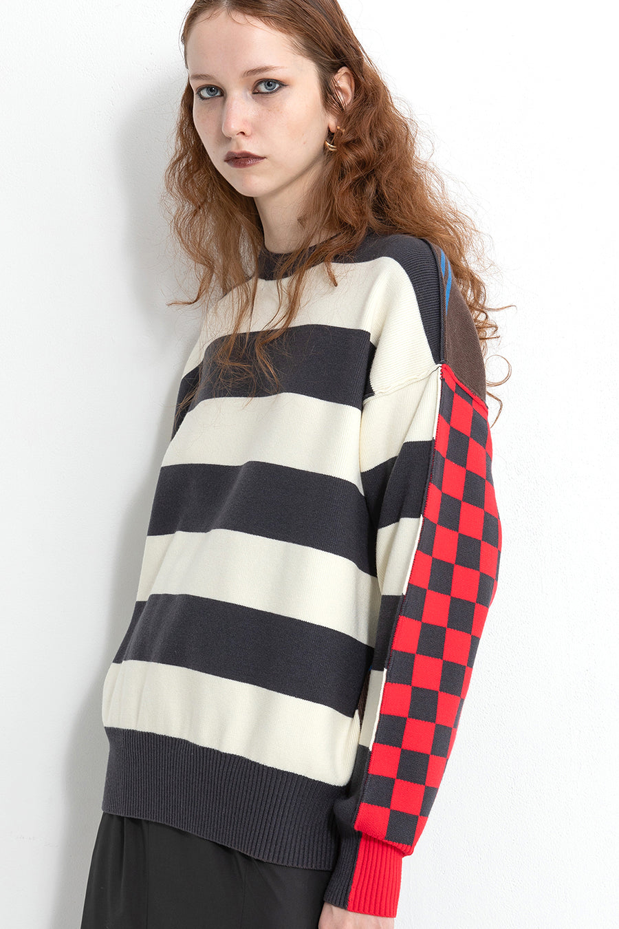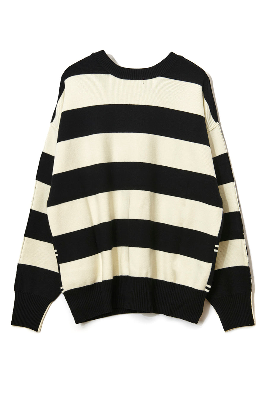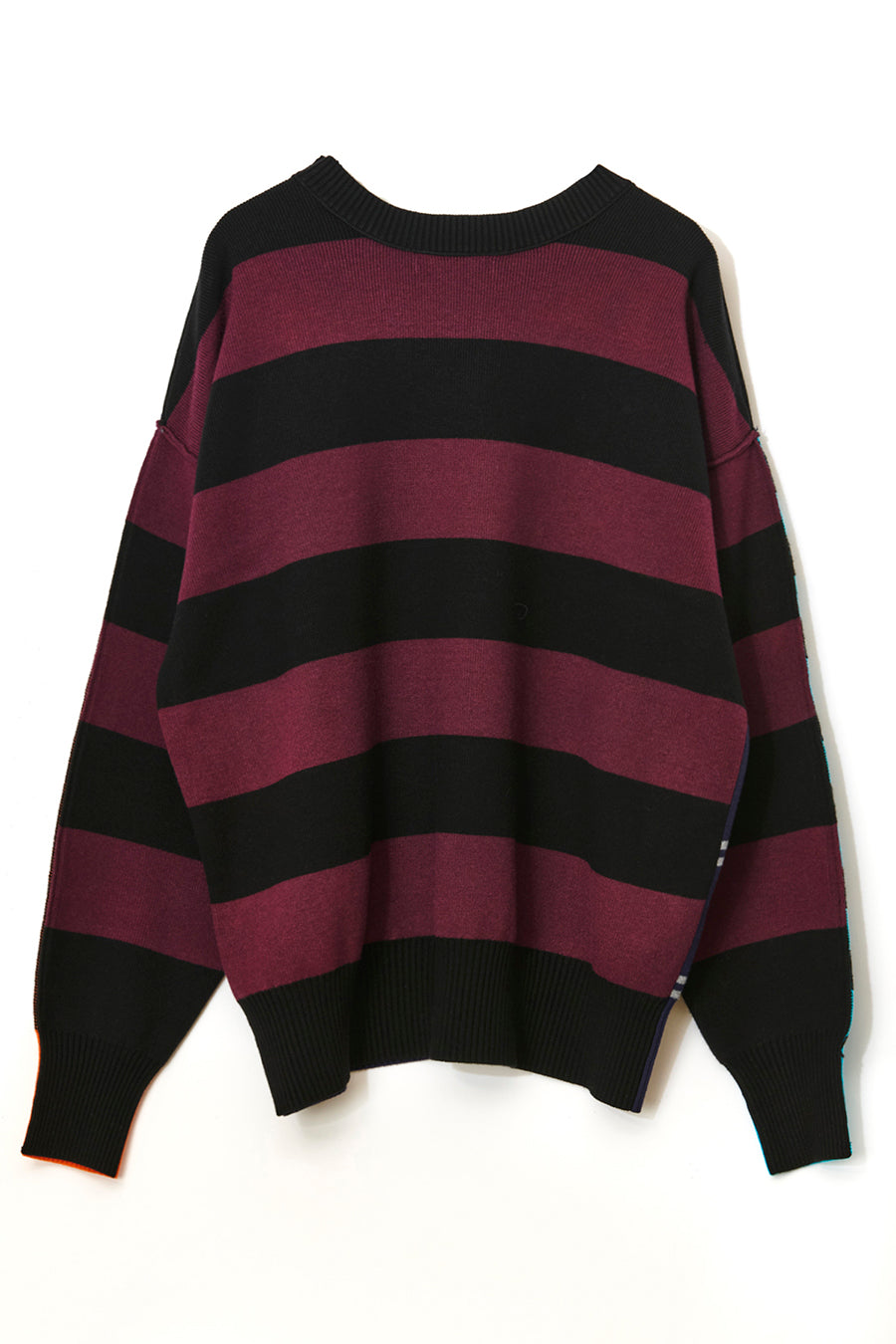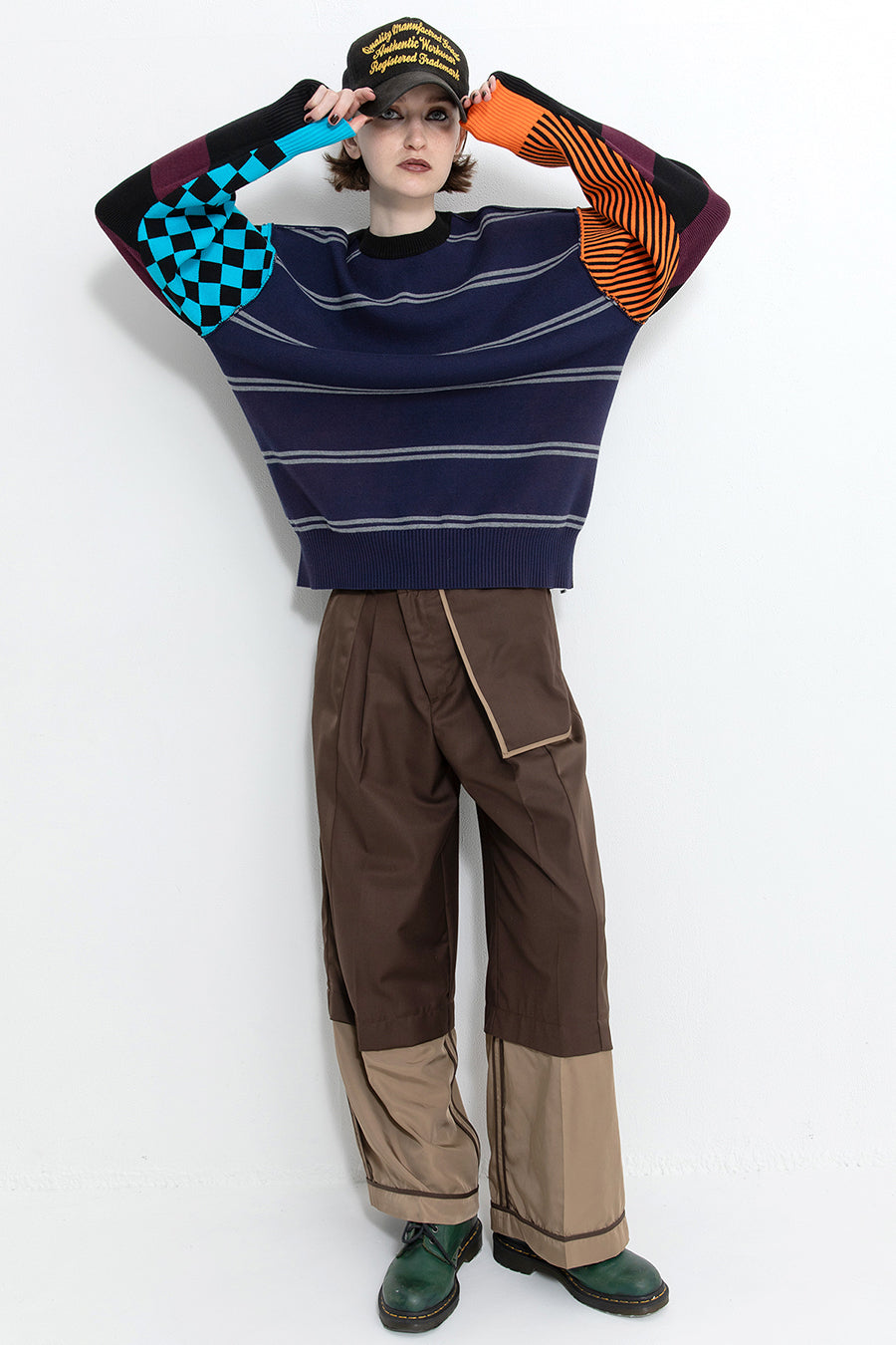 身頃の前後が違う太ボーダーで、袖は右がブロックチェック、左はストライプの4種類の柄をコンビネーションし、更に配色も6色と多様したマルチボーダーカラーニット。ポップなマルチカラーが、遊びのあるアイテムで、他にはないデザインが目を惹く。リンキングの糸端は敢えて表に出して抜け感のある雰囲気に仕上げている。レーヨン、ポリエステル、ナイロンの混紡糸の12Gゴム編みで、もちもちした肌触りは、心地良く人気な実績のある糸を使用。キックバックも良く、型崩れしにくい。