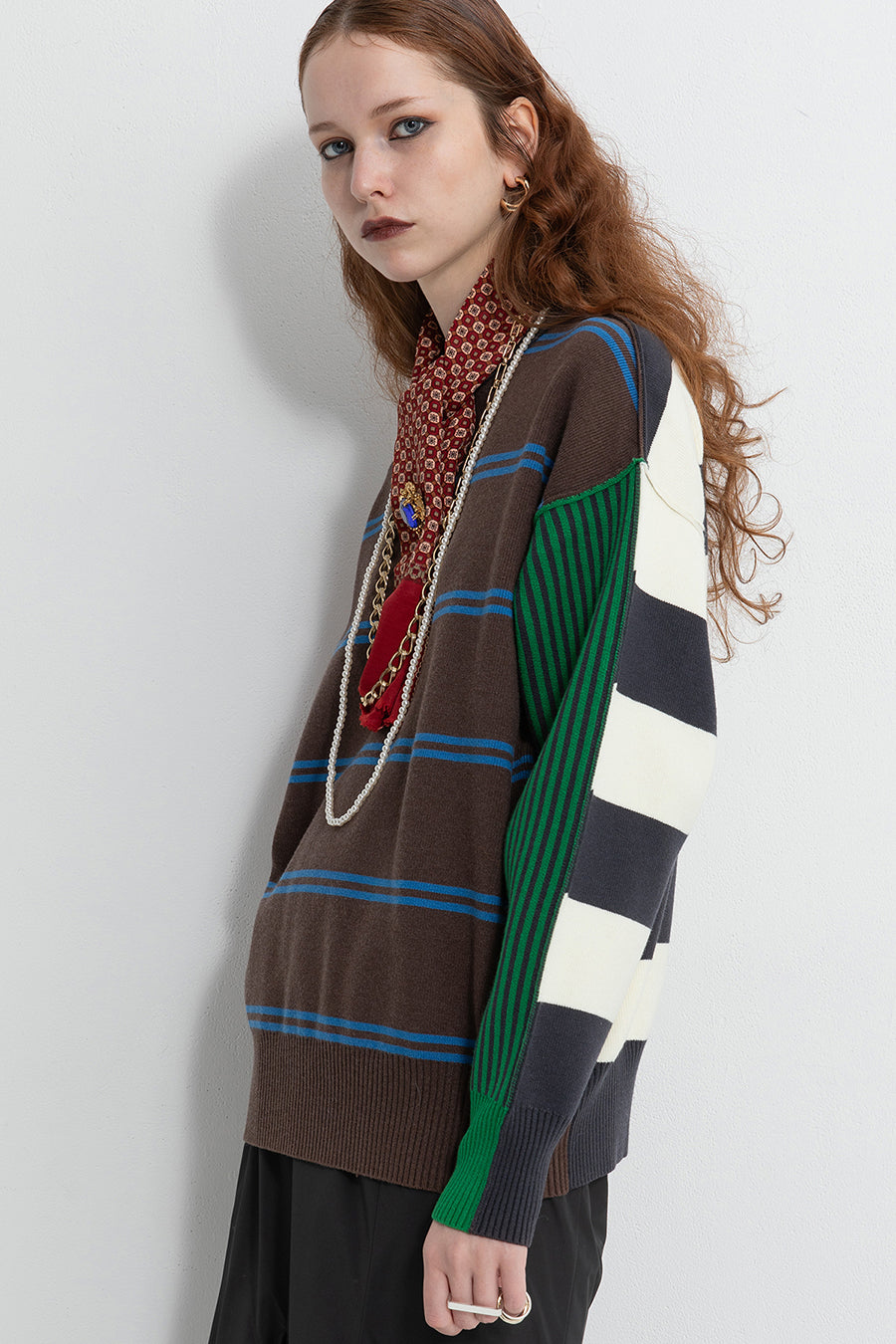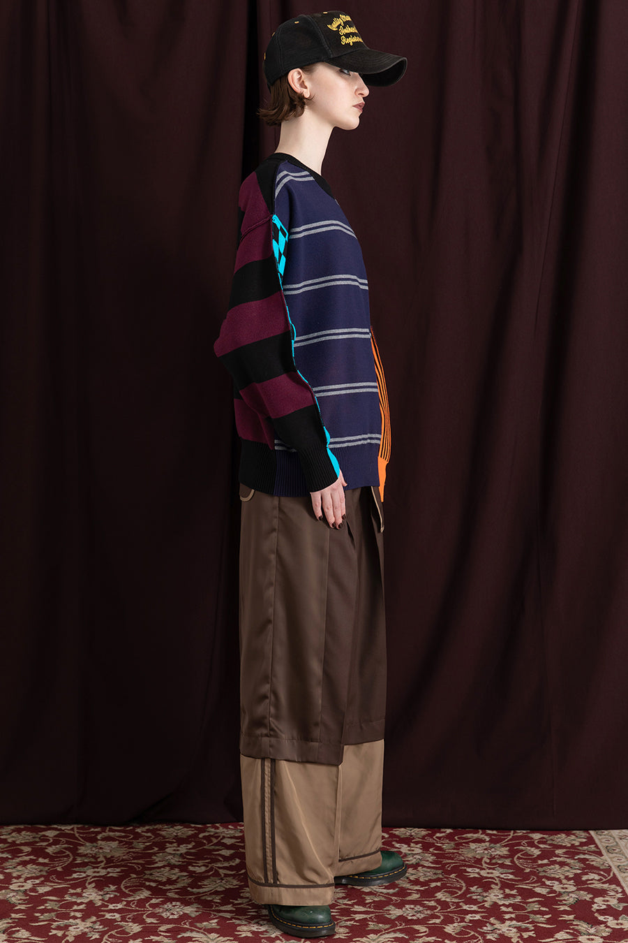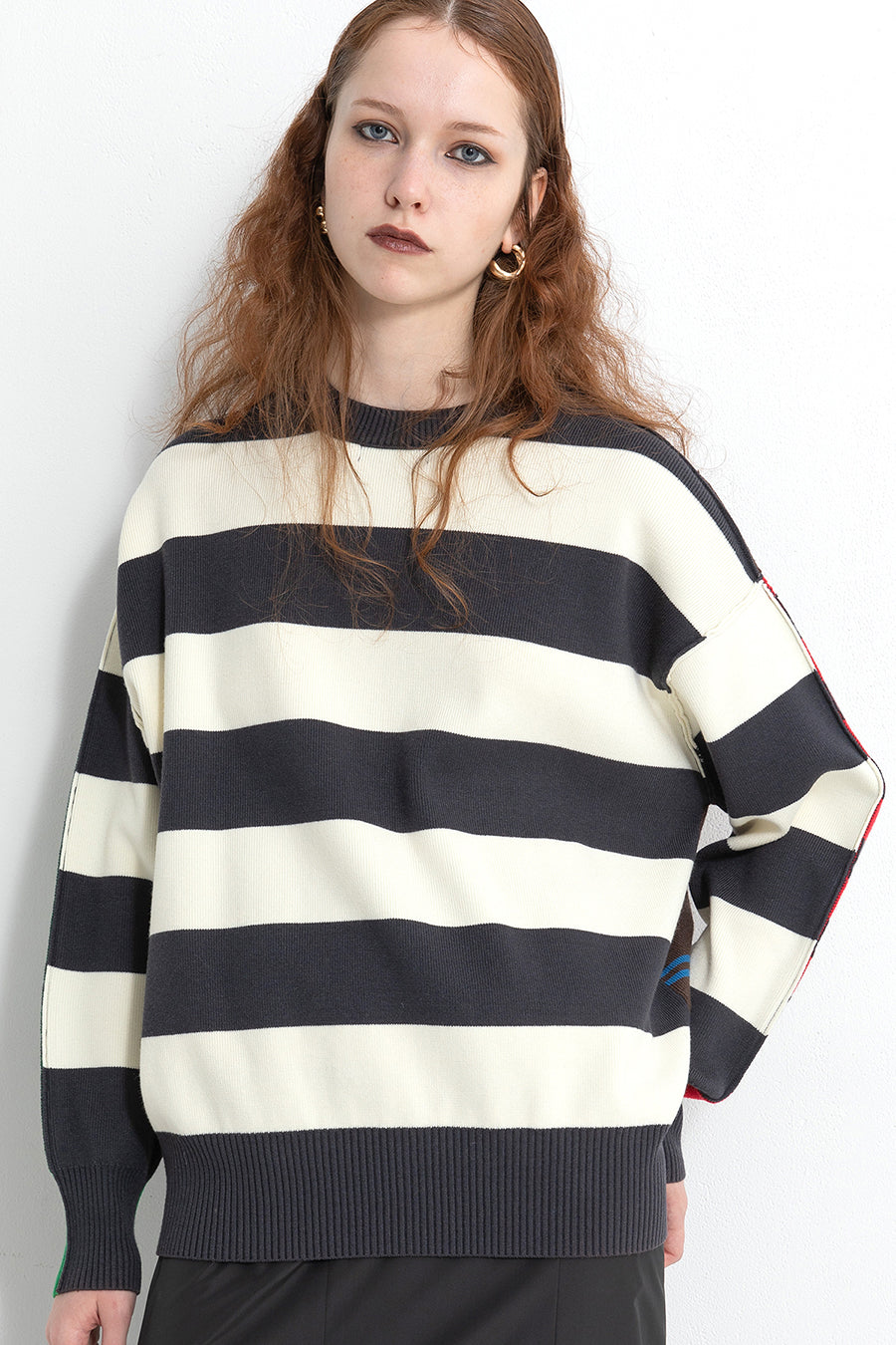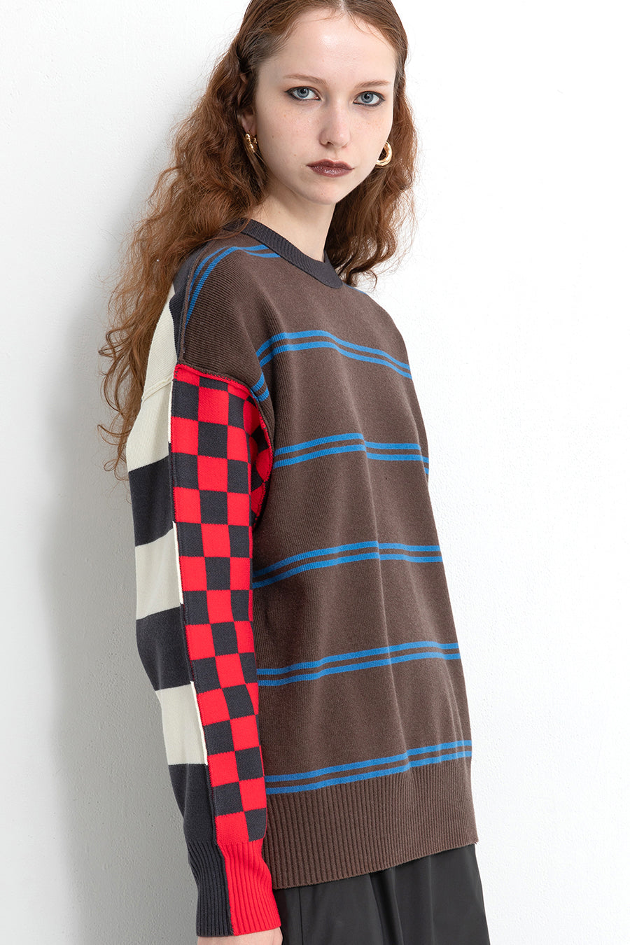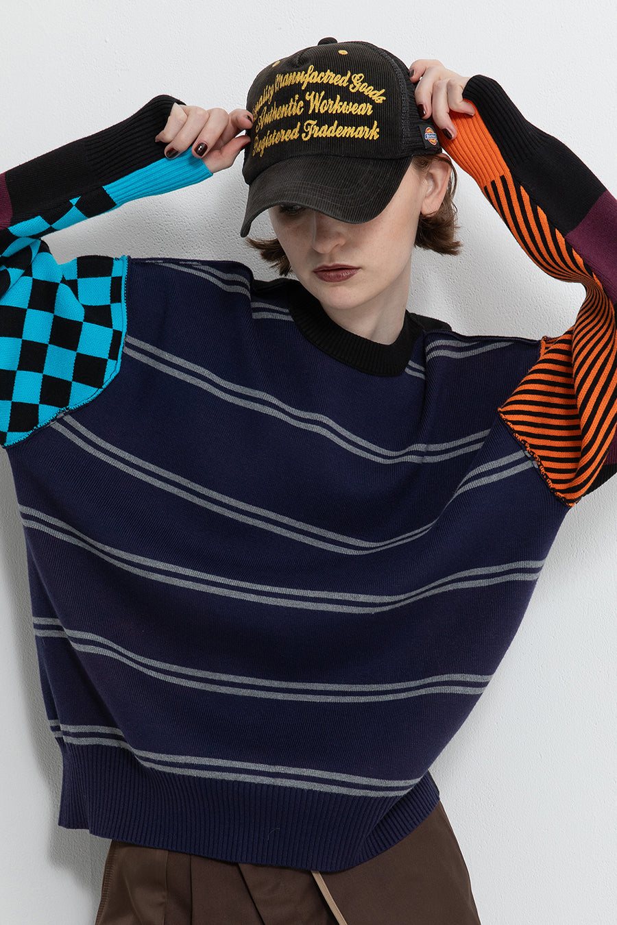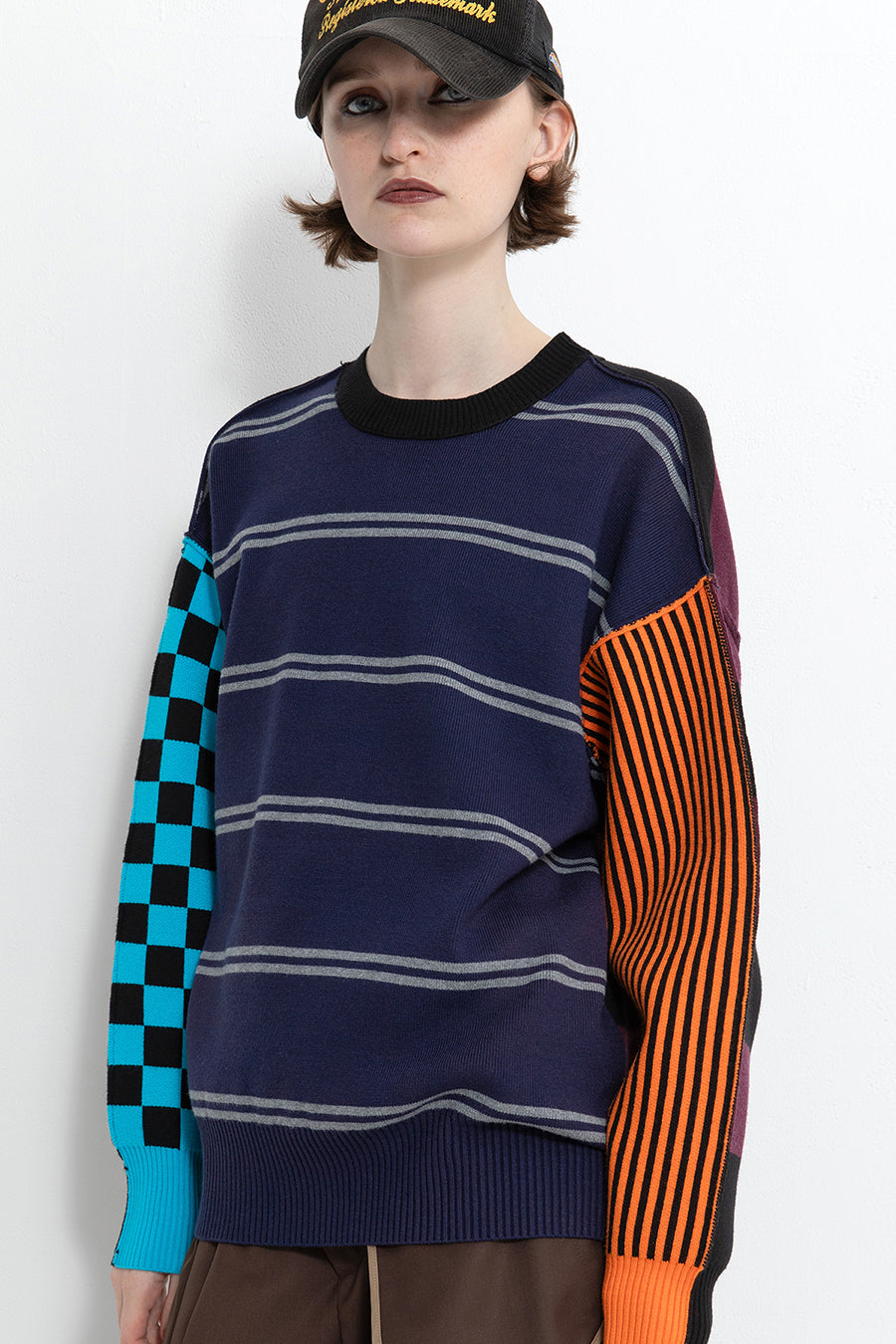 身頃の前後が違う太ボーダーで、袖は右がブロックチェック、左はストライプの4種類の柄をコンビネーションし、更に配色も6色と多様したマルチボーダーカラーニット。ポップなマルチカラーが、遊びのあるアイテムで、他にはないデザインが目を惹く。リンキングの糸端は敢えて表に出して抜け感のある雰囲気に仕上げている。レーヨン、ポリエステル、ナイロンの混紡糸の12Gゴム編みで、もちもちした肌触りは、心地良く人気な実績のある糸を使用。キックバックも良く、型崩れしにくい。
