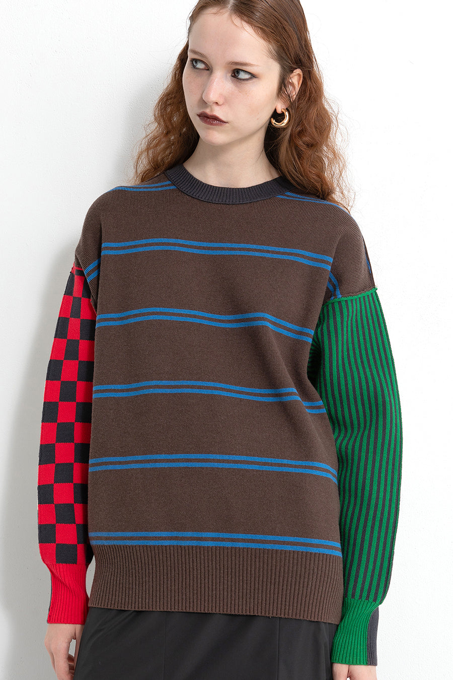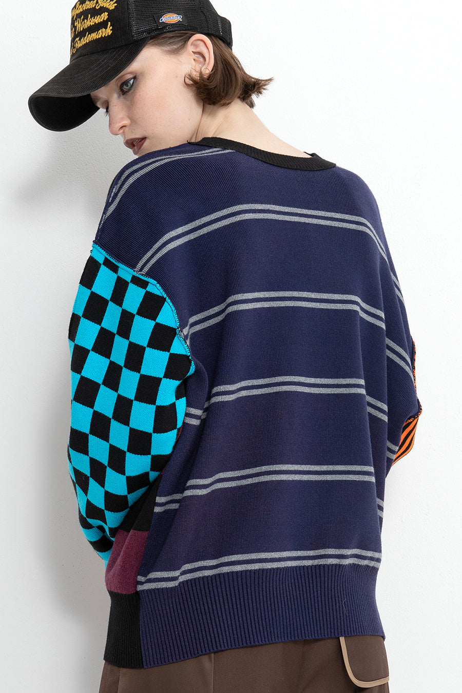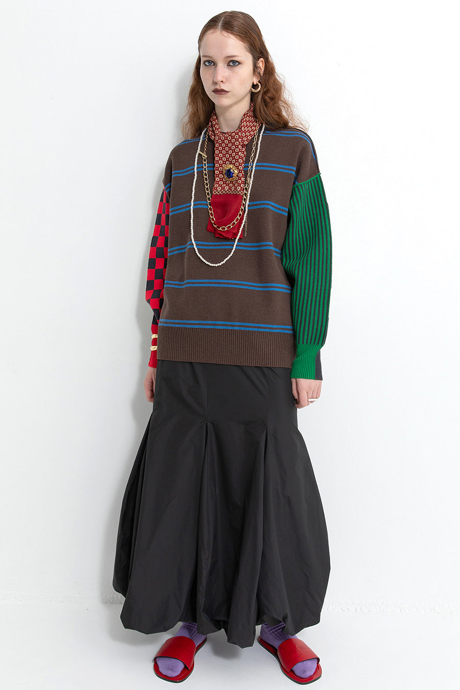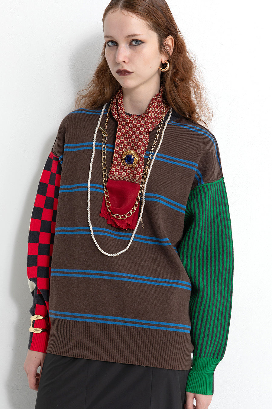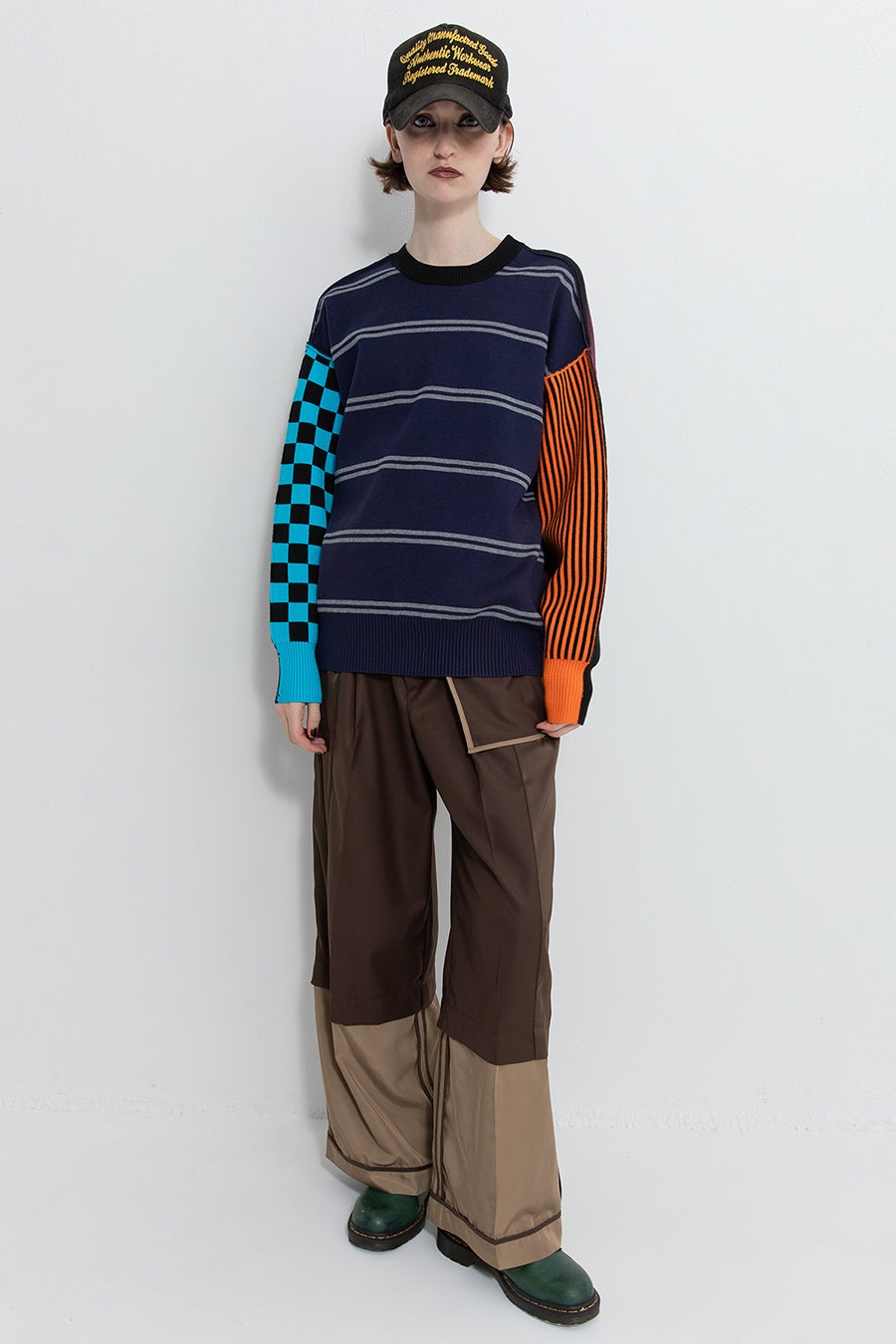 身頃の前後が違う太ボーダーで、袖は右がブロックチェック、左はストライプの4種類の柄をコンビネーションし、更に配色も6色と多様したマルチボーダーカラーニット。ポップなマルチカラーが、遊びのあるアイテムで、他にはないデザインが目を惹く。リンキングの糸端は敢えて表に出して抜け感のある雰囲気に仕上げている。レーヨン、ポリエステル、ナイロンの混紡糸の12Gゴム編みで、もちもちした肌触りは、心地良く人気な実績のある糸を使用。キックバックも良く、型崩れしにくい。