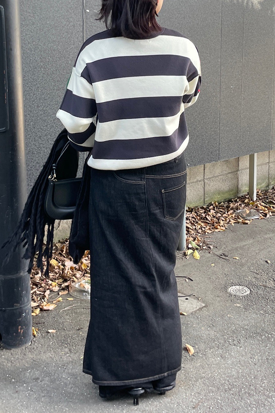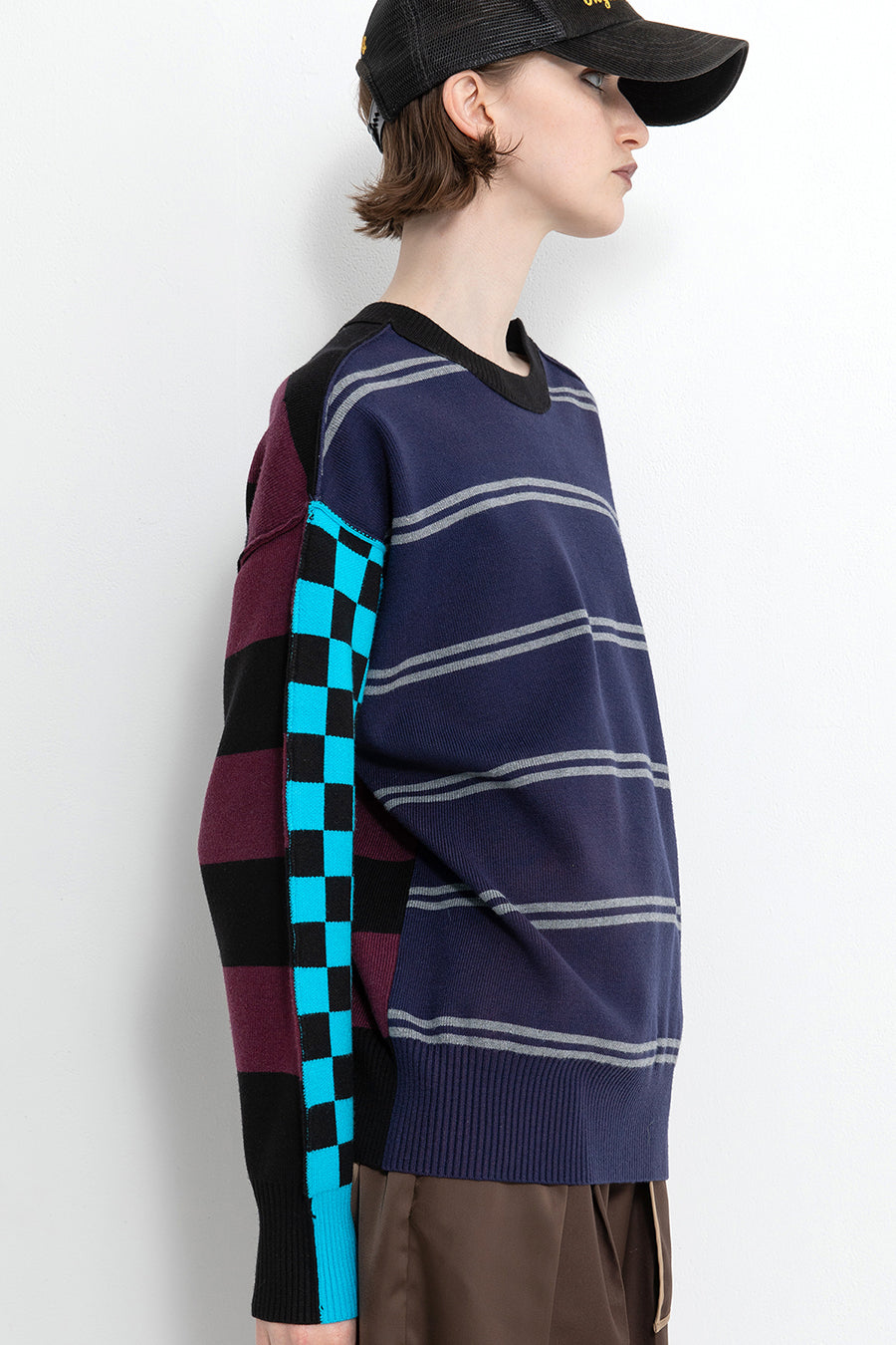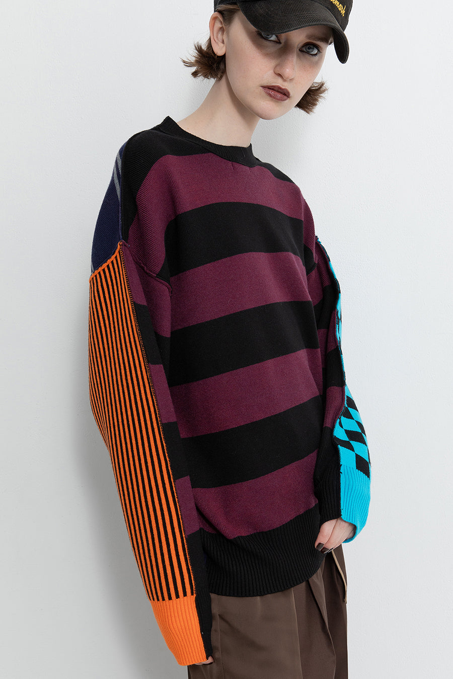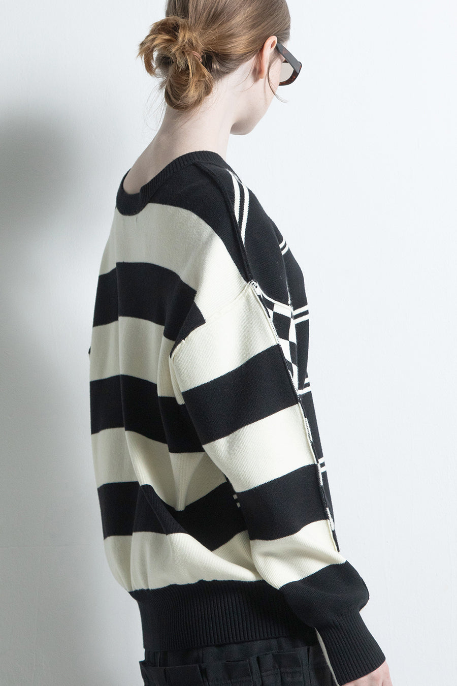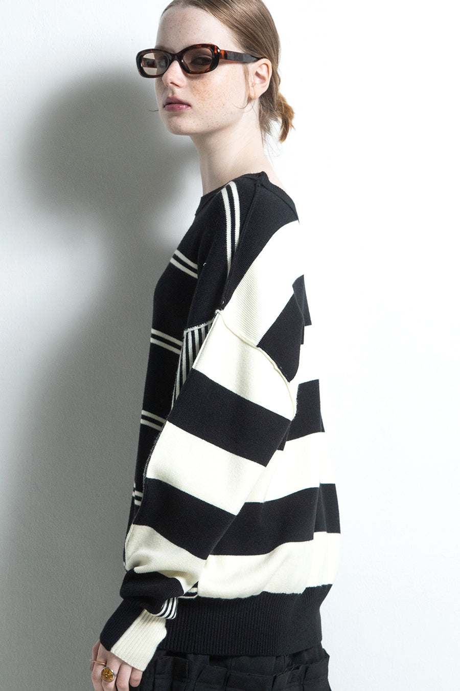 身頃の前後が違う太ボーダーで、袖は右がブロックチェック、左はストライプの4種類の柄をコンビネーションし、更に配色も6色と多様したマルチボーダーカラーニット。ポップなマルチカラーが、遊びのあるアイテムで、他にはないデザインが目を惹く。リンキングの糸端は敢えて表に出して抜け感のある雰囲気に仕上げている。レーヨン、ポリエステル、ナイロンの混紡糸の12Gゴム編みで、もちもちした肌触りは、心地良く人気な実績のある糸を使用。キックバックも良く、型崩れしにくい。