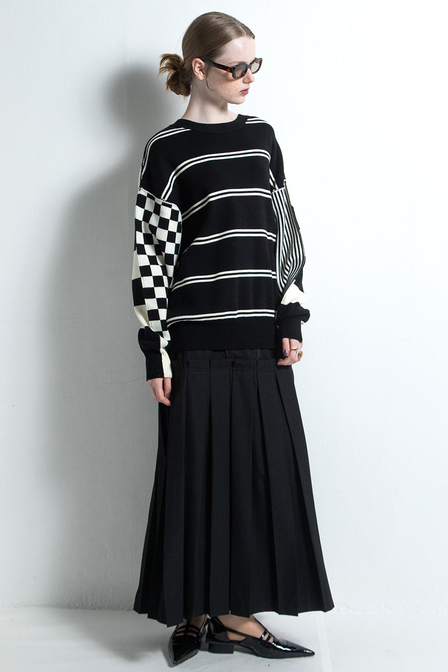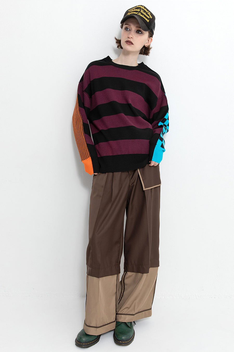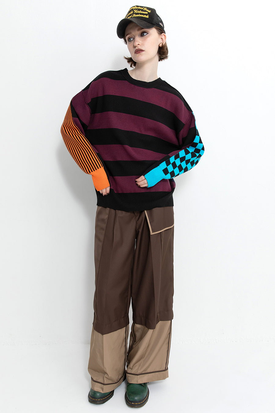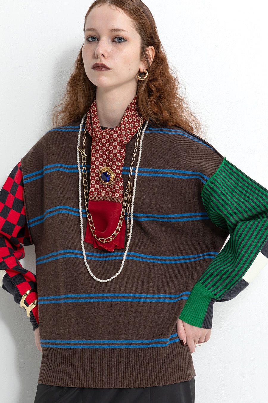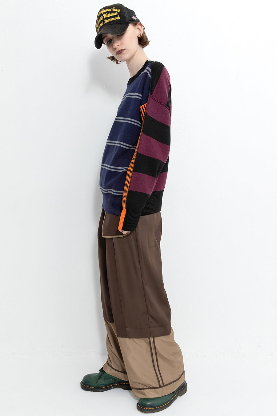 身頃の前後が違う太ボーダーで、袖は右がブロックチェック、左はストライプの4種類の柄をコンビネーションし、更に配色も6色と多様したマルチボーダーカラーニット。ポップなマルチカラーが、遊びのあるアイテムで、他にはないデザインが目を惹く。リンキングの糸端は敢えて表に出して抜け感のある雰囲気に仕上げている。レーヨン、ポリエステル、ナイロンの混紡糸の12Gゴム編みで、もちもちした肌触りは、心地良く人気な実績のある糸を使用。キックバックも良く、型崩れしにくい。