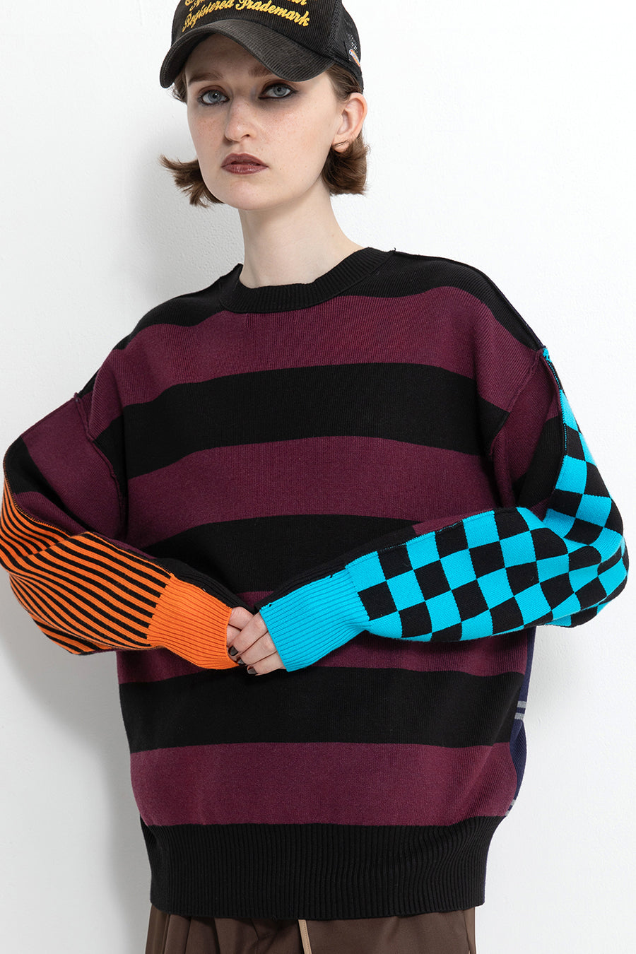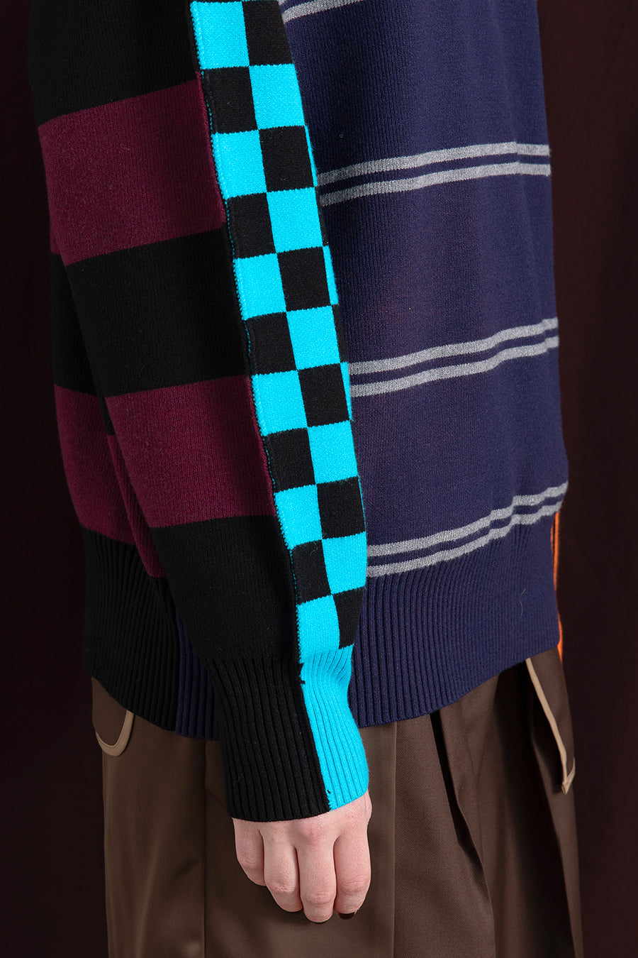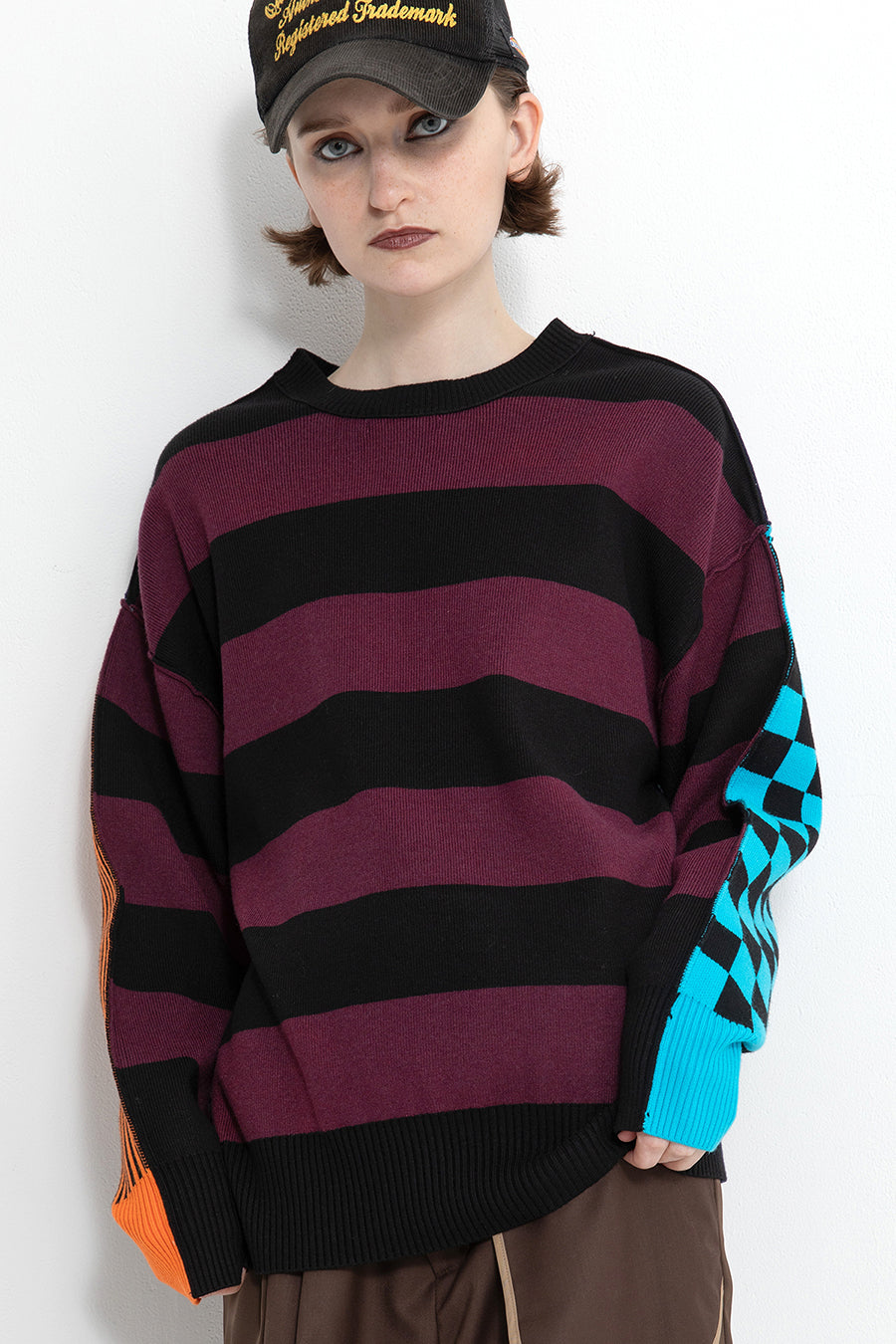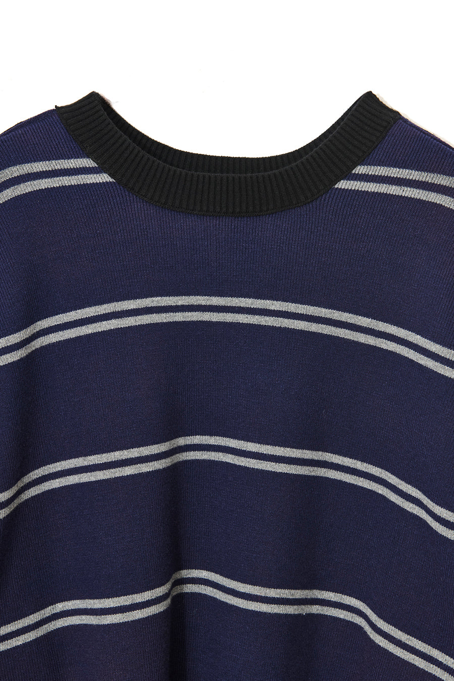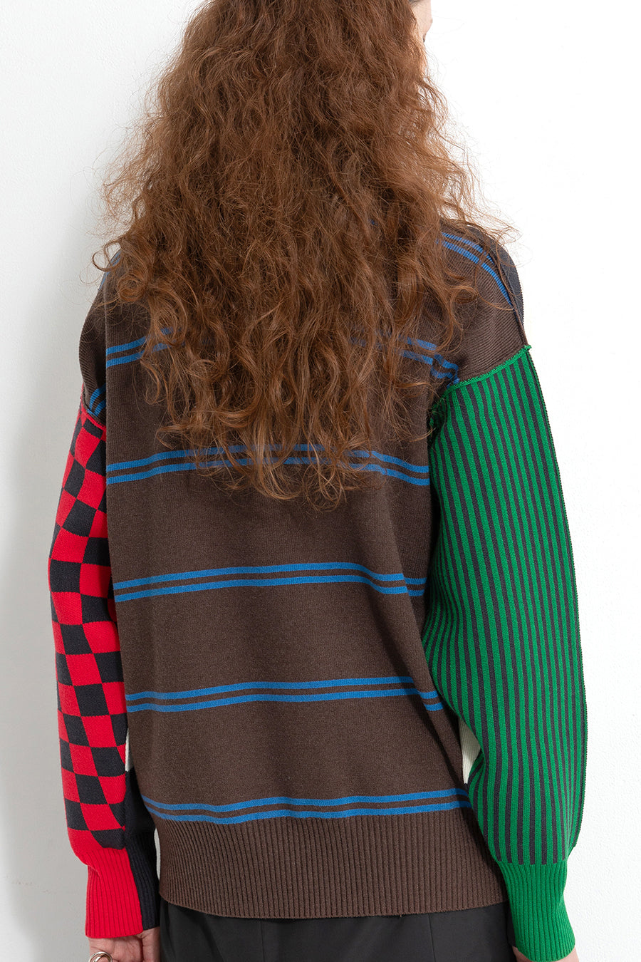 身頃の前後が違う太ボーダーで、袖は右がブロックチェック、左はストライプの4種類の柄をコンビネーションし、更に配色も6色と多様したマルチボーダーカラーニット。ポップなマルチカラーが、遊びのあるアイテムで、他にはないデザインが目を惹く。リンキングの糸端は敢えて表に出して抜け感のある雰囲気に仕上げている。レーヨン、ポリエステル、ナイロンの混紡糸の12Gゴム編みで、もちもちした肌触りは、心地良く人気な実績のある糸を使用。キックバックも良く、型崩れしにくい。