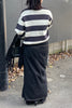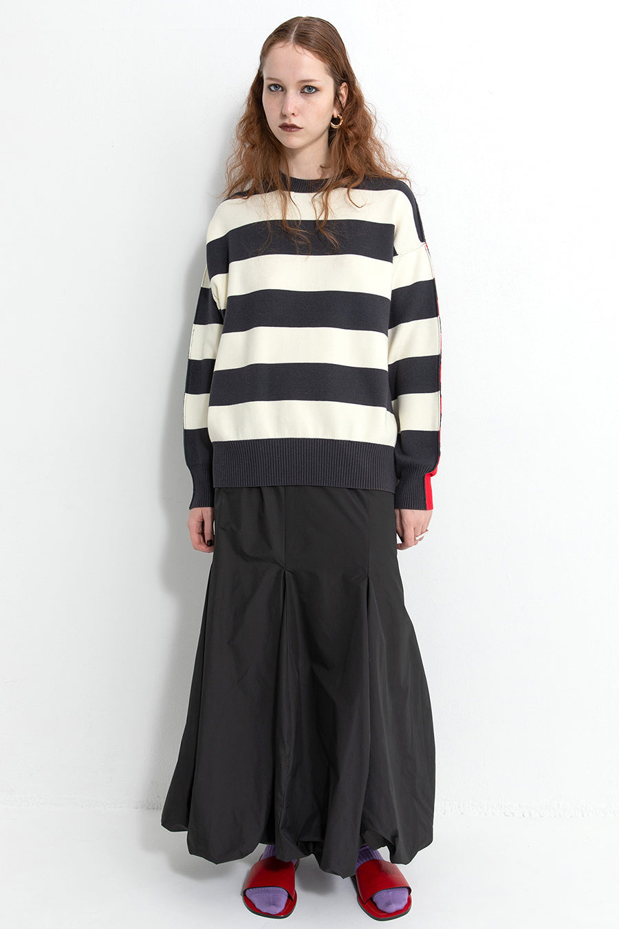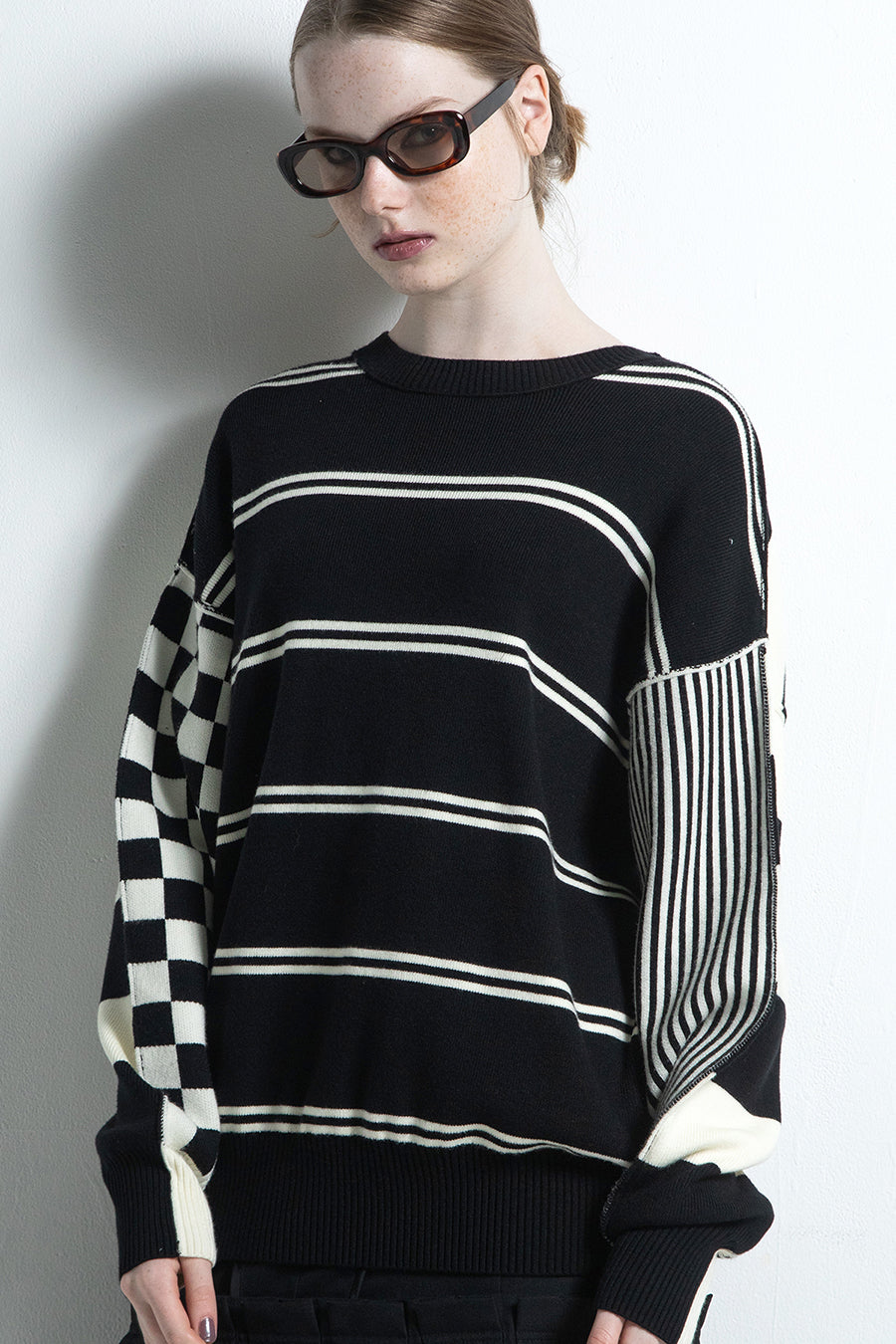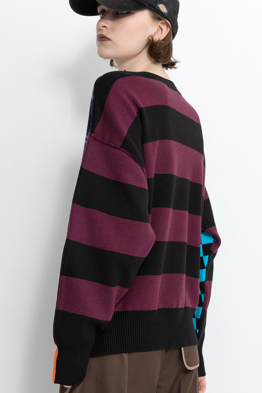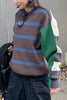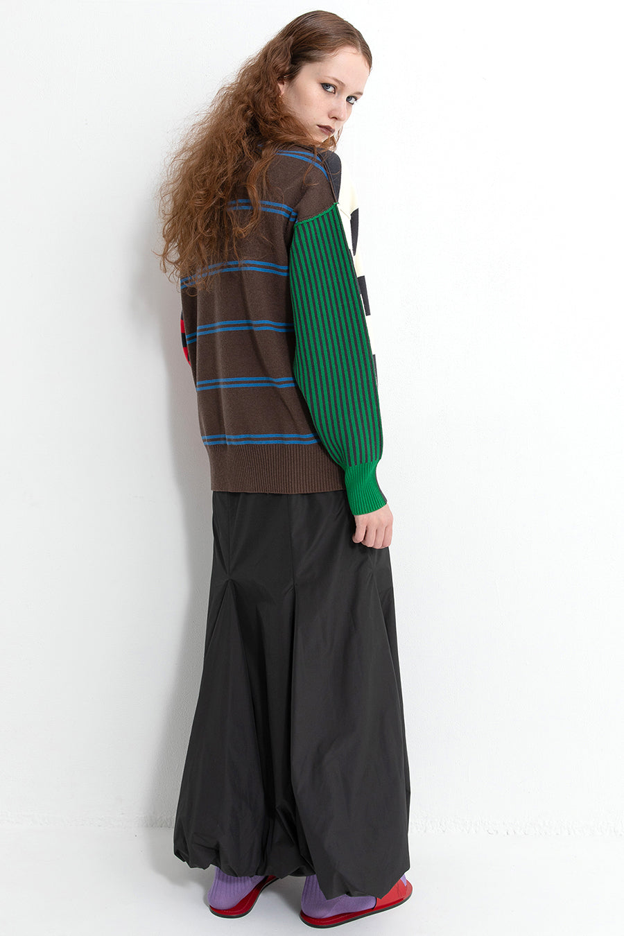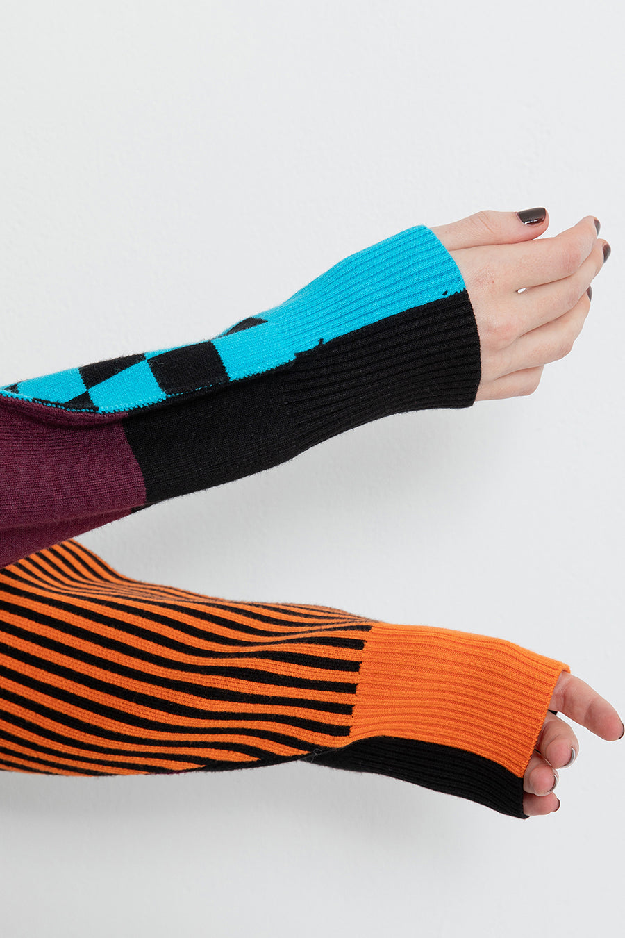 身頃の前後が違う太ボーダーで、袖は右がブロックチェック、左はストライプの4種類の柄をコンビネーションし、更に配色も6色と多様したマルチボーダーカラーニット。ポップなマルチカラーが、遊びのあるアイテムで、他にはないデザインが目を惹く。リンキングの糸端は敢えて表に出して抜け感のある雰囲気に仕上げている。レーヨン、ポリエステル、ナイロンの混紡糸の12Gゴム編みで、もちもちした肌触りは、心地良く人気な実績のある糸を使用。キックバックも良く、型崩れしにくい。