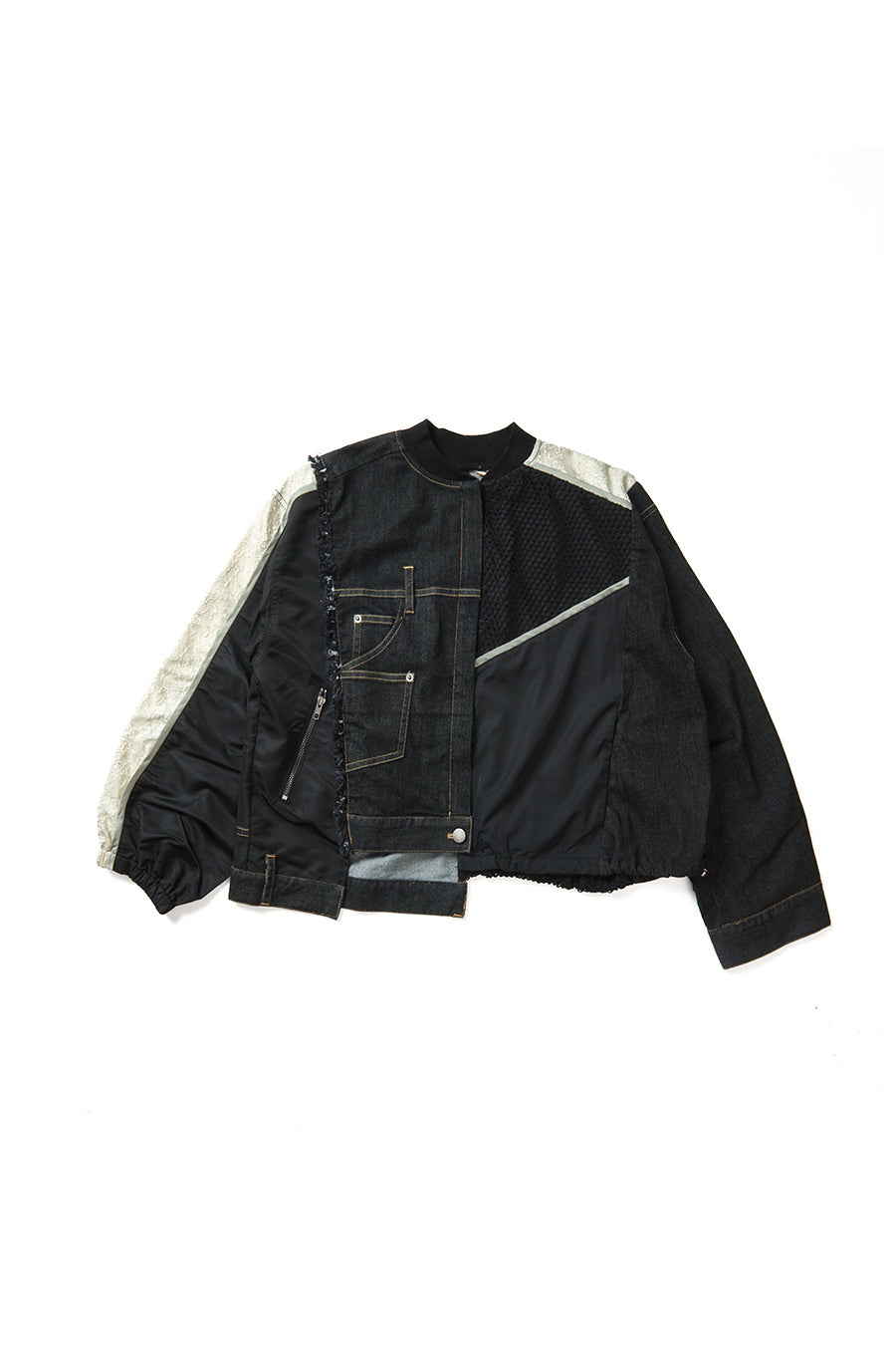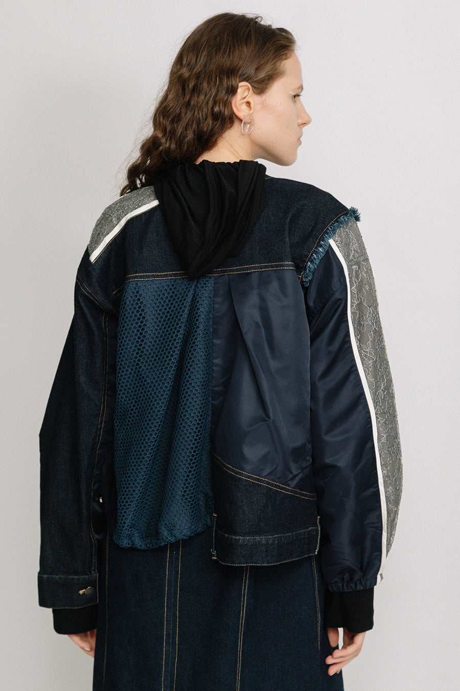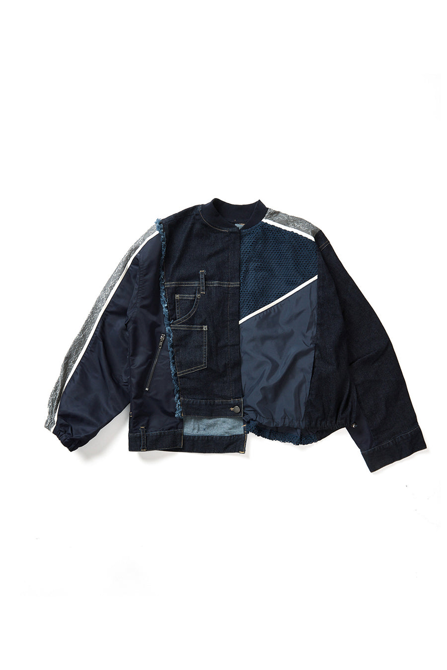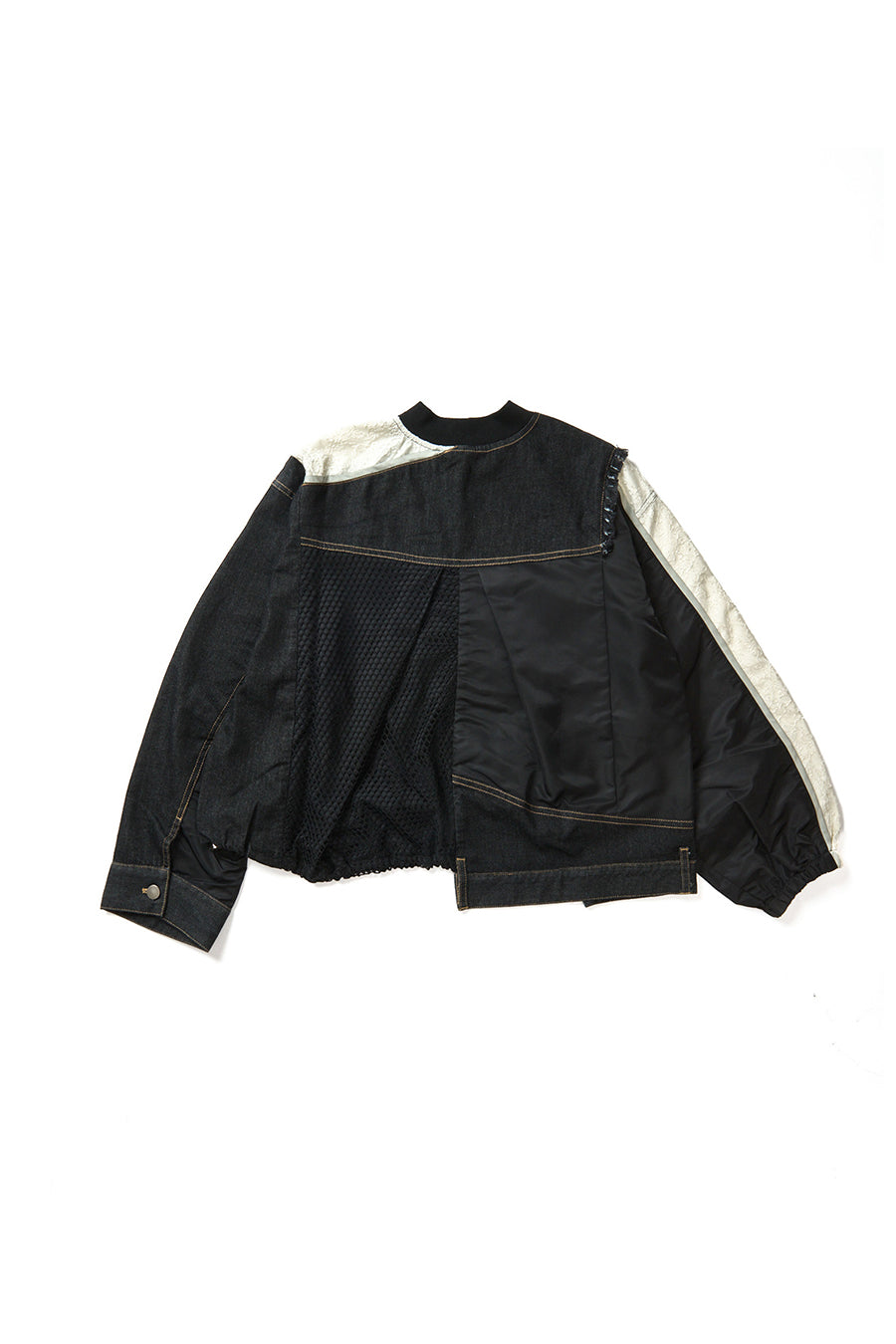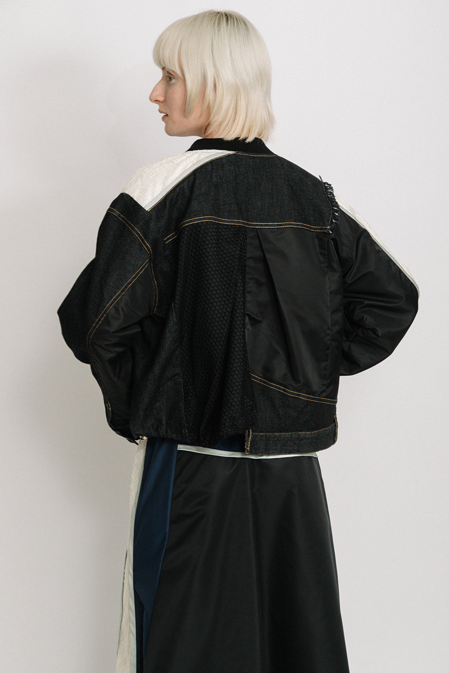 デニム、コットンポリエステルツイル、2色のタフタ、メッシュ、レース、サテン、ナイロンツイルの7種類の素材を使用し、32パーツに切り替えたマルチデザインの春アウター。