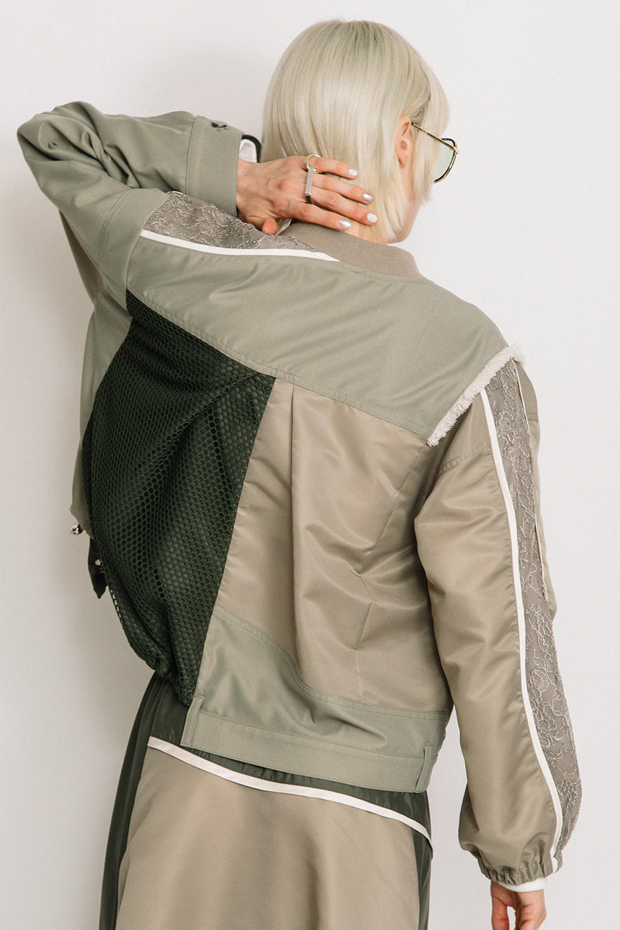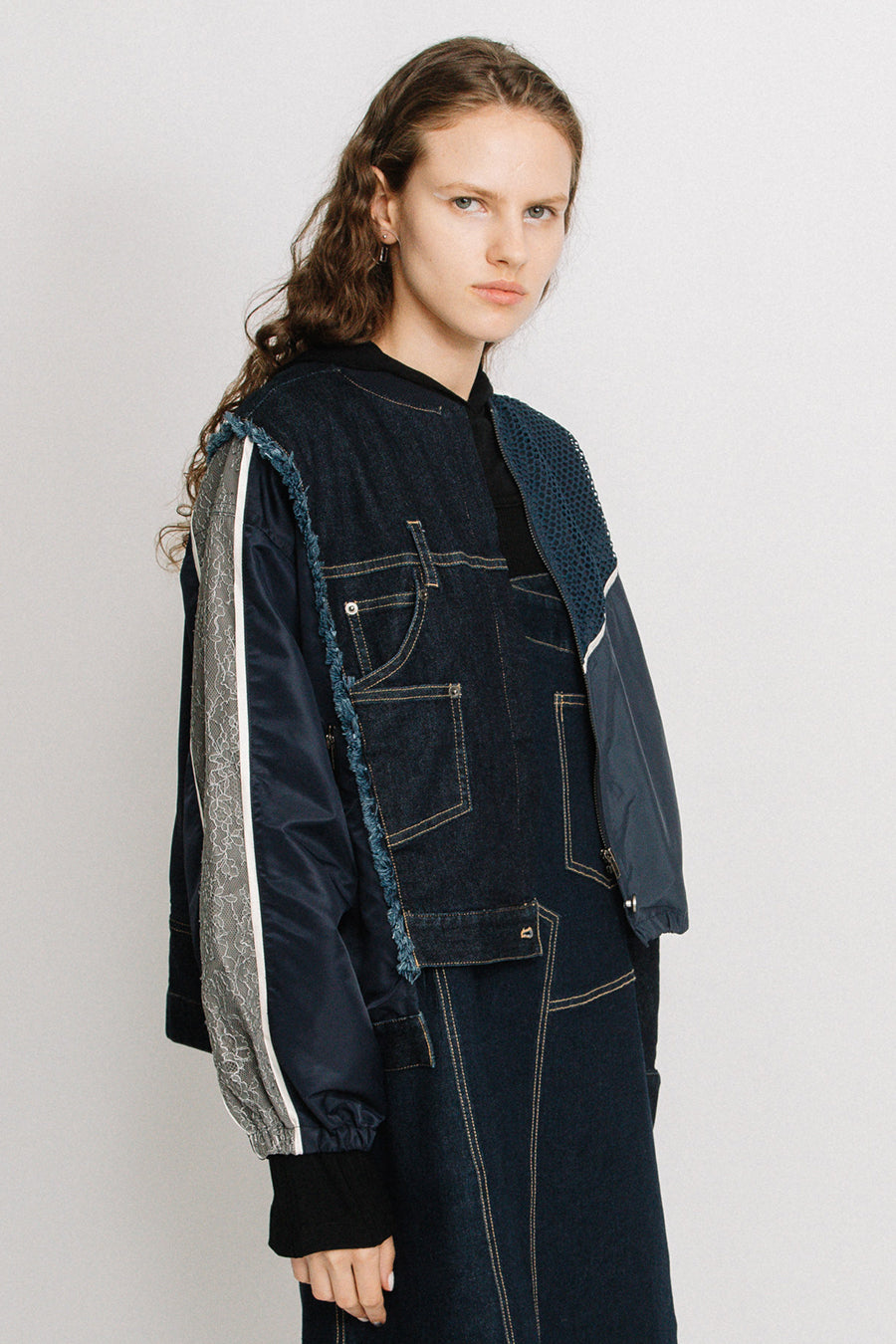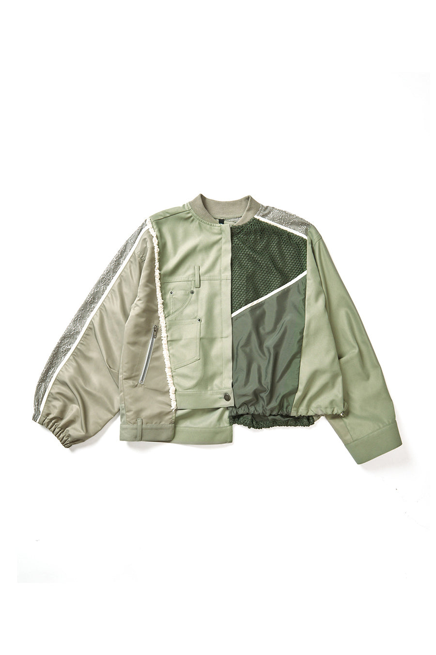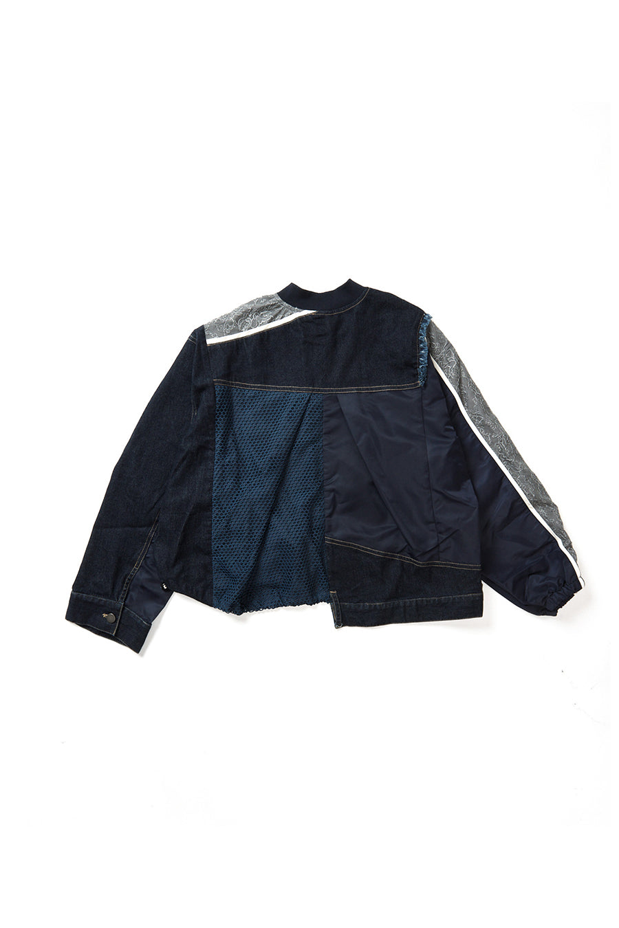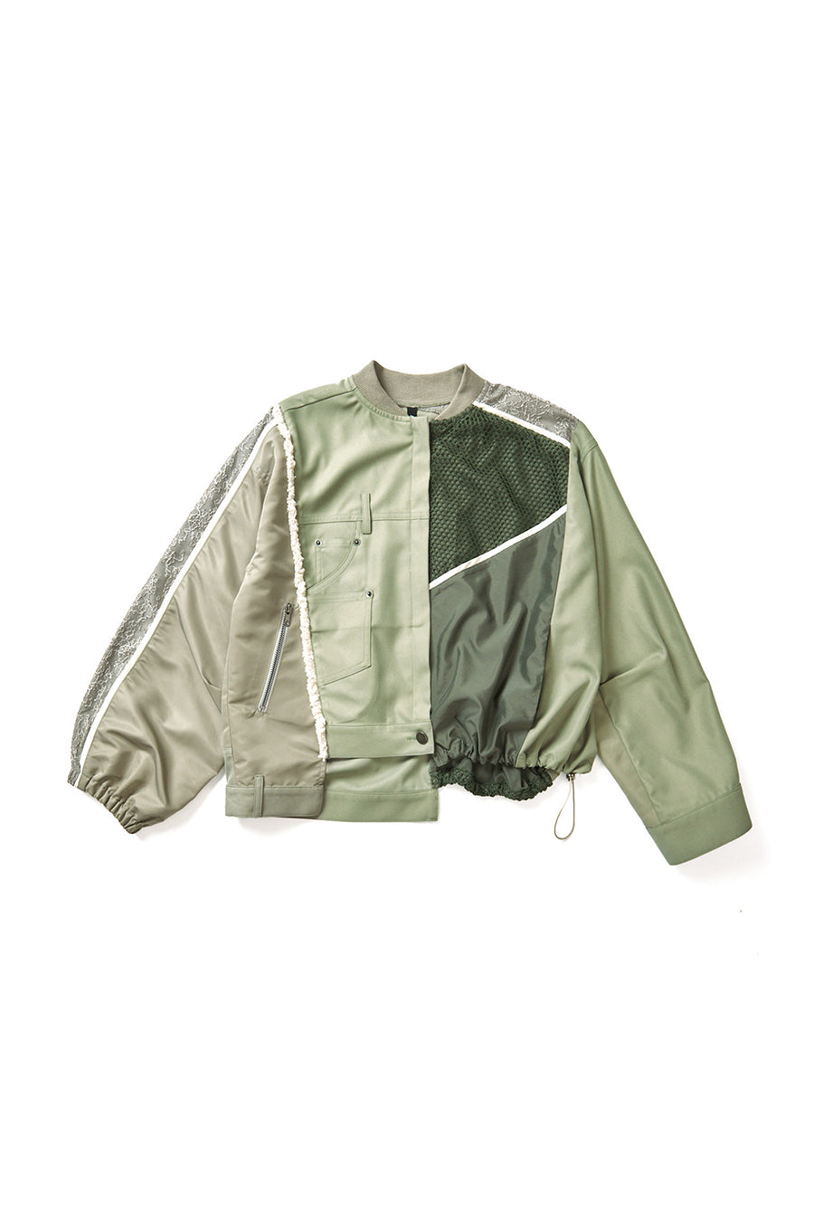 デニム、コットンポリエステルツイル、2色のタフタ、メッシュ、レース、サテン、ナイロンツイルの7種類の素材を使用し、32パーツに切り替えたマルチデザインの春アウター。