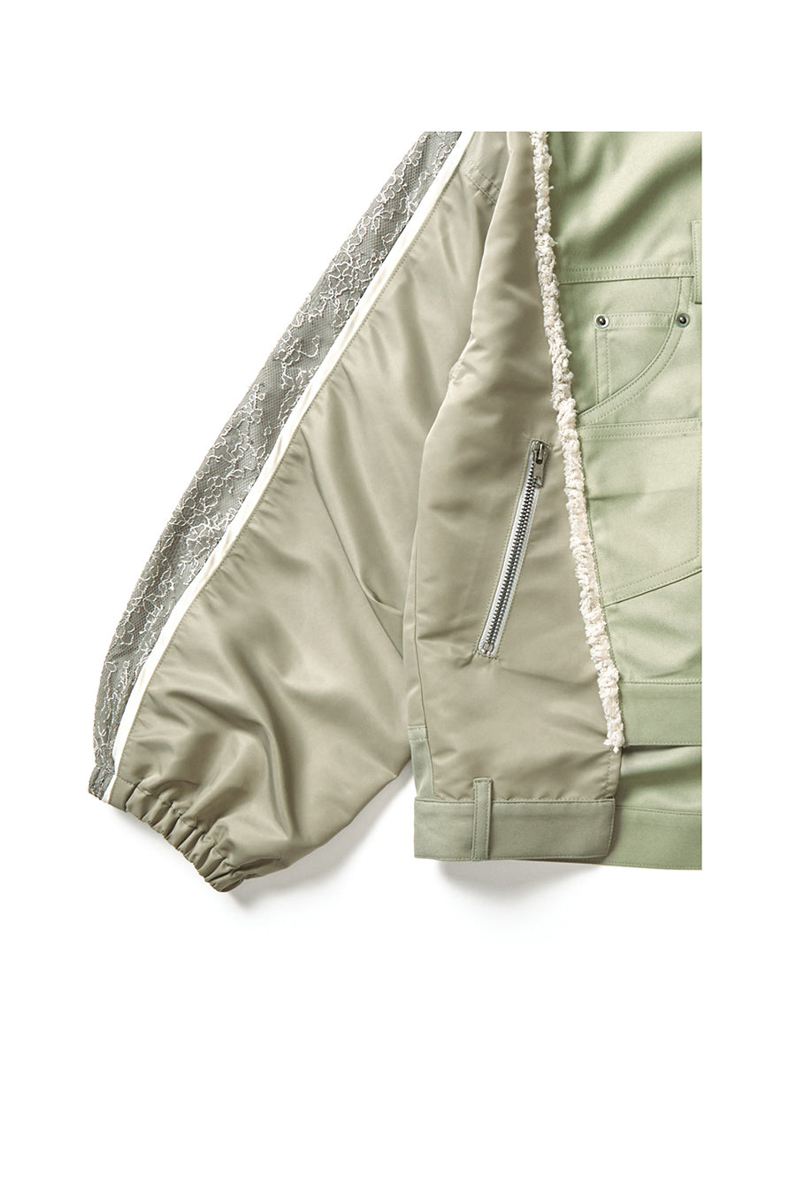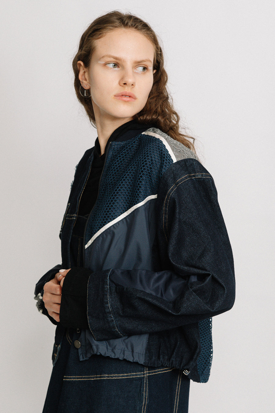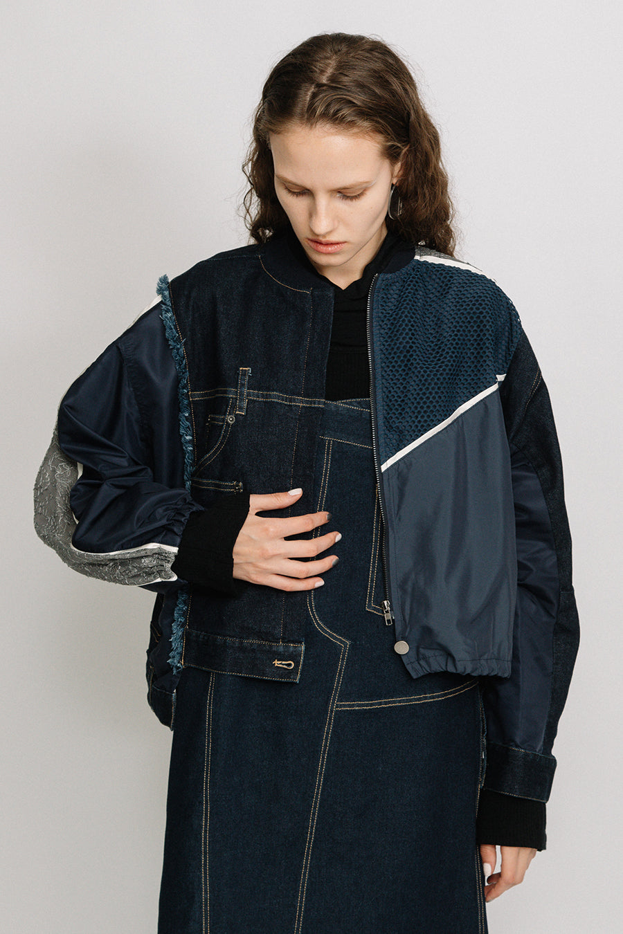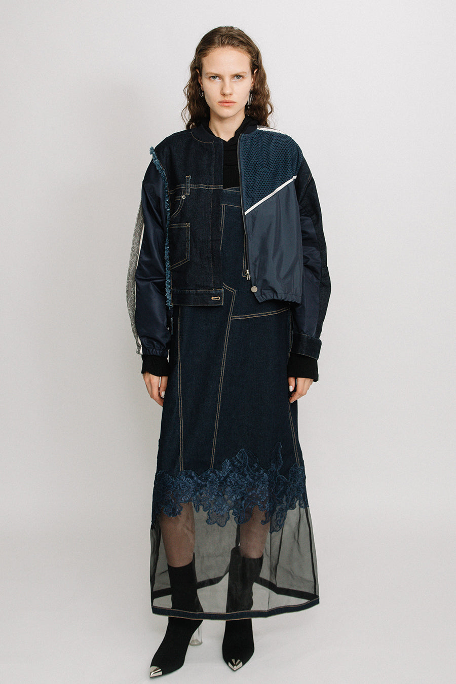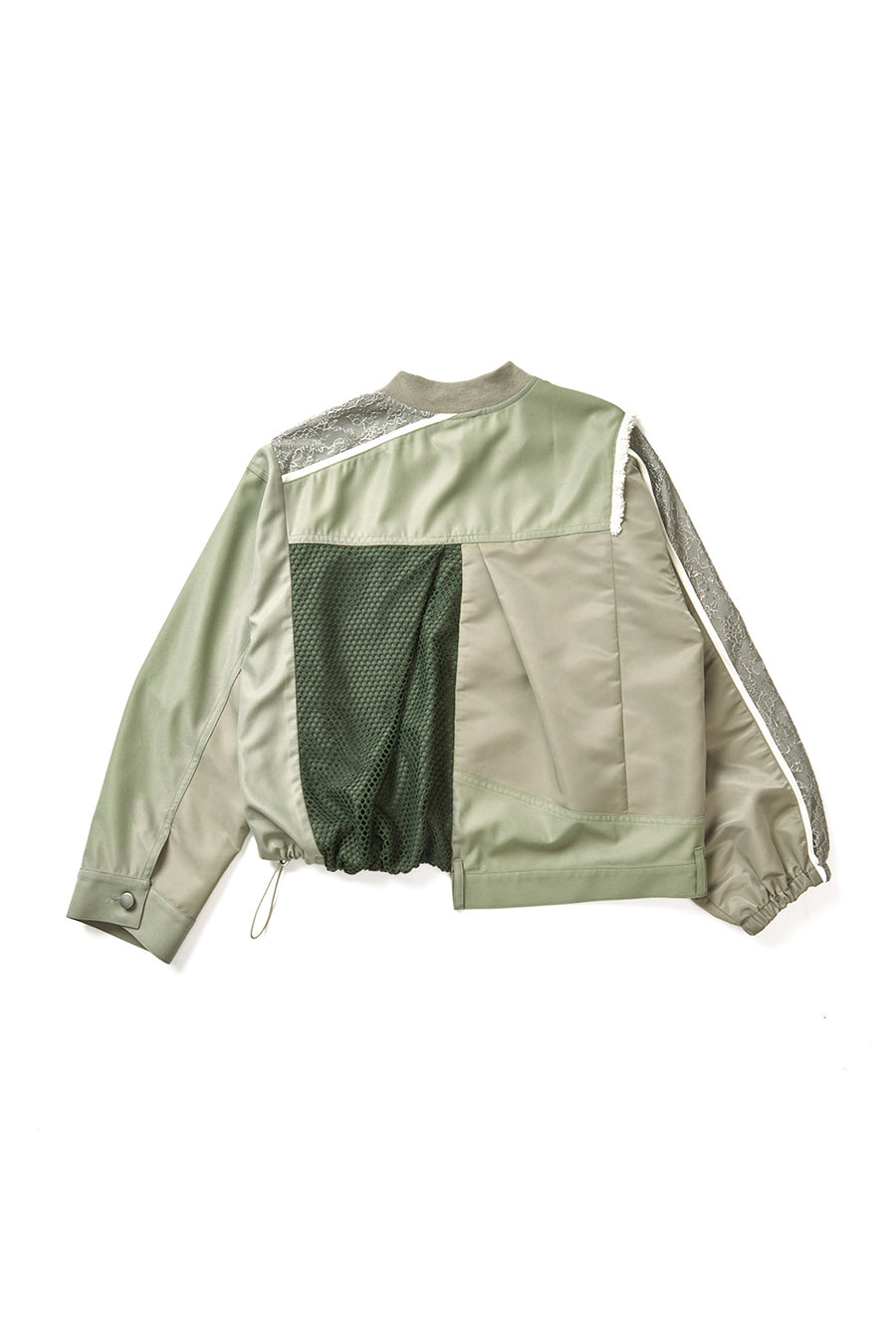 デニム、コットンポリエステルツイル、2色のタフタ、メッシュ、レース、サテン、ナイロンツイルの7種類の素材を使用し、32パーツに切り替えたマルチデザインの春アウター。