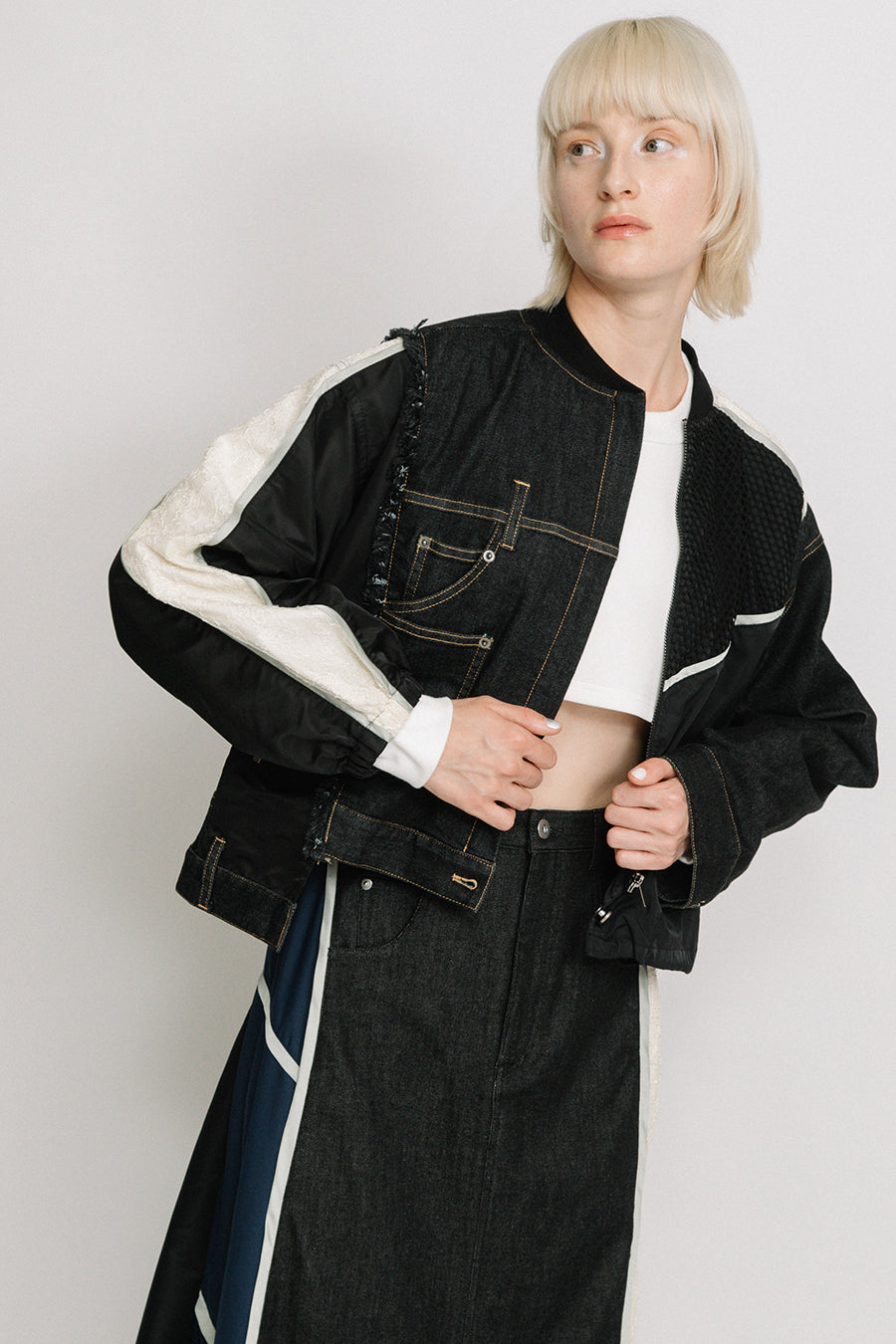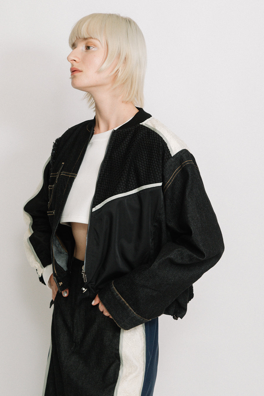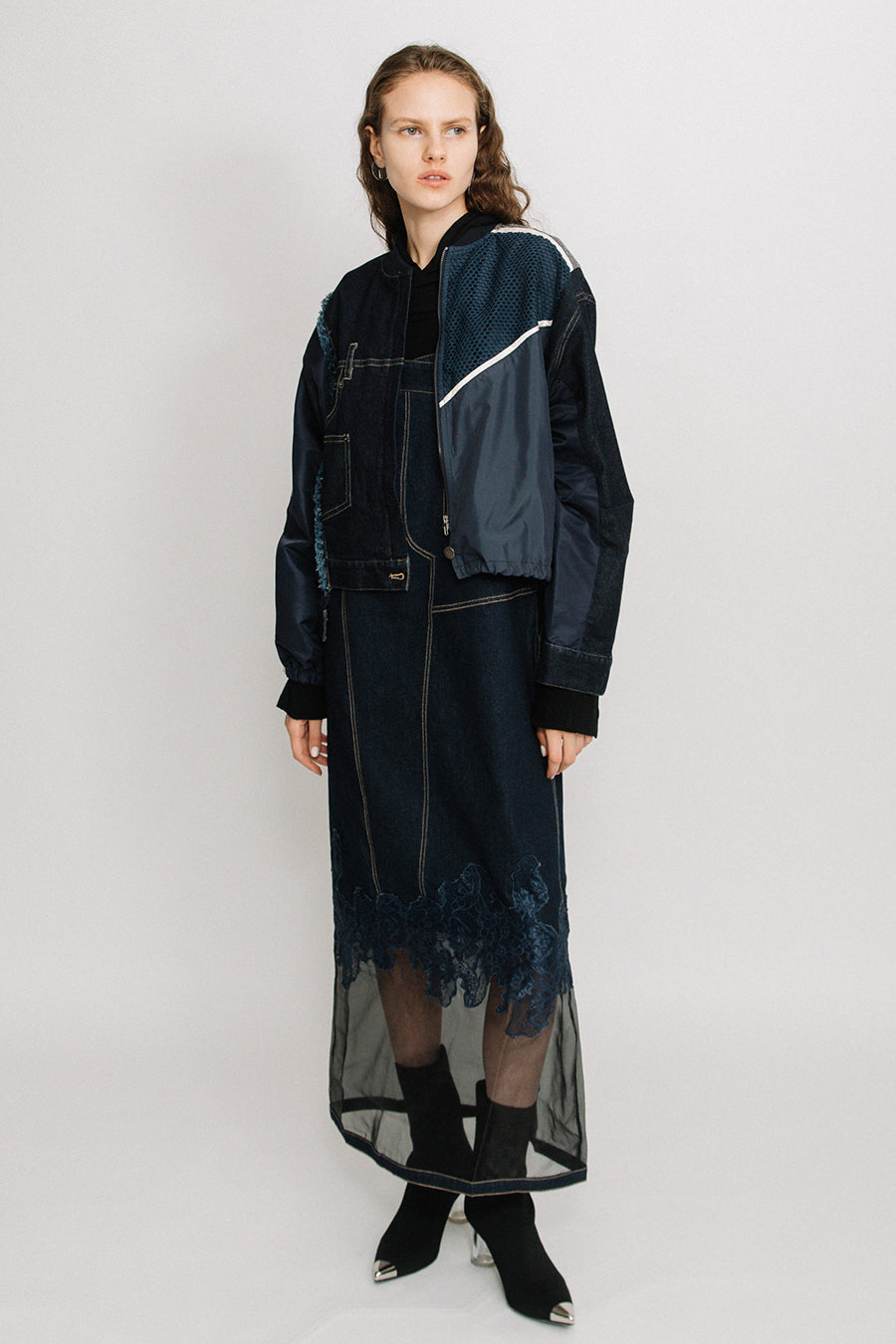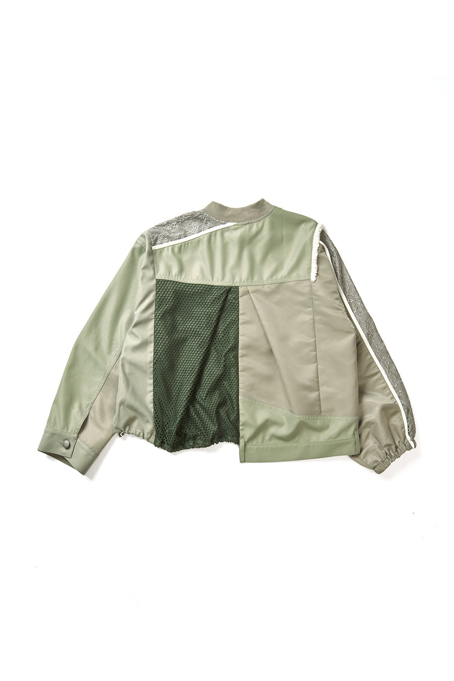 デニム、コットンポリエステルツイル、2色のタフタ、メッシュ、レース、サテン、ナイロンツイルの7種類の素材を使用し、32パーツに切り替えたマルチデザインの春アウター。